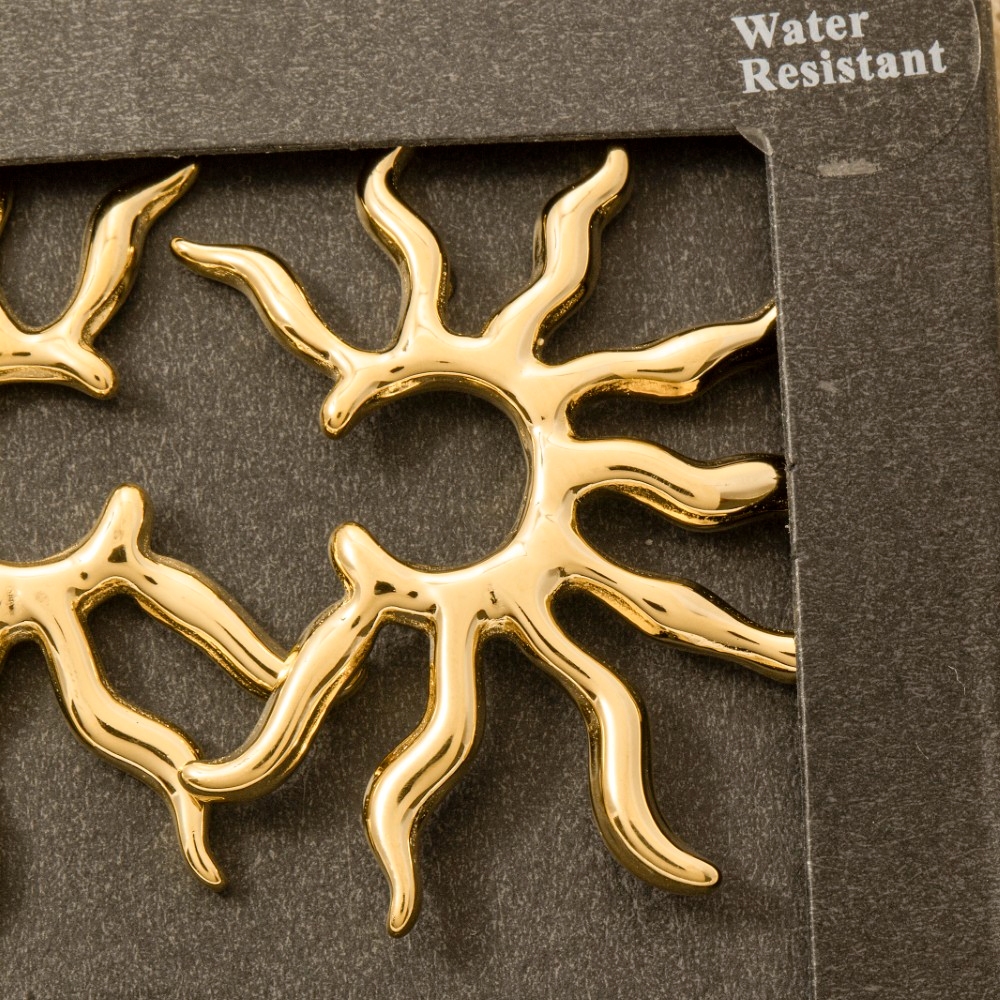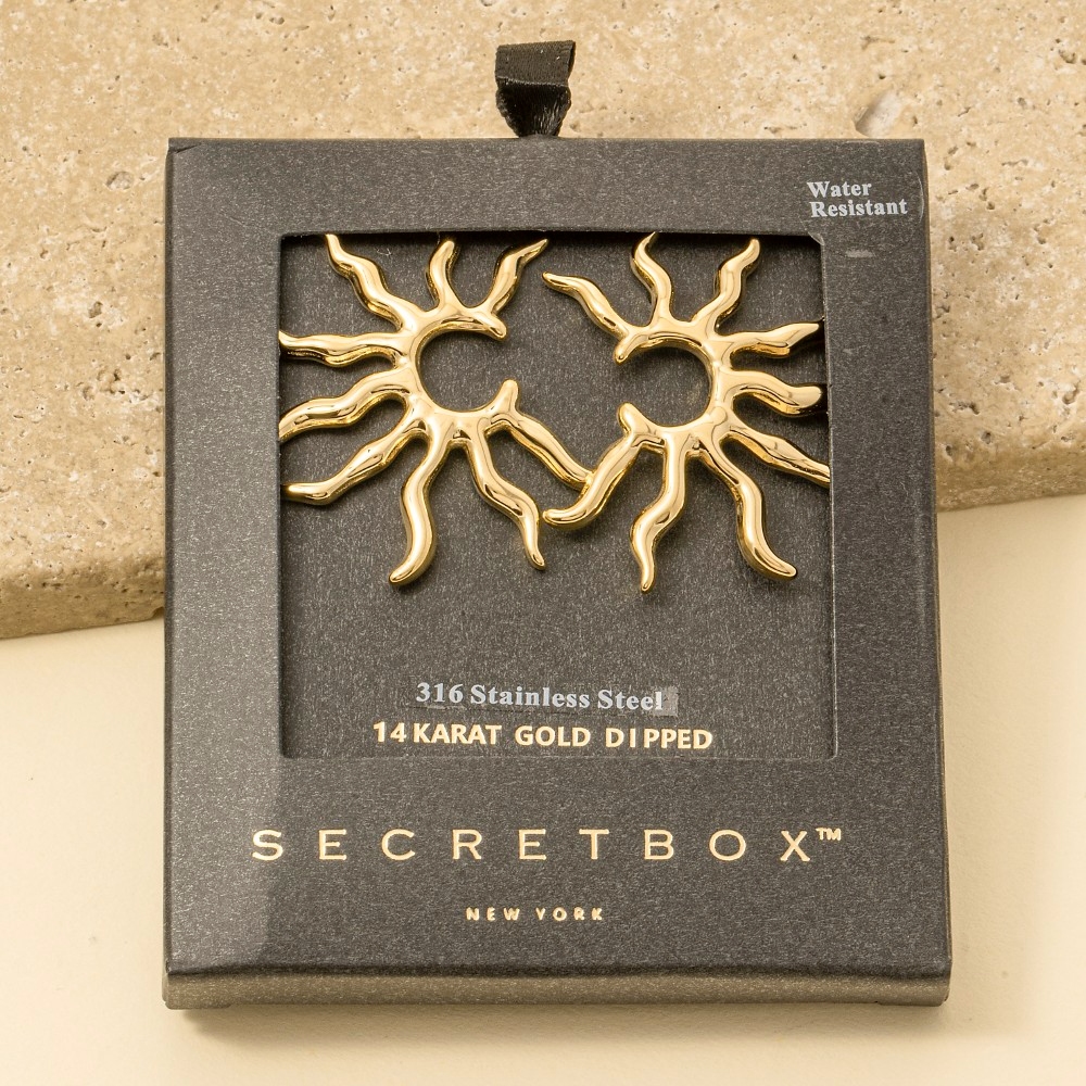 • Perfect for any fashion-forward individual, this pair of stud earrings evokes a captivating secret box gold dipped stainless steel shining sun design. Infuse a hint of luxury into your daily attire with this versatile pair of stud earrings, a must-have for those who appreciate timeless elegance. Available in GD. This item is sold in packs of 1.