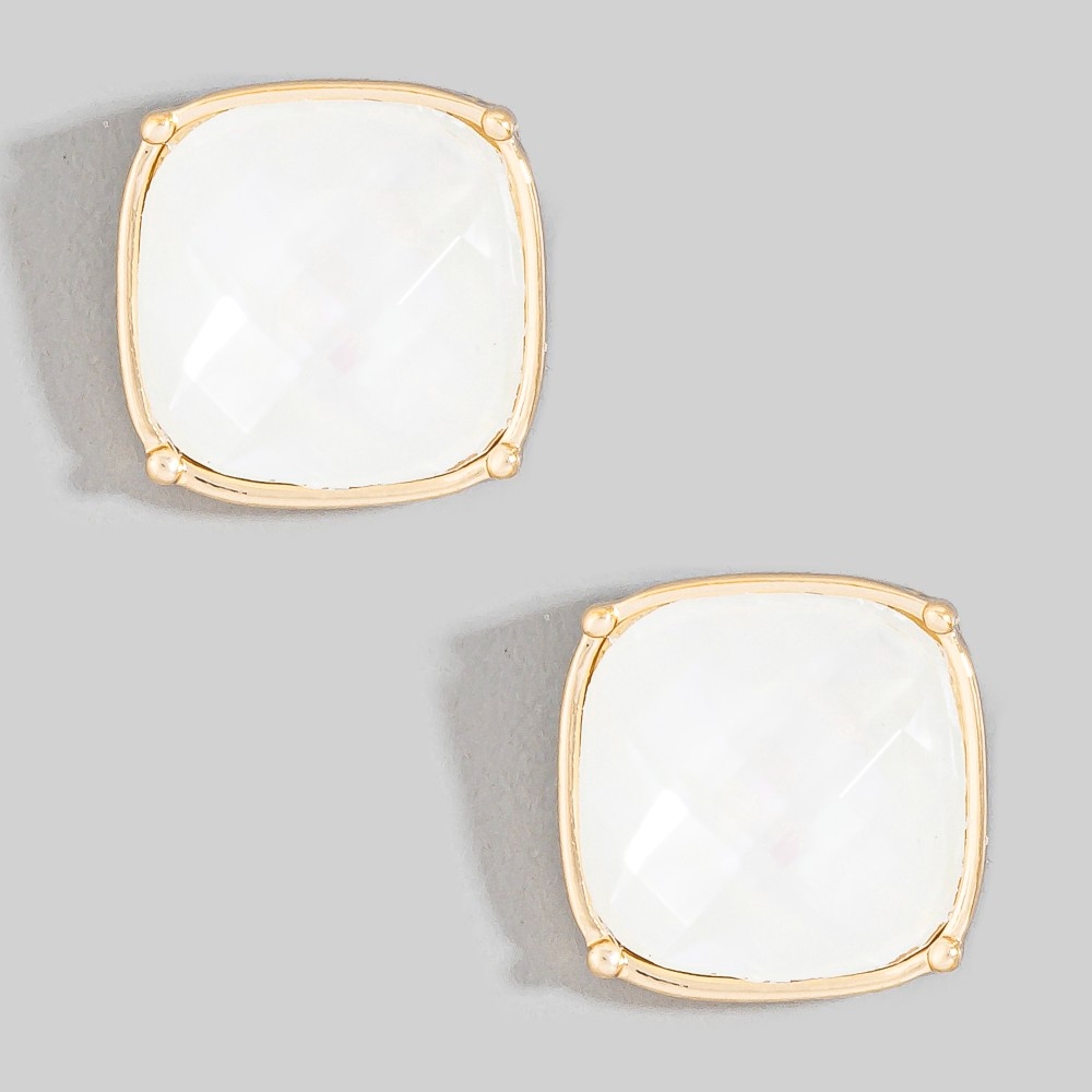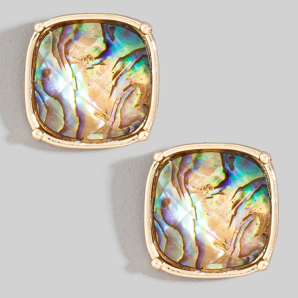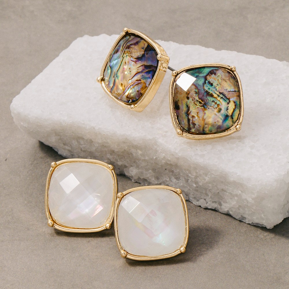 - The epitome of sophistication and style, this pair of stud earrings carries a charming square faceted stone design. This pair of stud earrings is an effortless way to add some personality to your outfit. Available in ABLN, MOP. This item is sold in packs of 1.