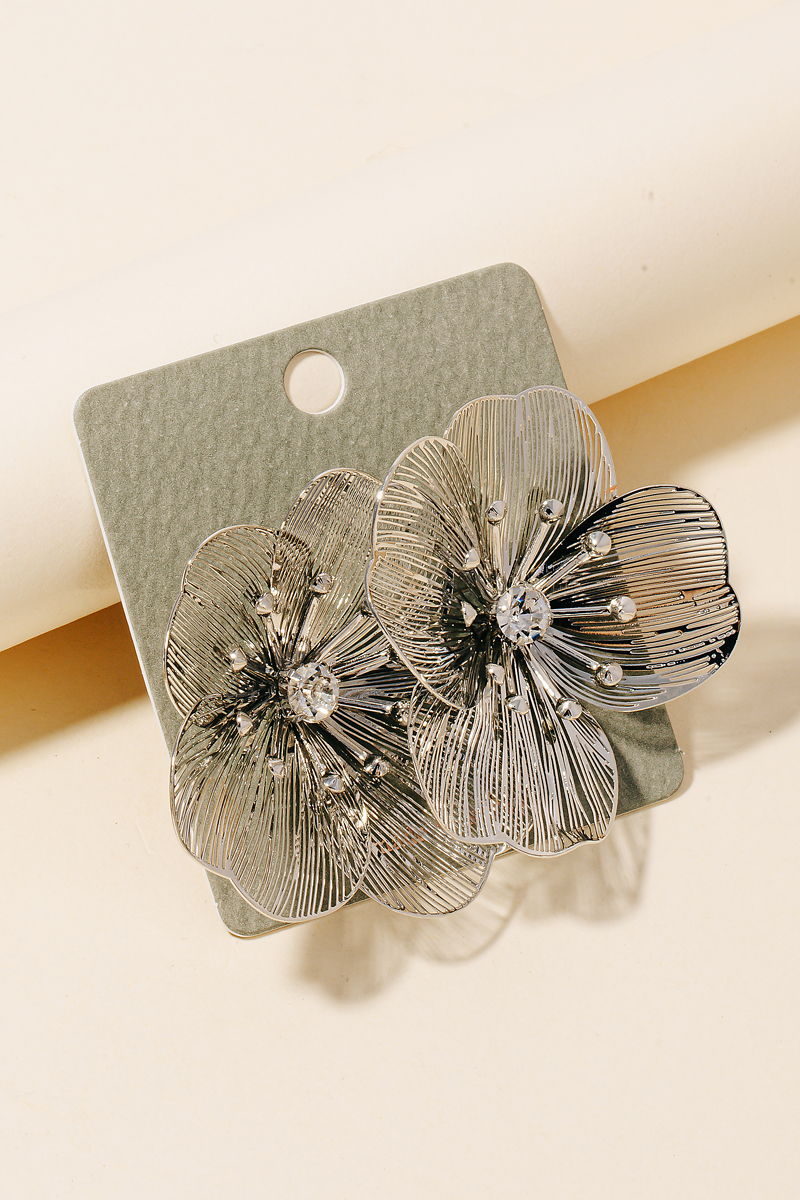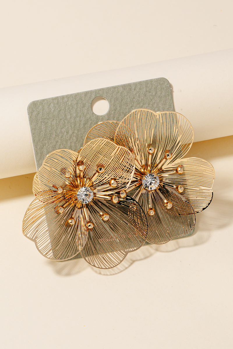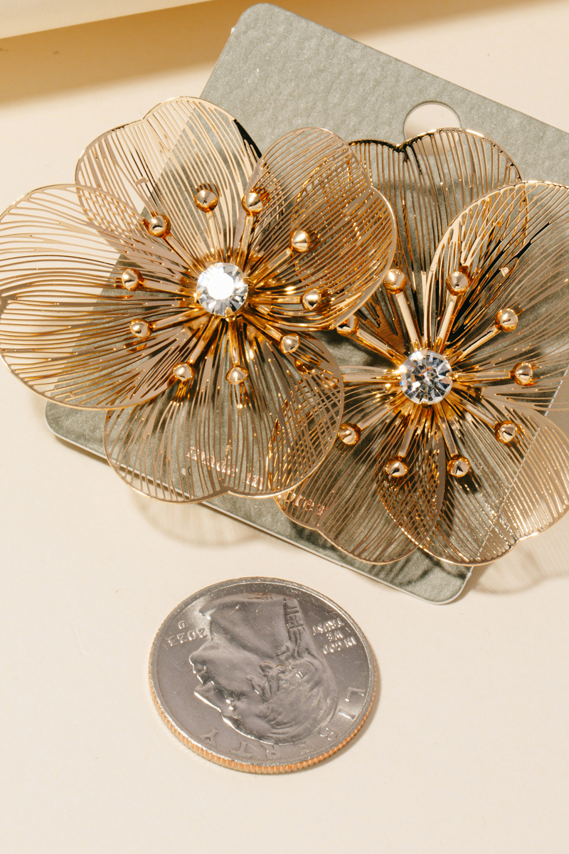This piece is a true showstopper, this pair of stud earrings showcases a breathtaking thin metallic filigree flower design. It also includes a rhinestone studs. A stylish pair of stud earrings that's perfect for complementing your favorite outfit. Available in G. This item is sold in packs of 1.