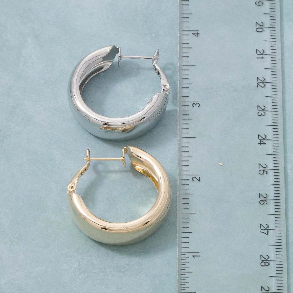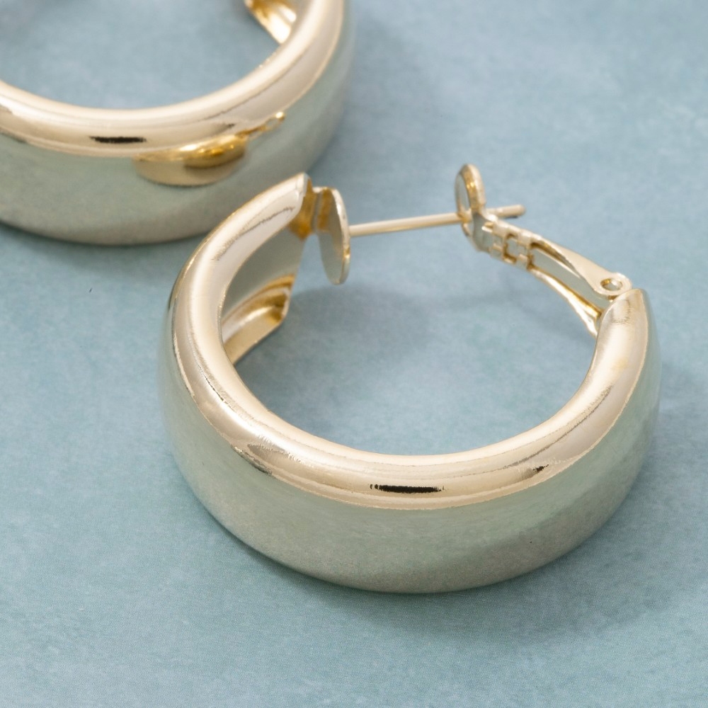 - This piece is a true showstopper, this pair of hoop earrings evokes a captivating wide latch design. Add a touch of glamour to your wardrobe with this versatile pair of hoop earrings, perfect for enhancing the elegance of any look. Available in G, S. This item is sold in packs of 12.