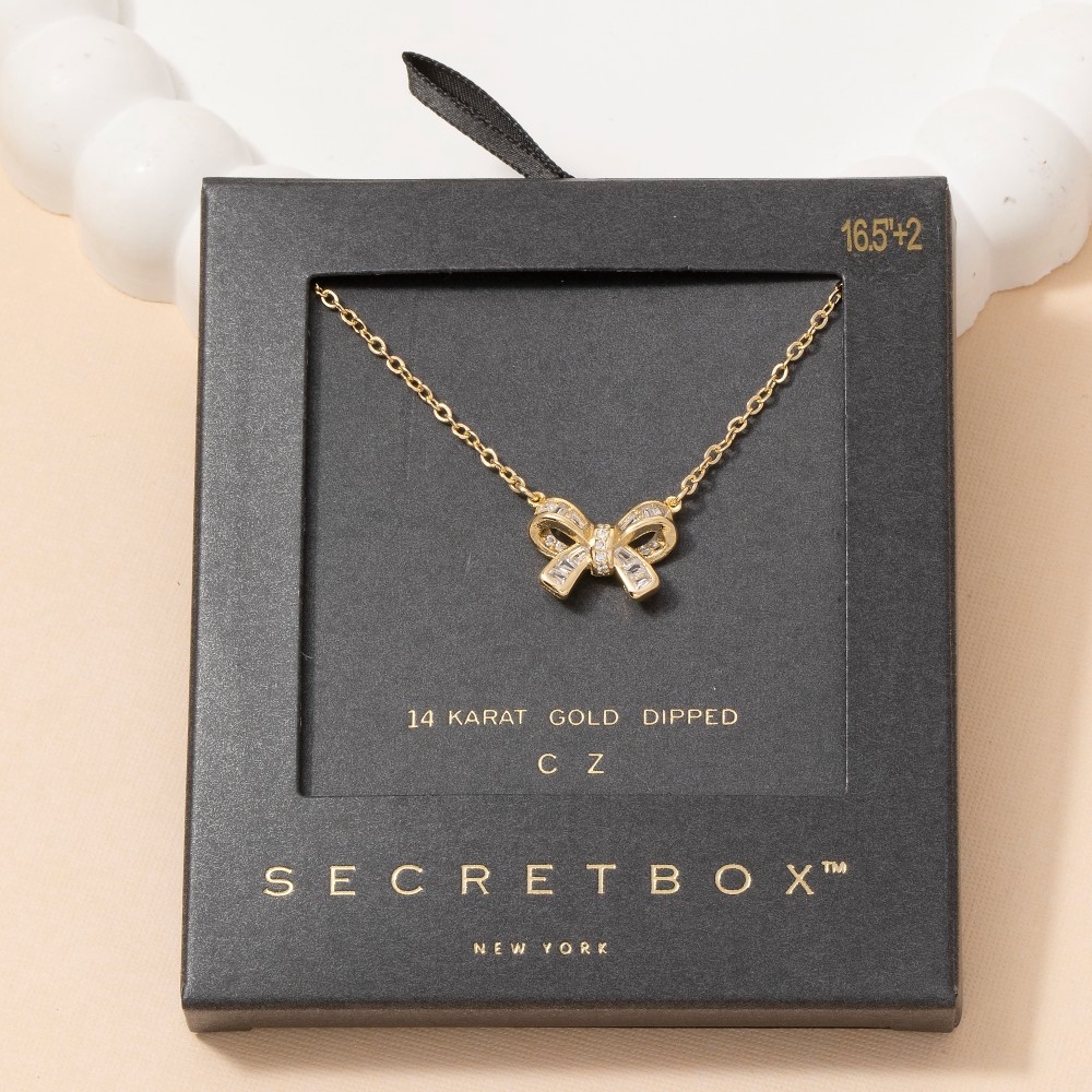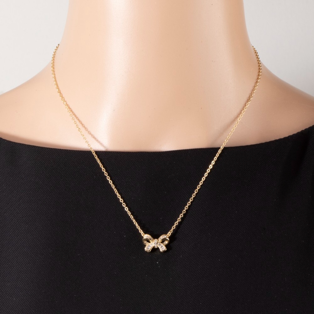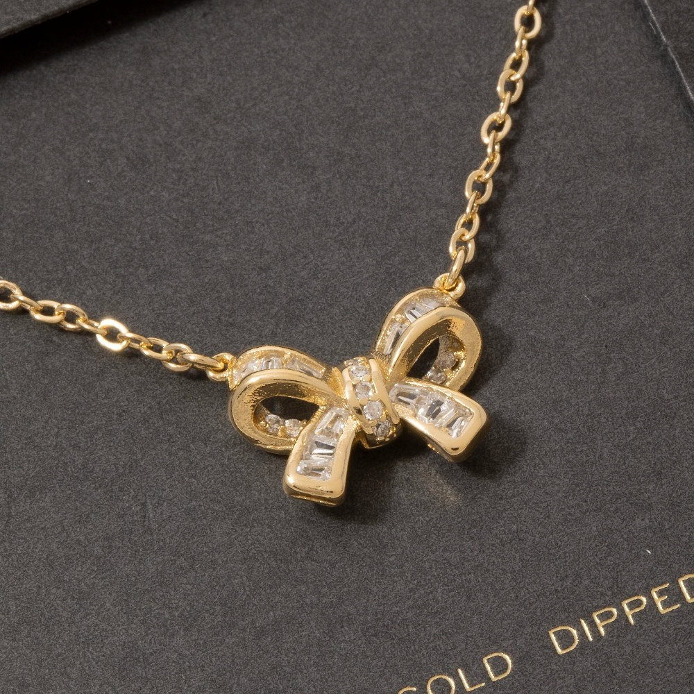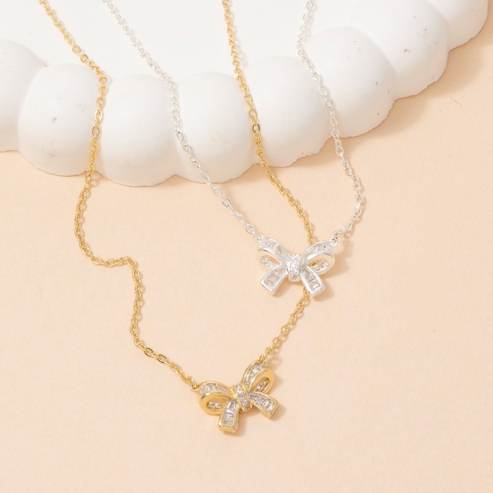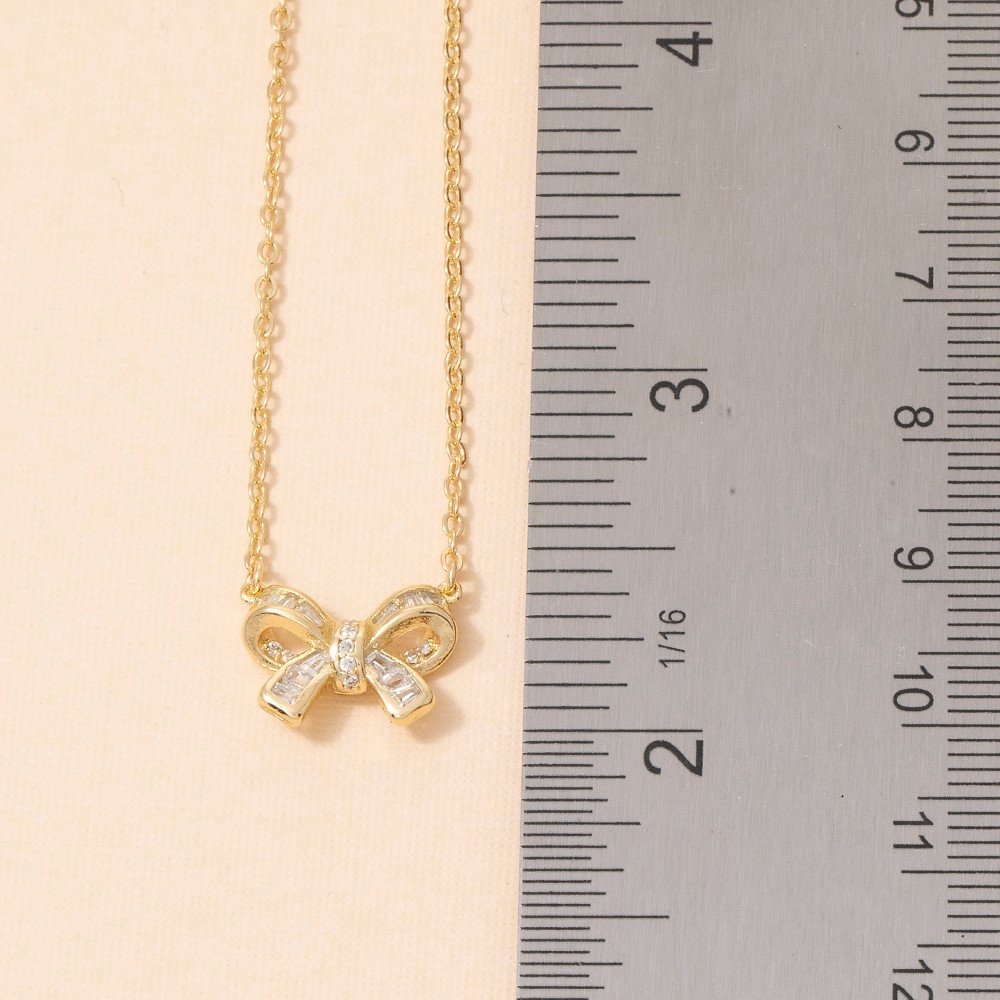 This piece is a true showstopper, this pendant necklace incorporates a flawless 14k gold dipped cubic zirconia bow design. This item is ideal for those who want to add some personality to their outfits without being too bold. Available in GD, WG. This item is sold in packs of 1.