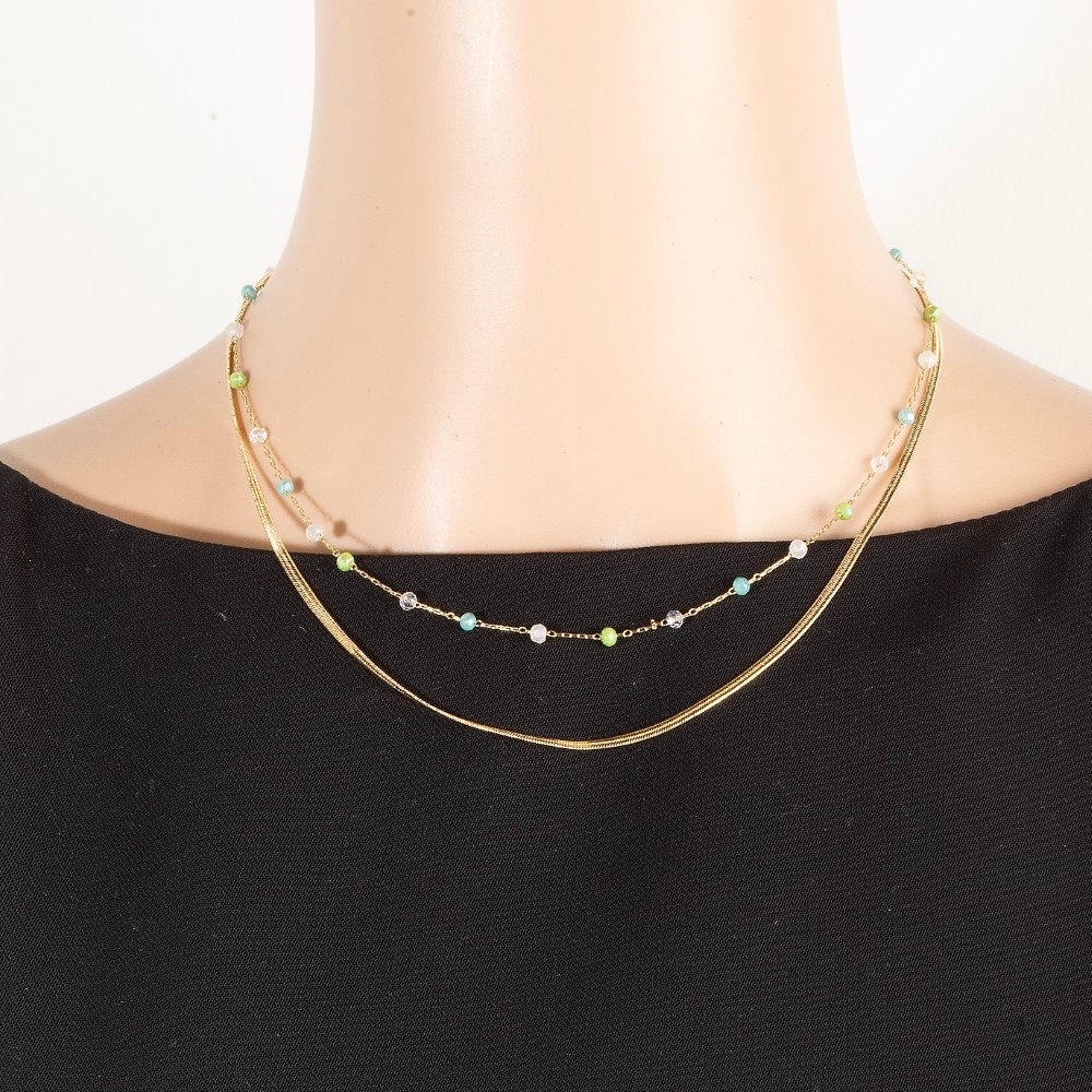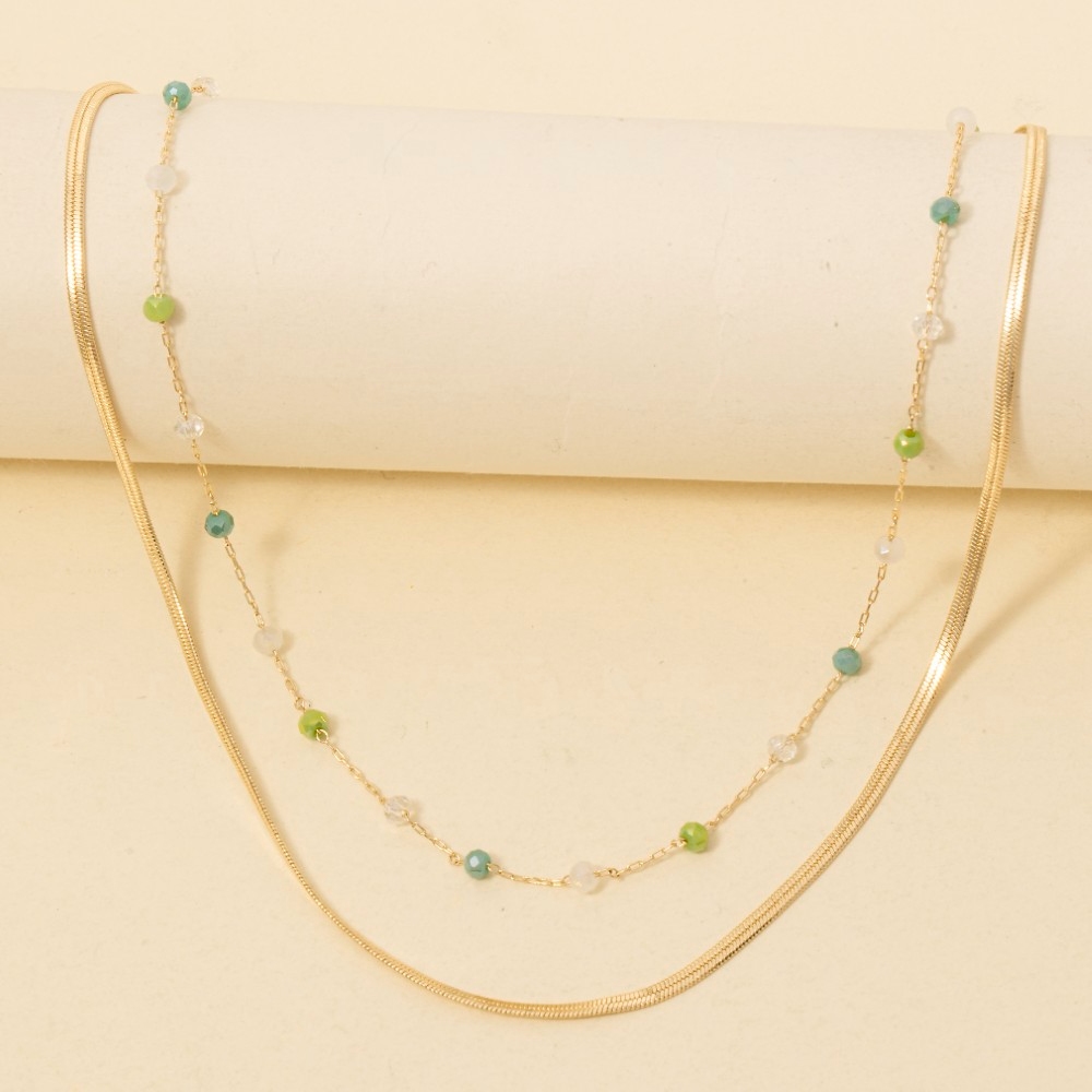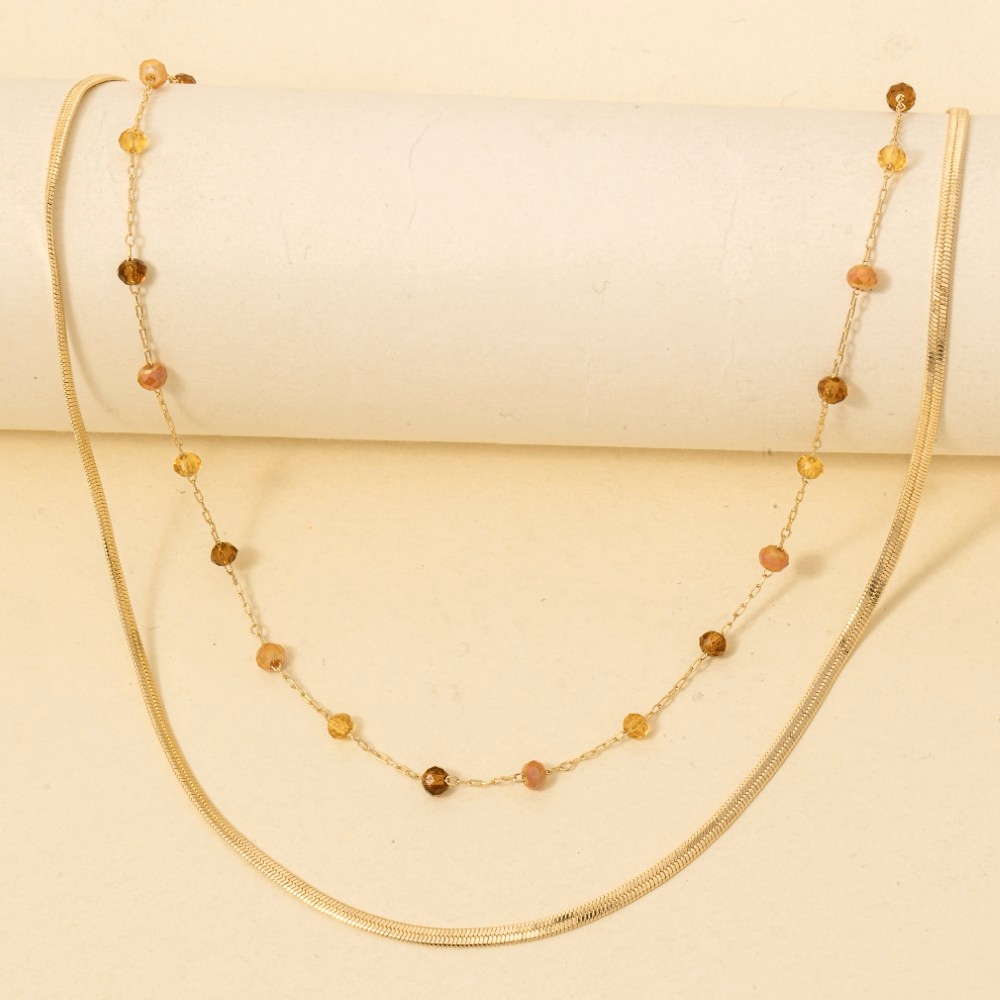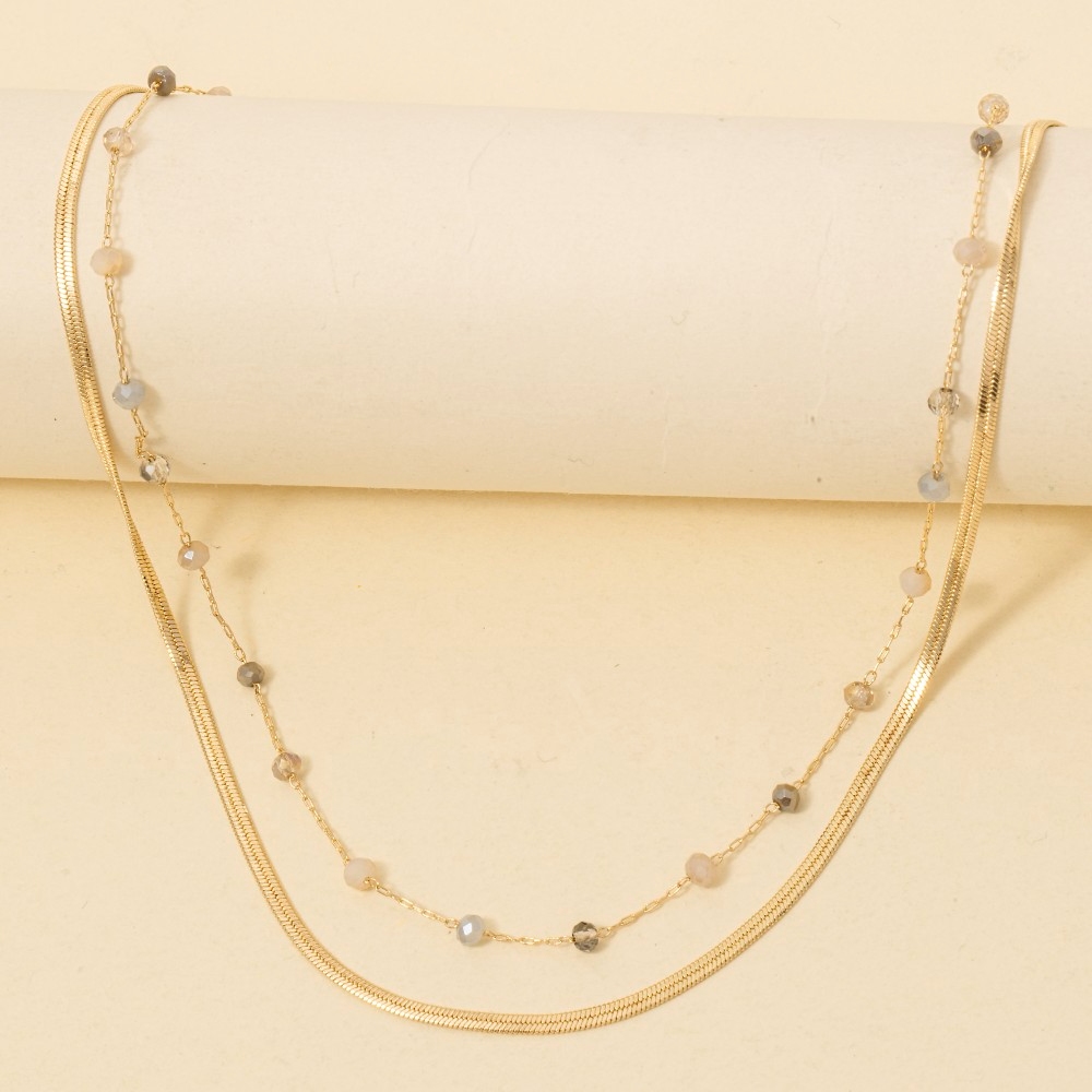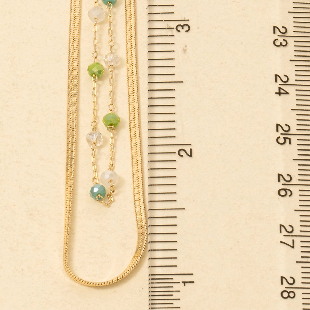 • Effortlessly elevate your style, this layered necklace boasts a magnificent faceted glass beads and snake chain design. Elevate your fashion game with this versatile layered necklace, seamlessly integrating into your signature style. Available in GDMGY, GDMNT, GDTPZ. This item is sold in packs of 1.
