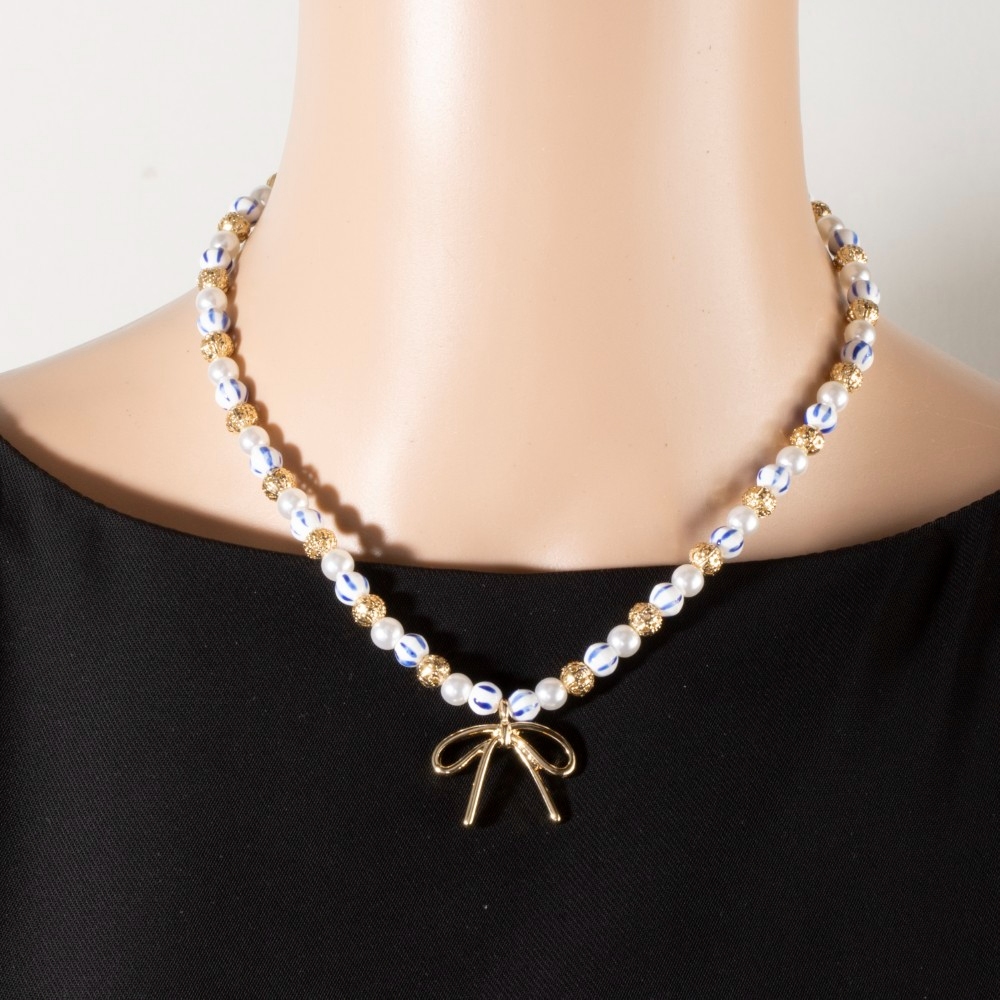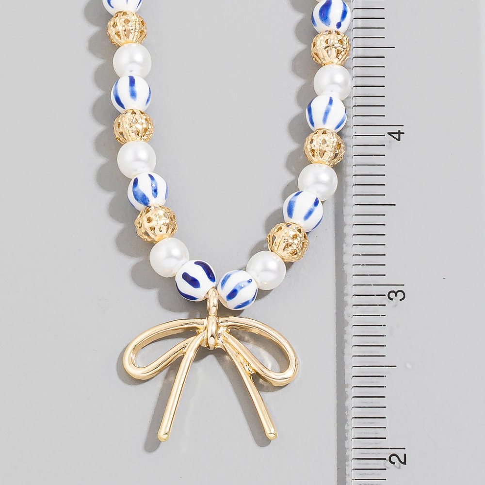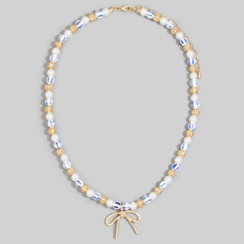 Effortlessly elevate your style, this pendant necklace introduces an exceptional blue bead pearl bow design. This item is ideal for those who want to add some personality to their outfits without being too bold. Available in GBL. This item is sold in packs of 1.