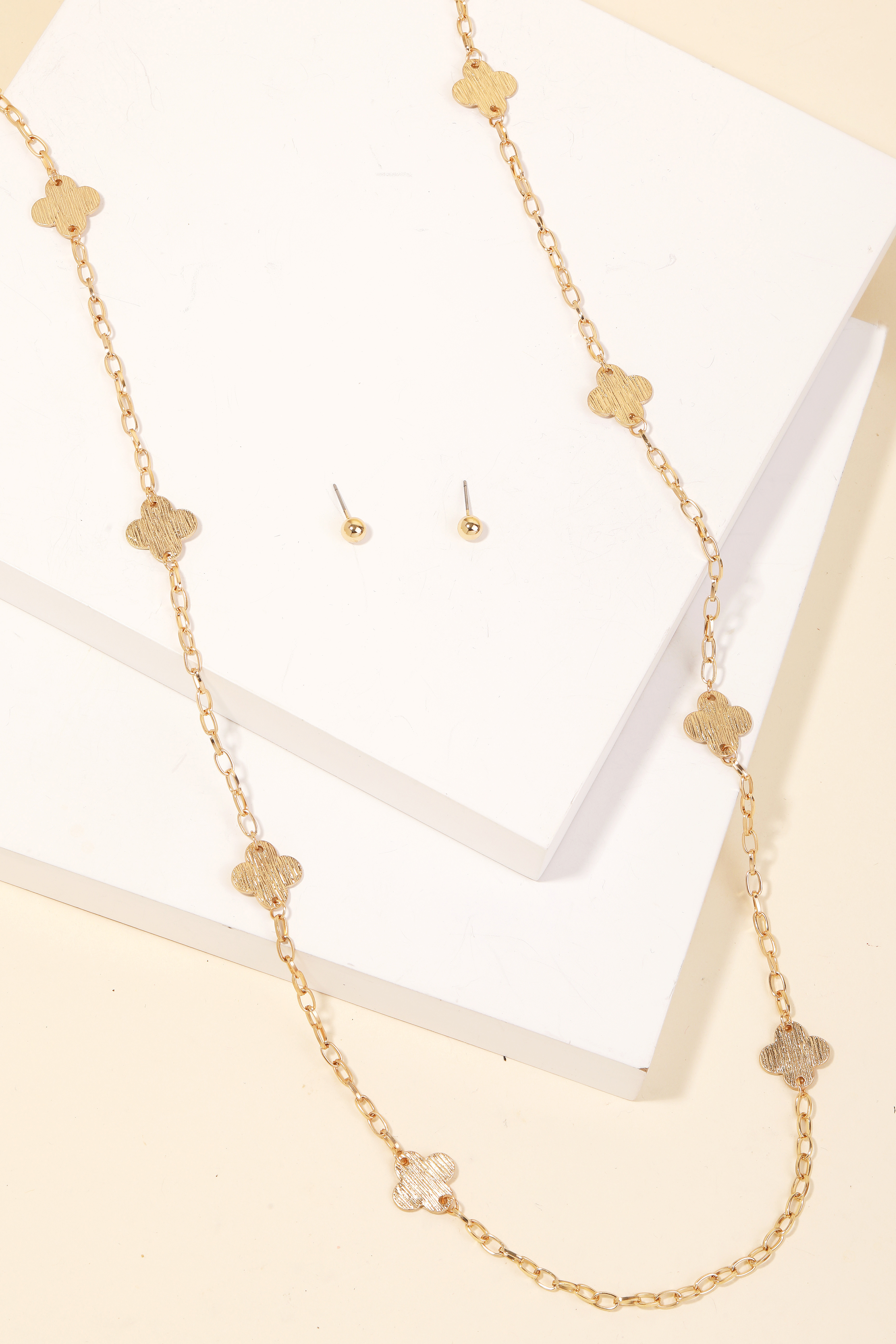 Add some edge to your wardrobe with this necklace set highlights a special brushed metallic clover station necklace set design. This item is ideal for those who want to add some personality to their outfits without being too bold. Available in WG and WS. This item is sold in packs of 1.