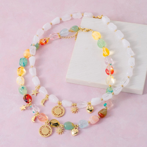 Ceramic Floral Cross And Bead Charms Chain Necklace