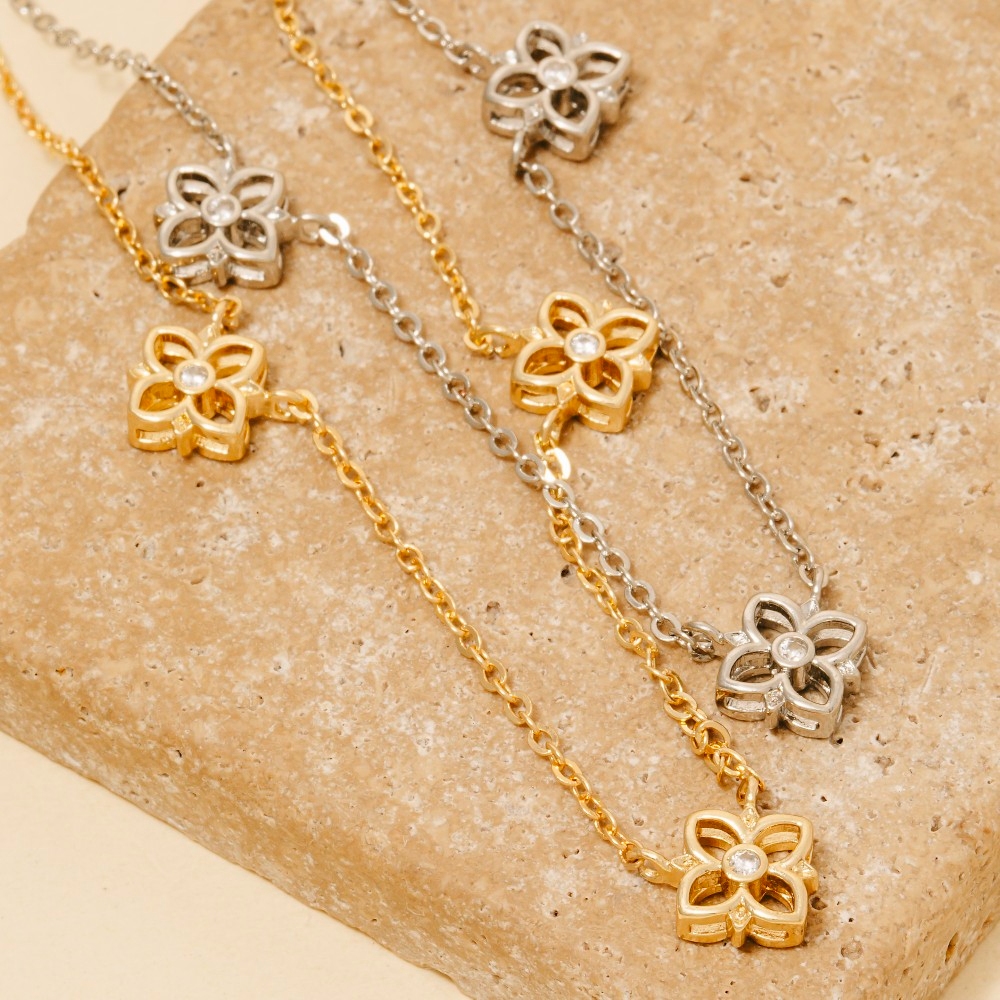 - Perfect for any fashion-forward individual, this chain necklace comes with a special cubic zirconia triple flower station design. A must-have chain necklace that effortlessly enhances your style, no matter the occasion. Available in GDCRY, RHCRY. This item is sold in packs of 1.