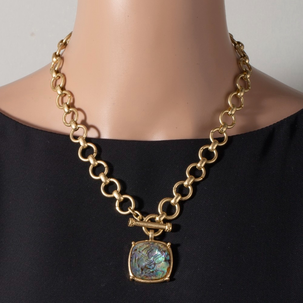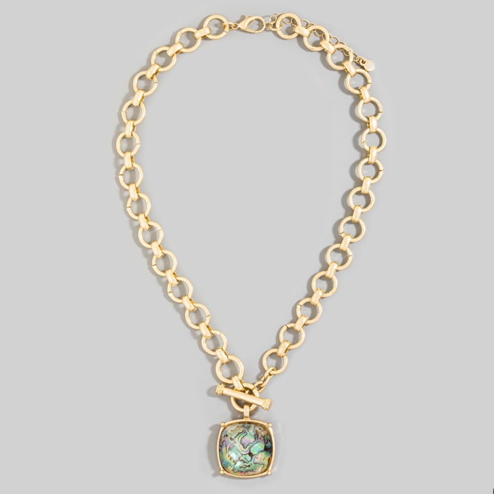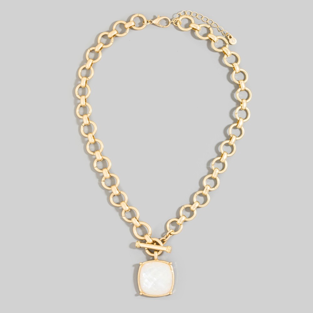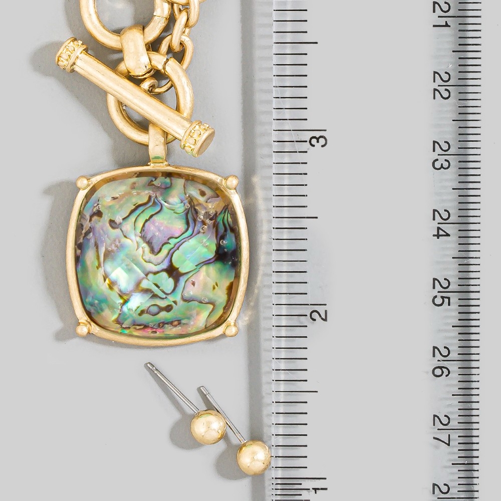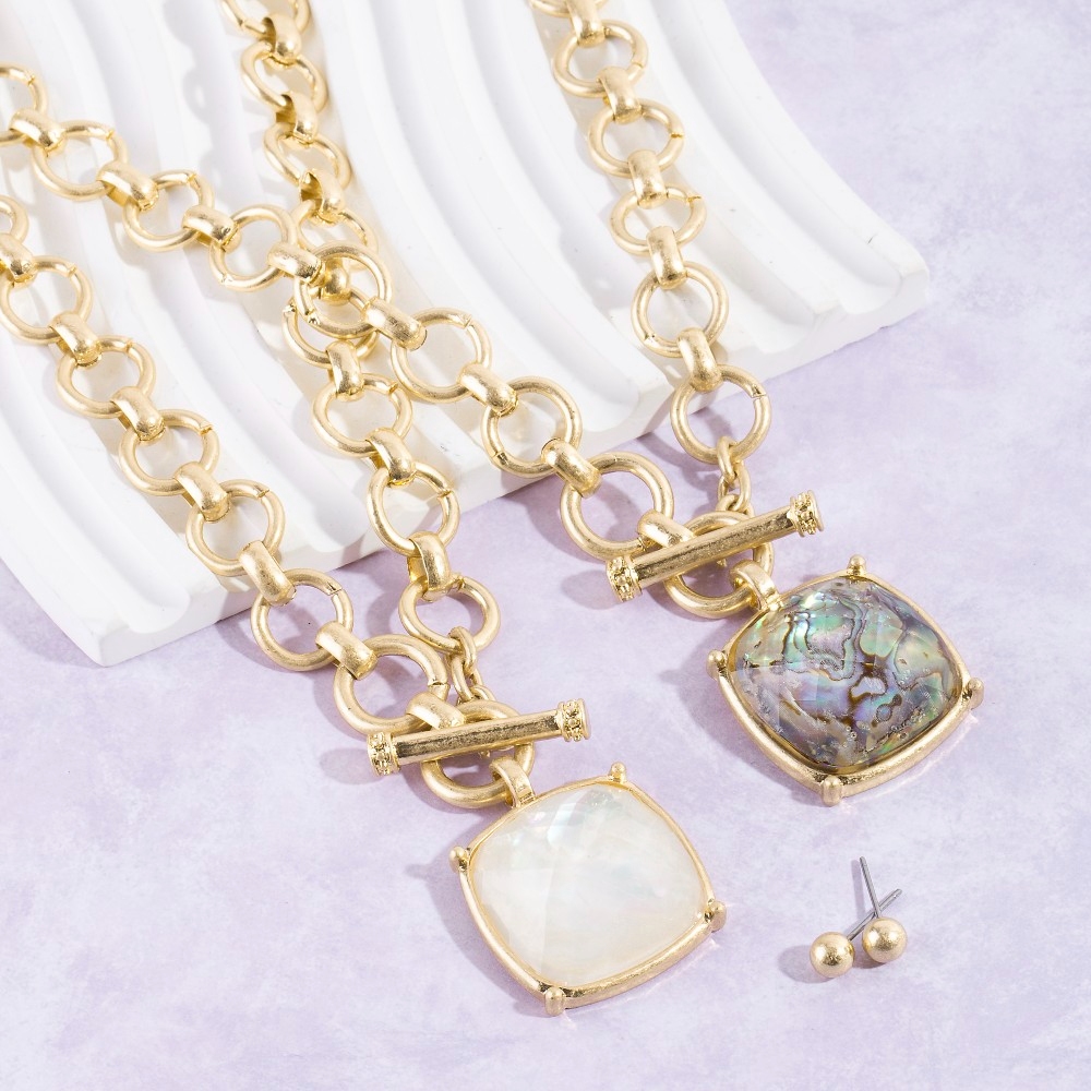 This piece is a true showstopper, this necklace set shows off a distinctive faceted square stone pendant design. Unleash the potential of your wardrobe with this versatile necklace set, ensuring a touch of elegance in every ensemble. Available in ABLN, MOP and TOR. This item is sold in packs of 1.