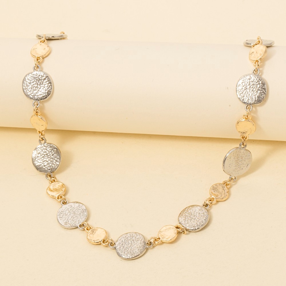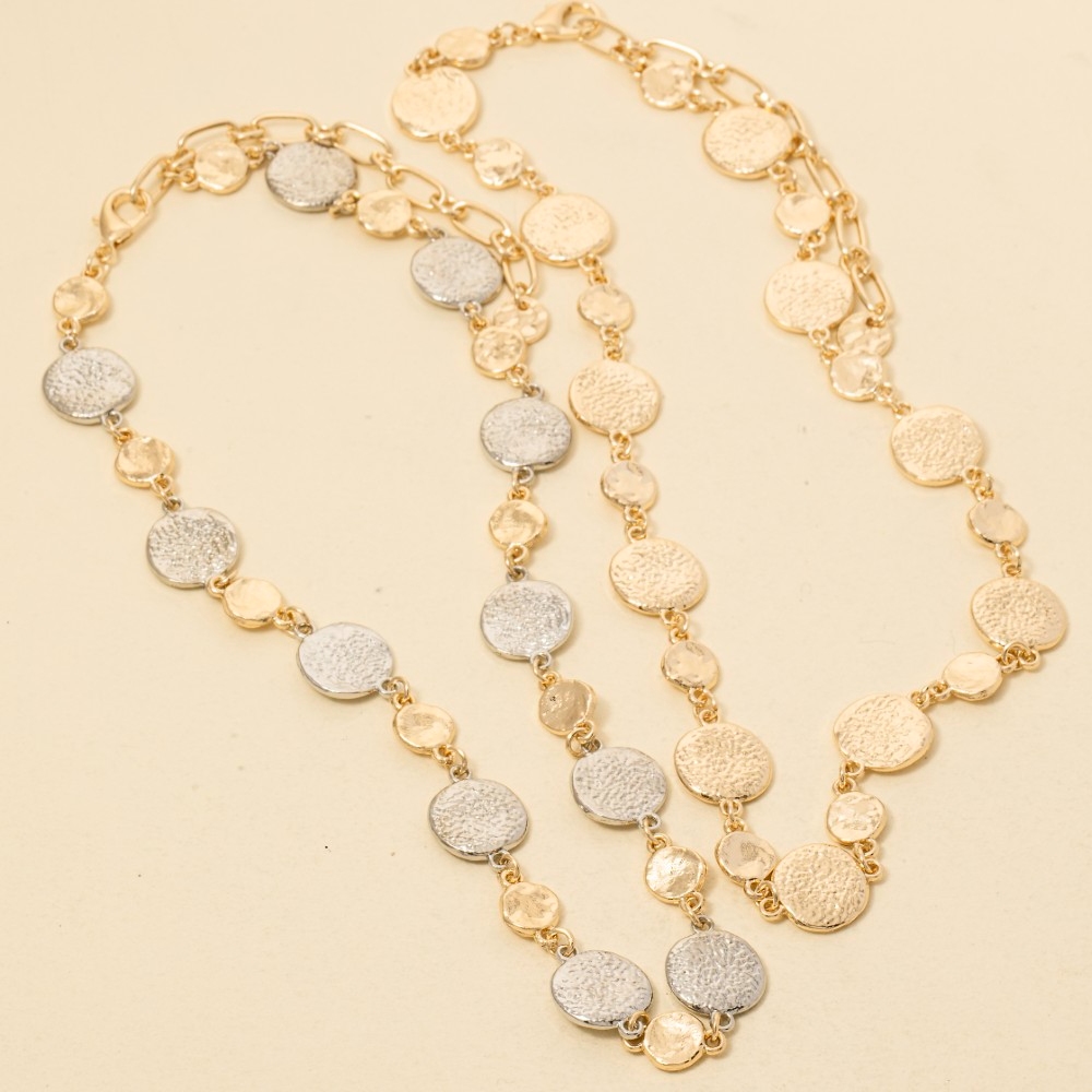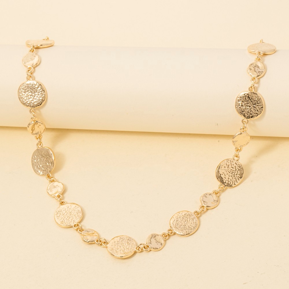 - Effortlessly stylish and always on-trend, this chain necklace showcases an alluring metallic hammered coins design. A stylish chain necklace that's perfect for complementing any outfit you wear. Available in GD, GDRH. This item is sold in packs of 1.