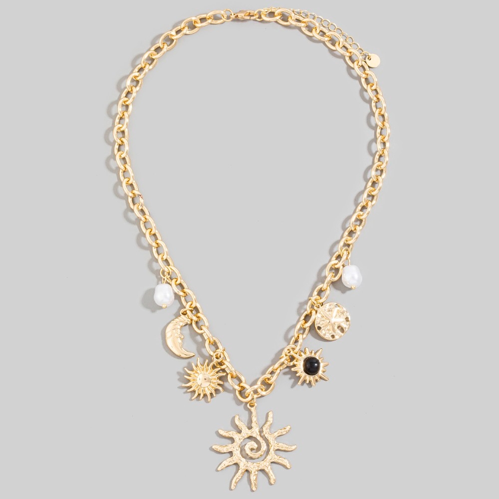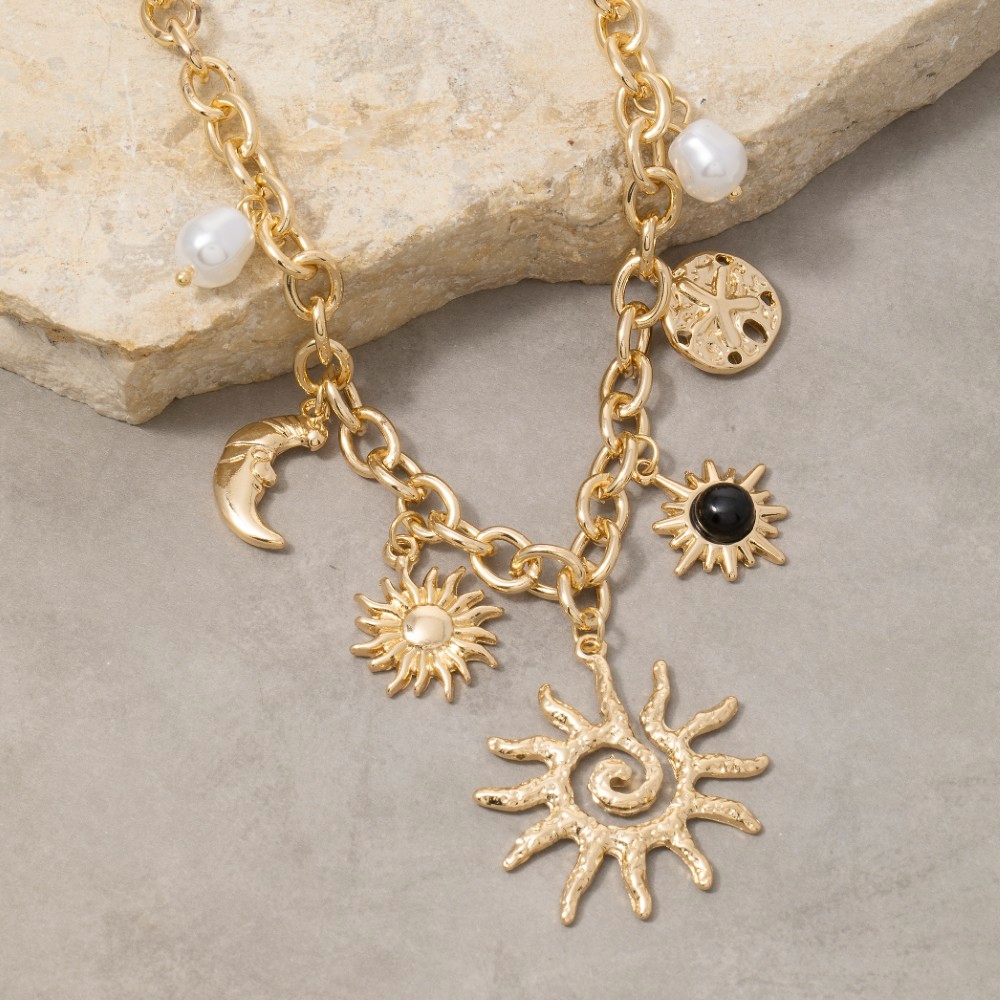 • A must-have for any fashion-forward individual, this chain necklace embodies a sophisticated mixed sun and pearl charms design. A must-have chain necklace that effortlessly enhances your style, no matter the occasion. This item is sold in packs of 1.