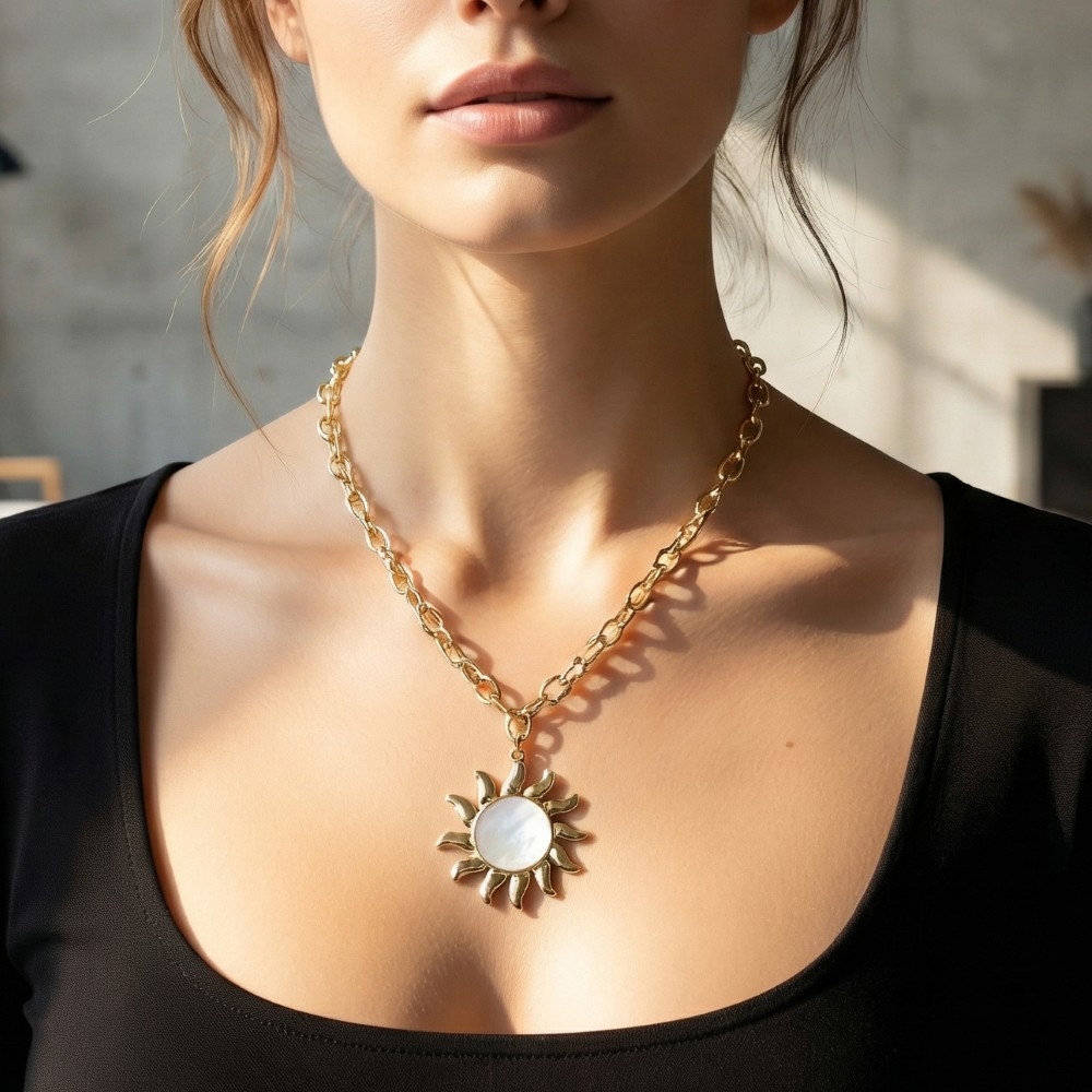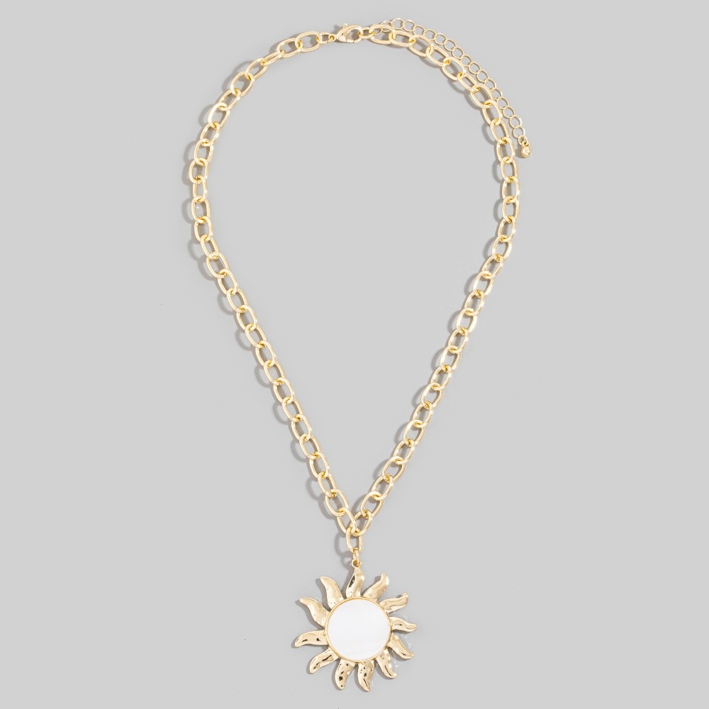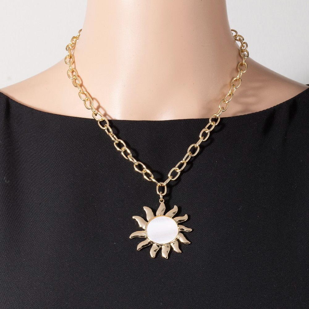 - Effortlessly elevate your outfit, this chain necklace features a distinct mother of pearl sun pendant design. This item is perfect for adding some color and vibrancy to any outfit. Available in GDMOP. This item is sold in packs of 1.