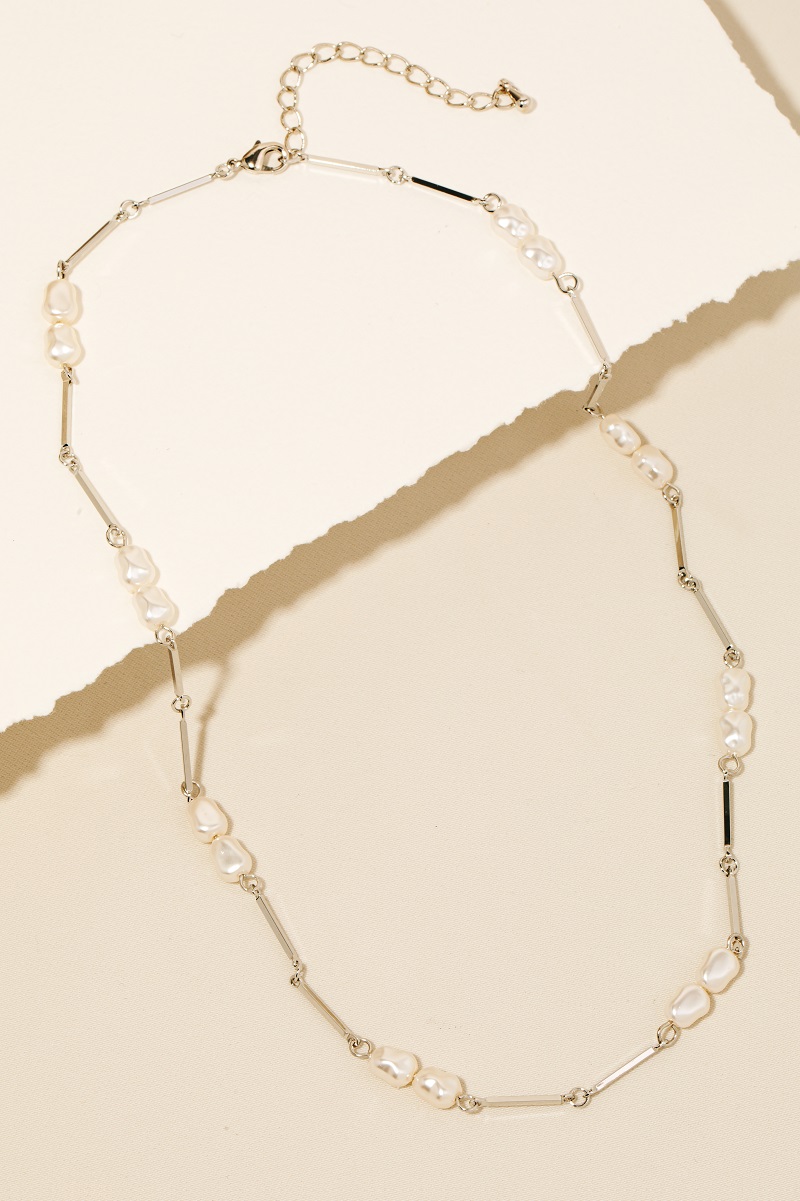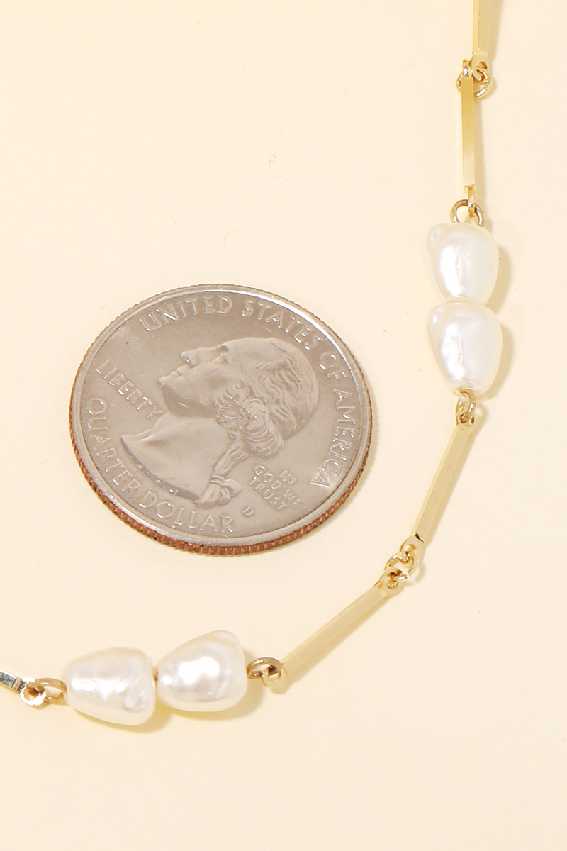 • Upgrade your accessory game with this chain necklace features a distinct pearl beaded daint bar chain necklace design. This versatile accessory adds a touch of elegance to any outfit. Available in G. This item is sold in packs of 1.