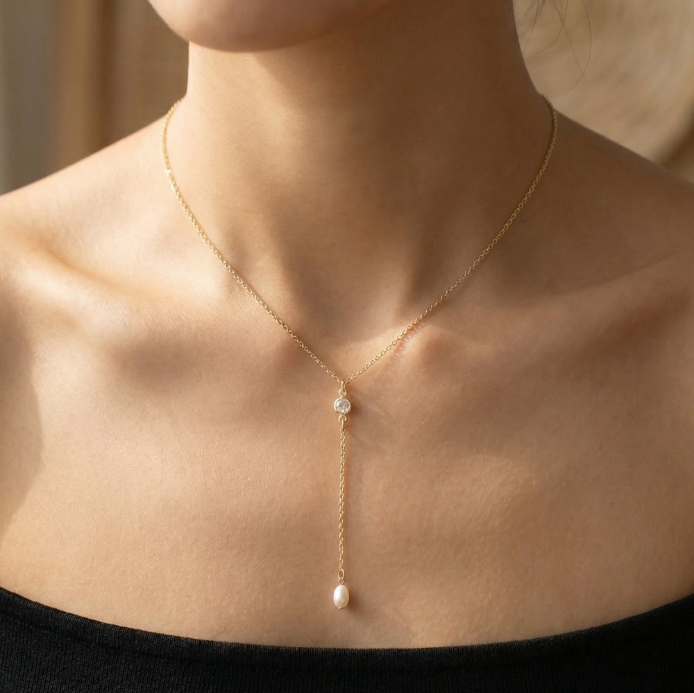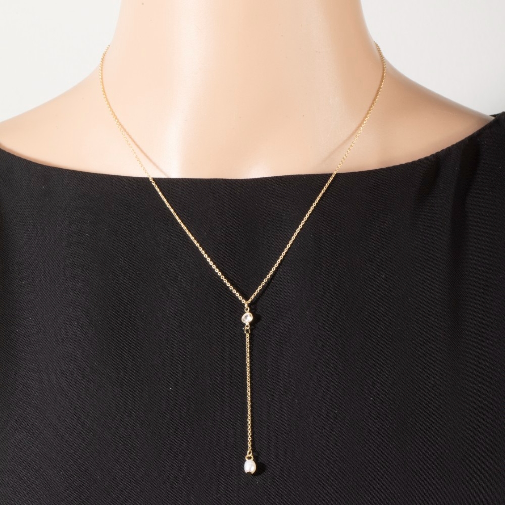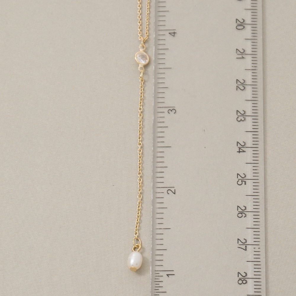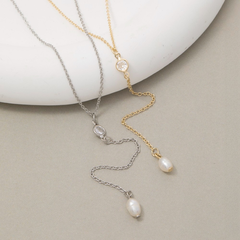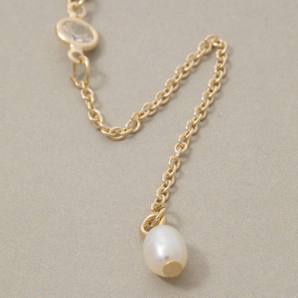 This chain necklace is made with 80% Brass, 10% Cubic Zirconia and 10% Fresh Water Pearl.