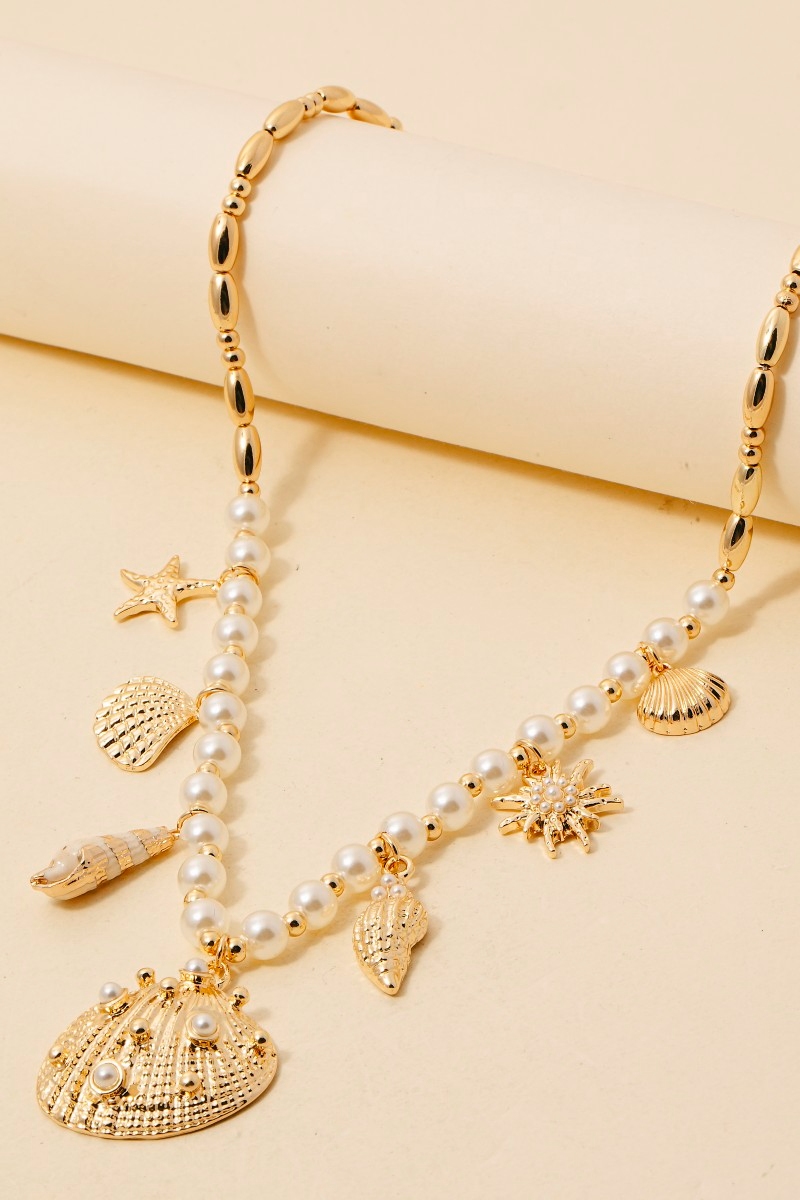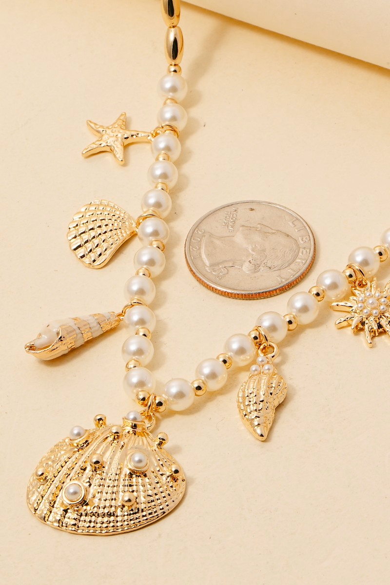 Mixed Sea Life And Pearl Charms Chain Necklace