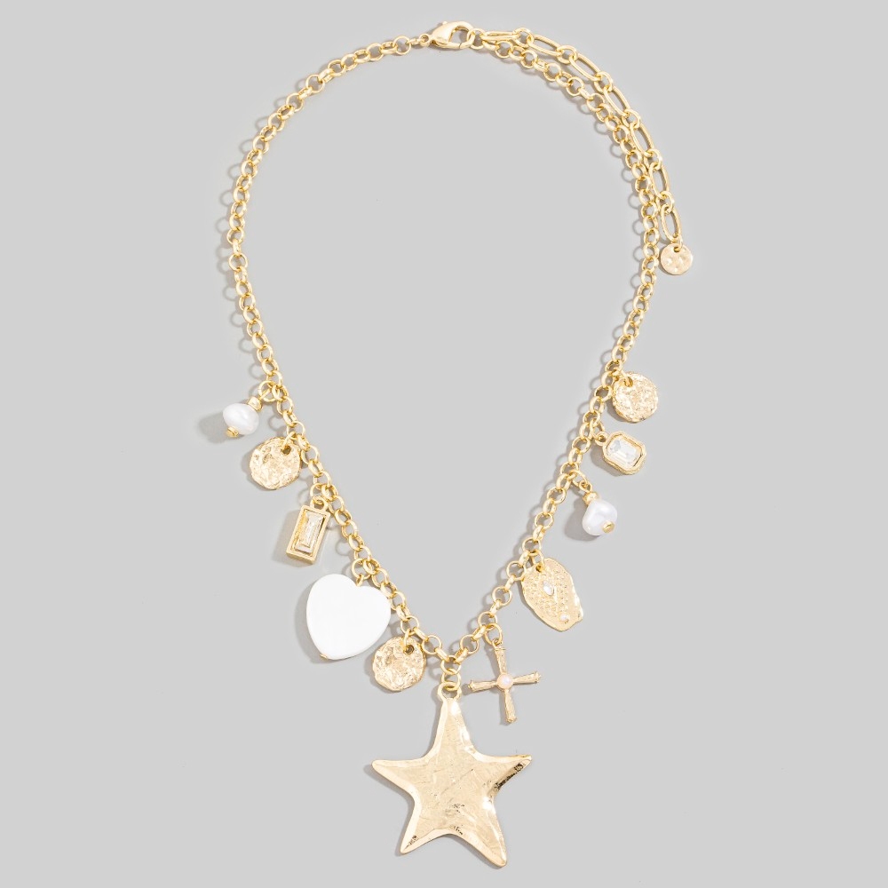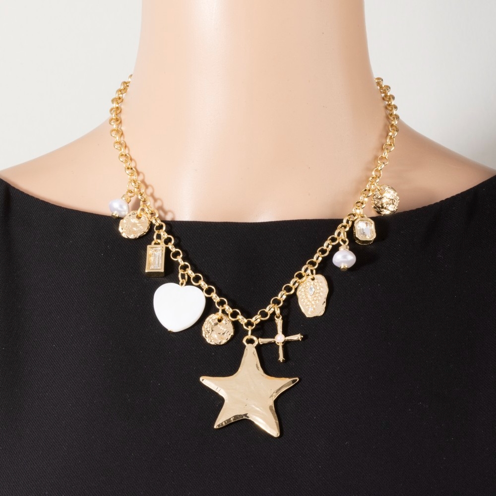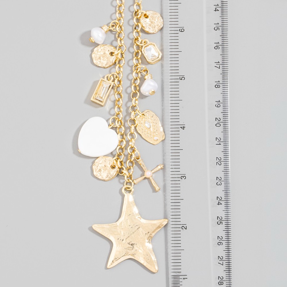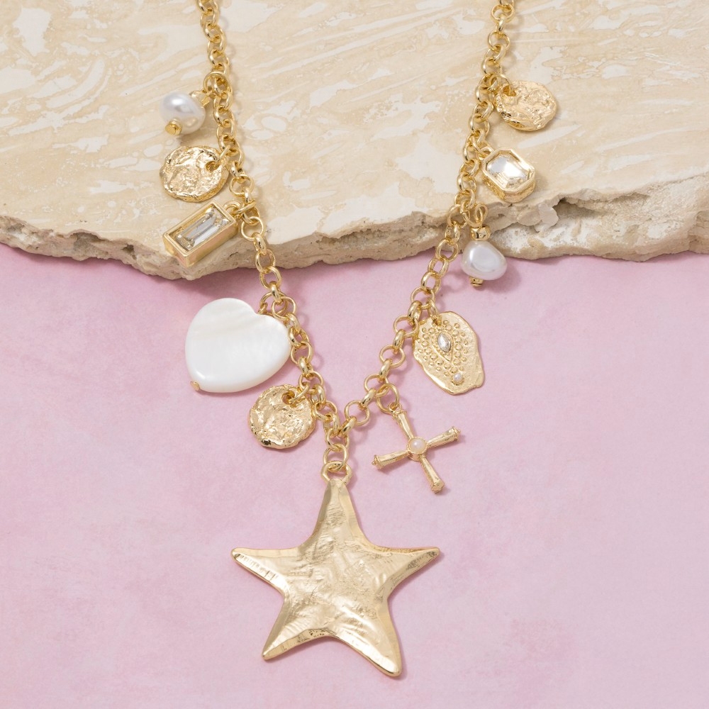 • This piece is the perfect way to add some glamour to your look, this chain necklace carries a charming star hearts and cross charms design. Redefine your wardrobe with this versatile chain necklace, a timeless addition that brings an air of sophistication to any look. Available in GD. This item is sold in packs of 1.