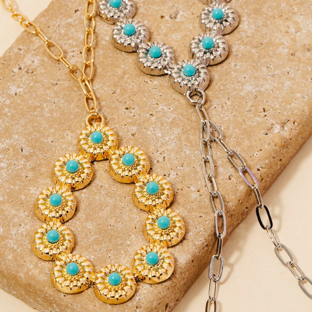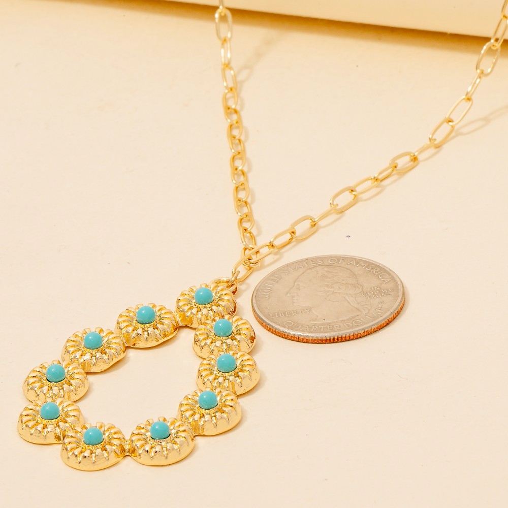 Guaranteed to add a touch of glamour to any outfit, this chain necklace flaunts a luxurious western turquoise teardrop pendant long design. This chain necklace is a great way to add some flair to your outfit without going over the top. Available in GDTQ, RHTQ. This item is sold in packs of 1.
