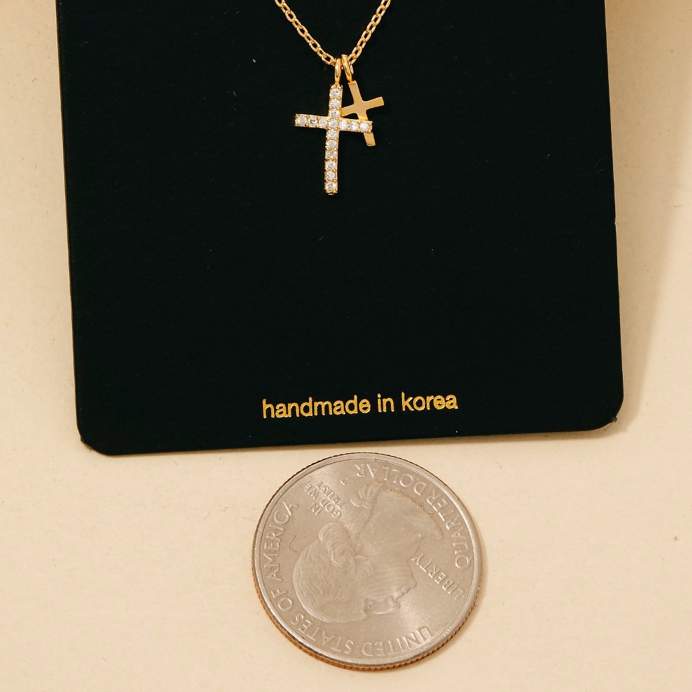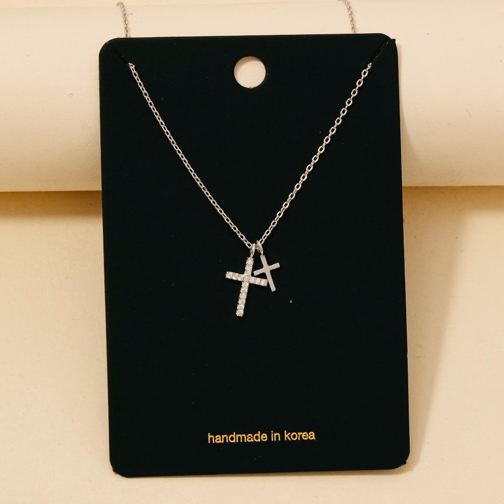 This season's hottest necklace, this necklace incorporates a flawless cz pave double cross pendant design. Discover the magic of accessorizing with this versatile necklace, effortlessly upgrading the style quotient of any outfit. Available in G, S. This item is sold in packs of 1.