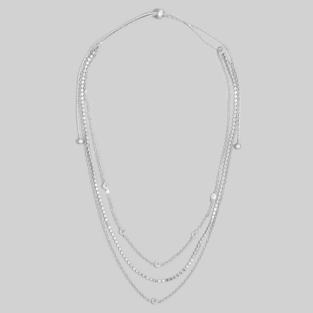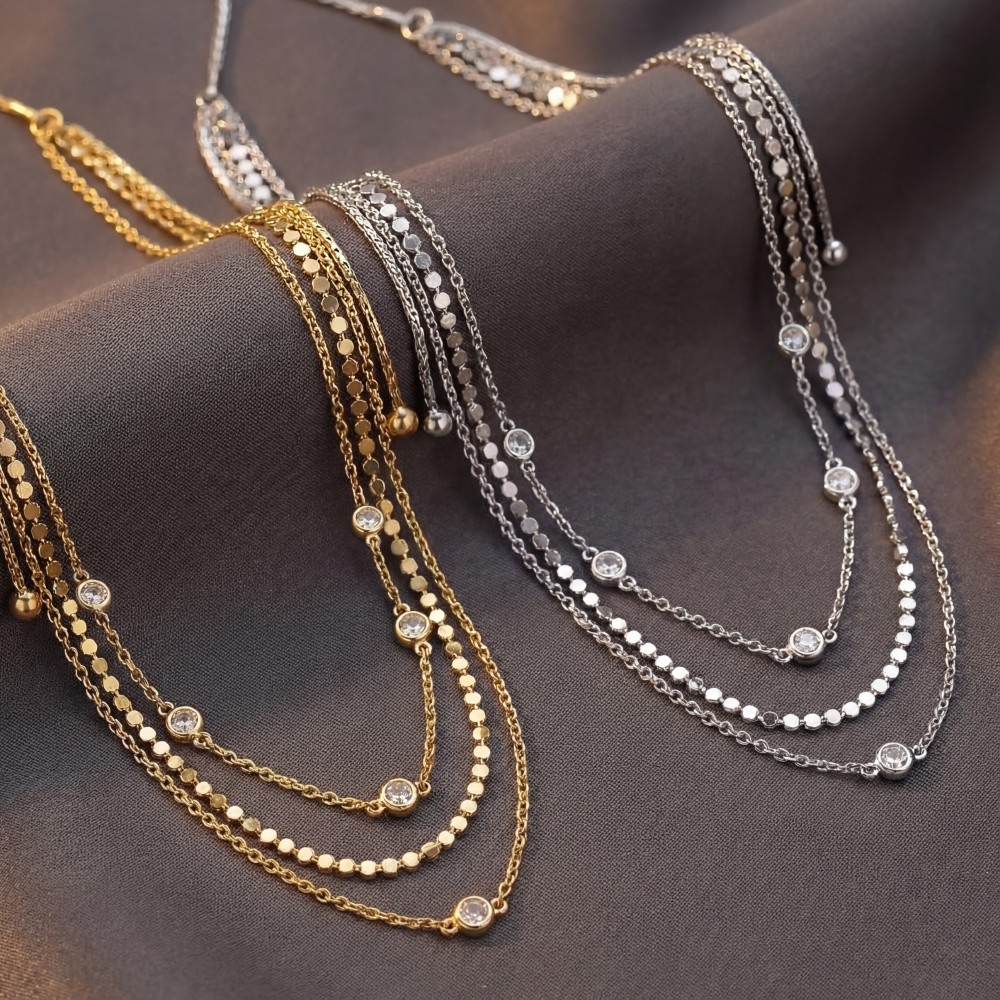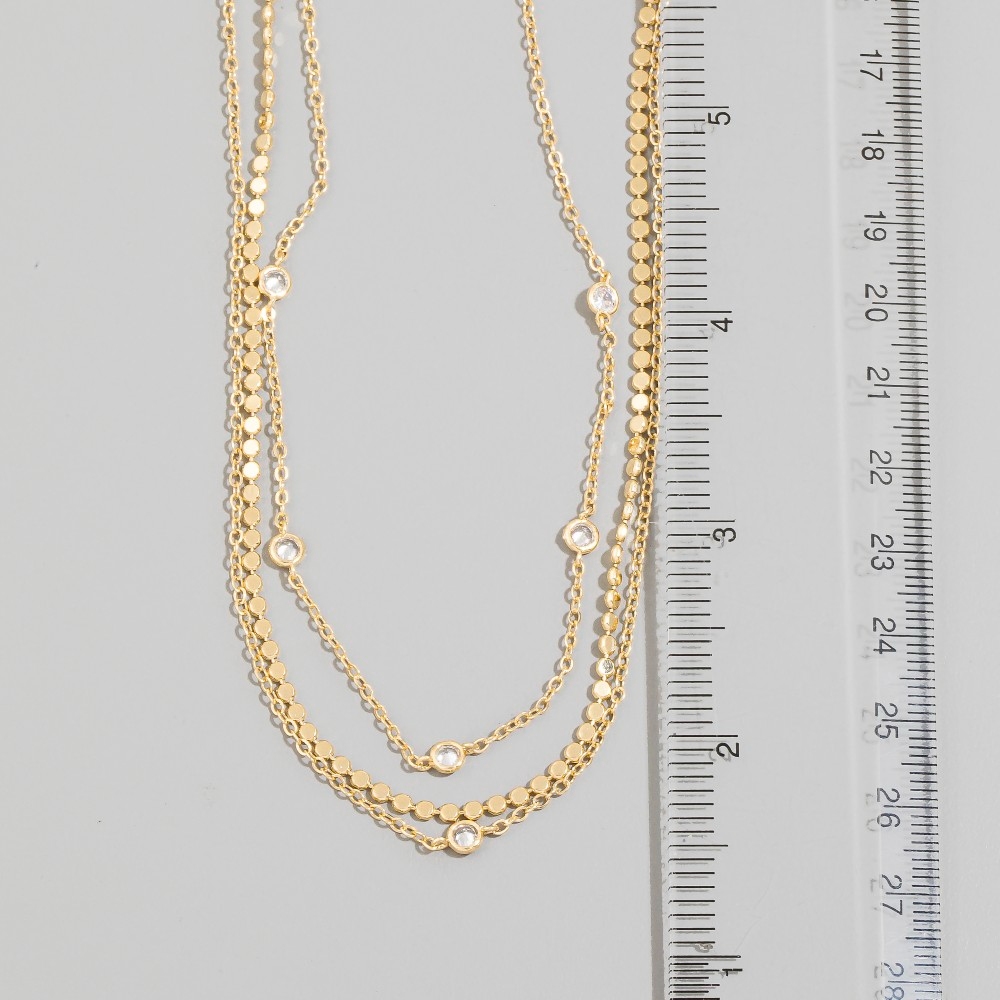 Stay on-trend and stand out from the crowd, this chain necklace incorporates a remarkable dainty three layered chain adjustable necklace design. Unleash the charm of this versatile chain necklace, effortlessly turning any outfit into a fashion statement. Available in GDCRY and RHCRY. This item is sold in packs of 1.