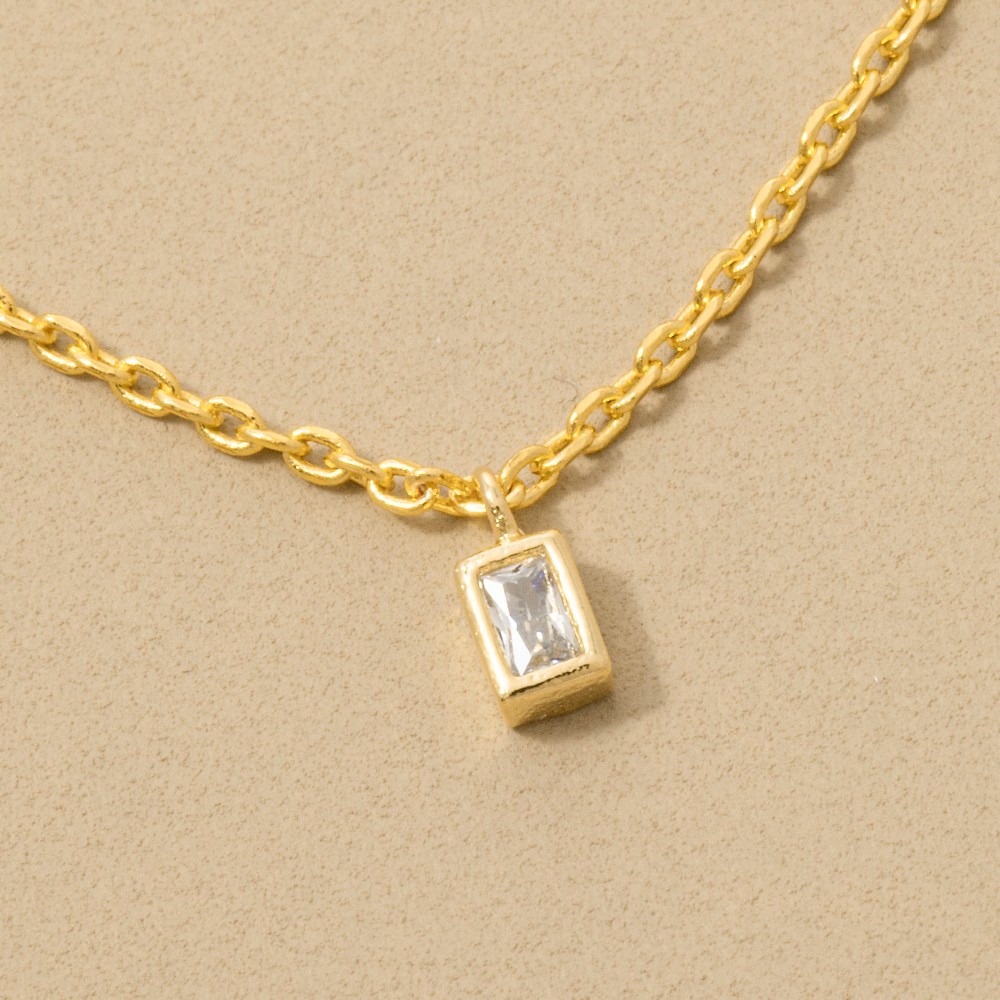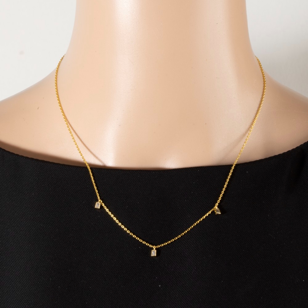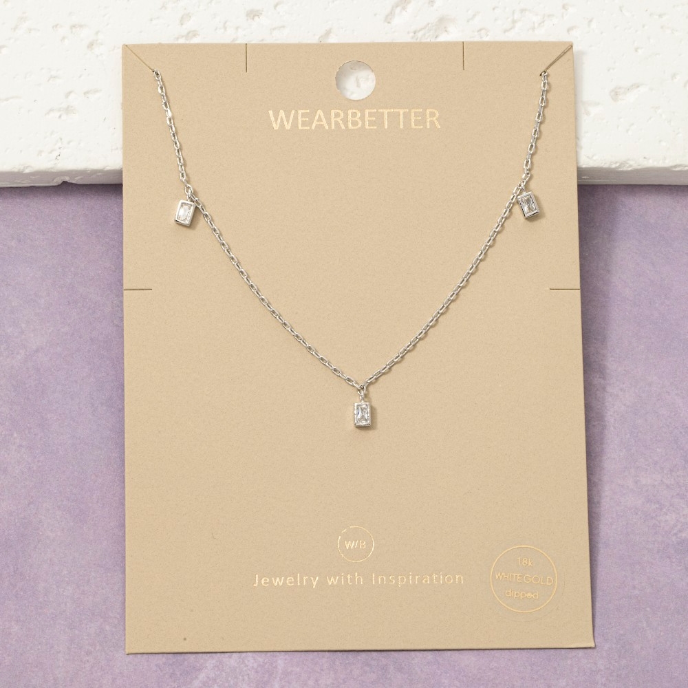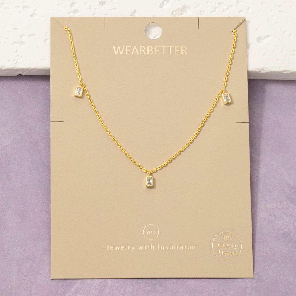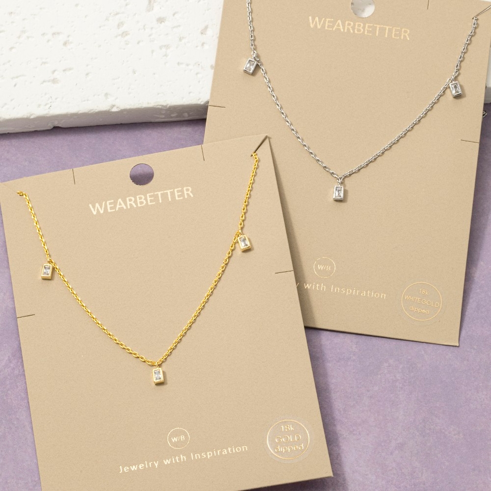 • The perfect way to add some edge to your look, this necklace embodies a sophisticated dainty triple baguette cubic zirconia bezel drop station design. Discover the magic of accessorizing with this versatile necklace, effortlessly upgrading the style quotient of any outfit. Available in G, S. This item is sold in packs of 1.
