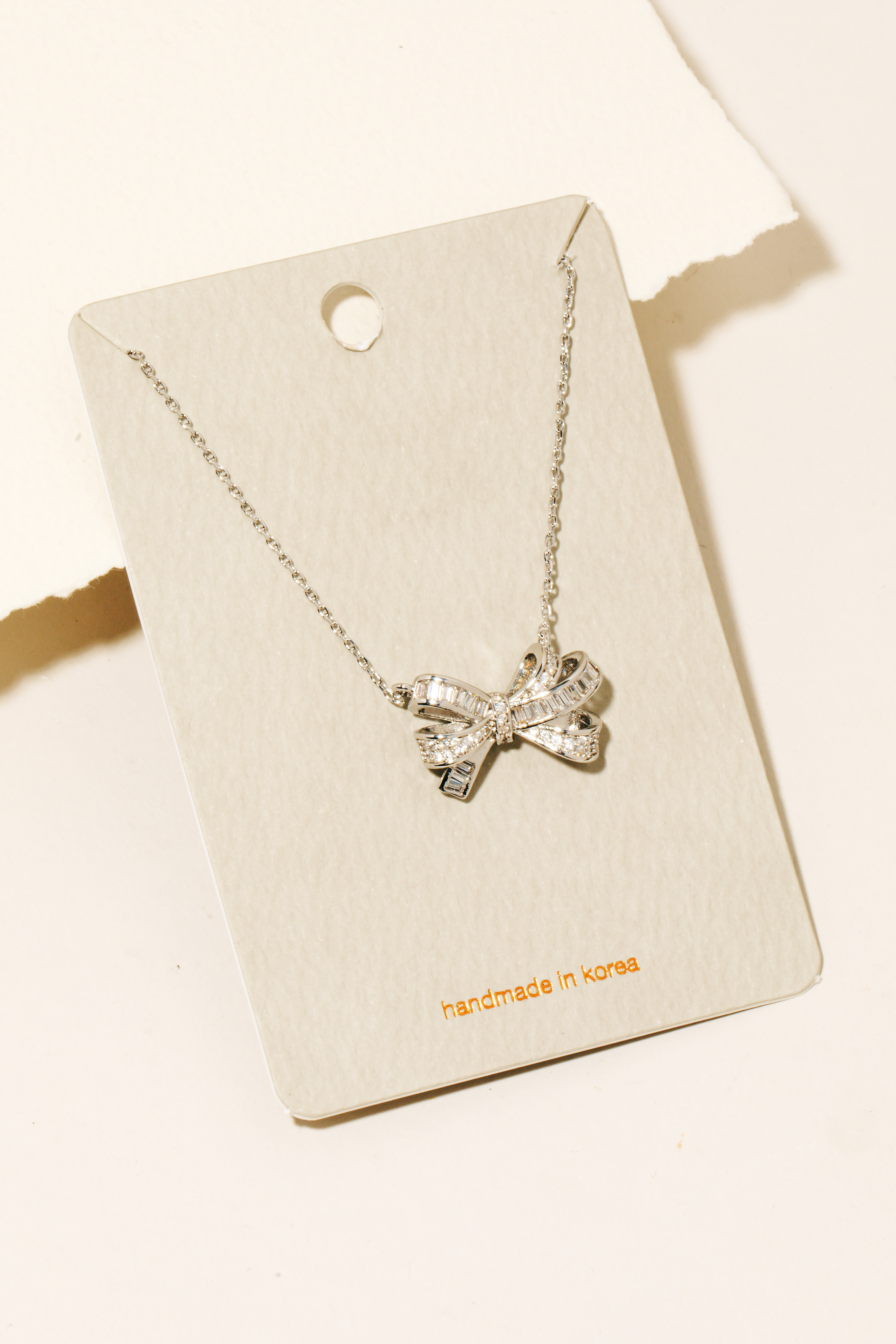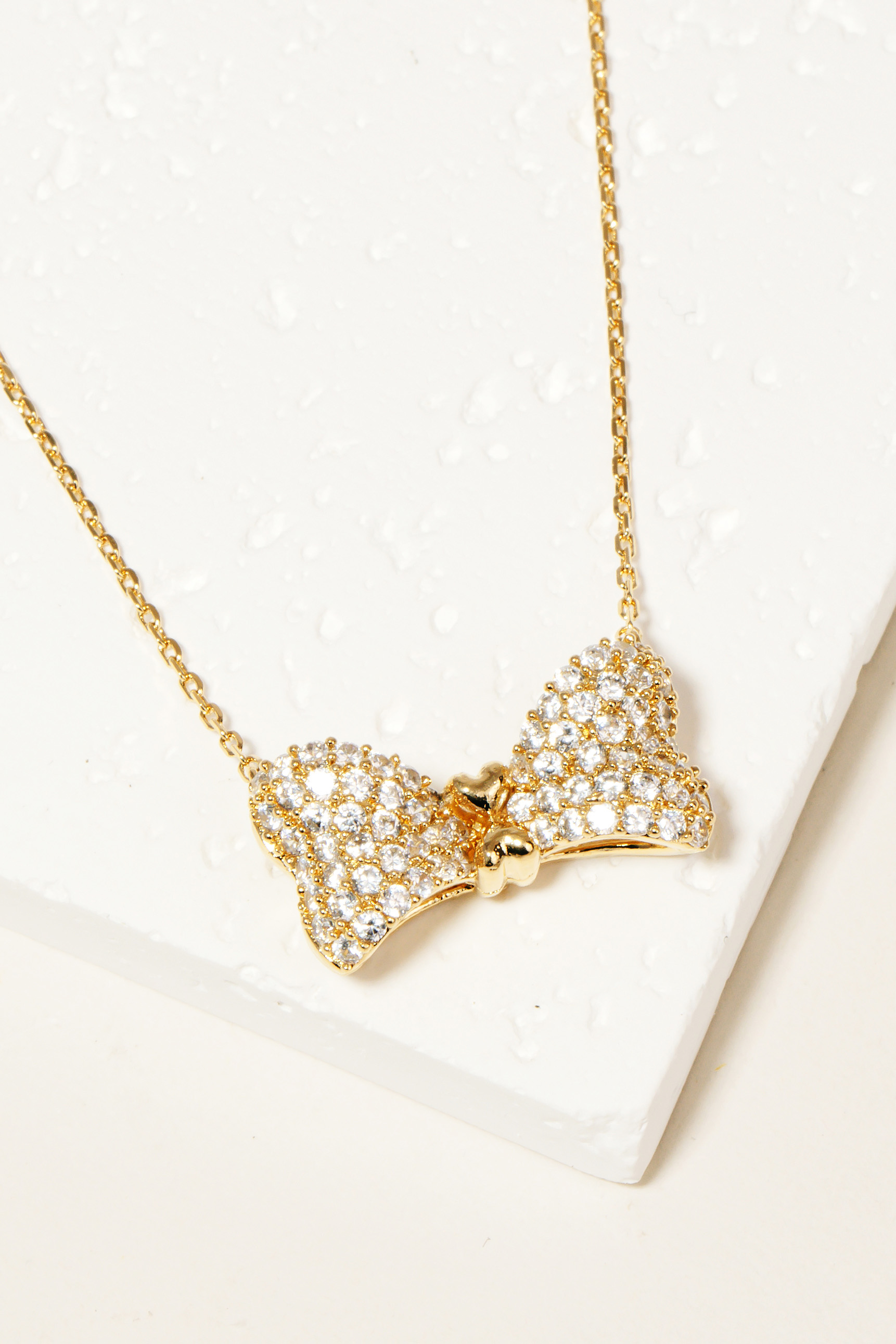 Stay on-trend and stand out from the crowd, this necklace possesses a fine rhinestone pave ribbon bow pendant design. Infuse a hint of luxury into your daily attire with this versatile accessory, a must-have for those who appreciate timeless elegance. Available in G and S. This item is sold in packs of 1.