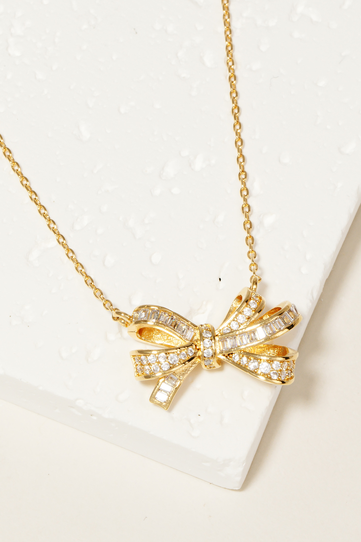 • Effortlessly chic and sophisticated, this necklace introduces an exceptional tear stone and rhinestone bow pendant design. Redefine your wardrobe with this versatile accessory, a timeless addition that brings an air of sophistication to any look. Available in G and S. This item is sold in packs of 1.