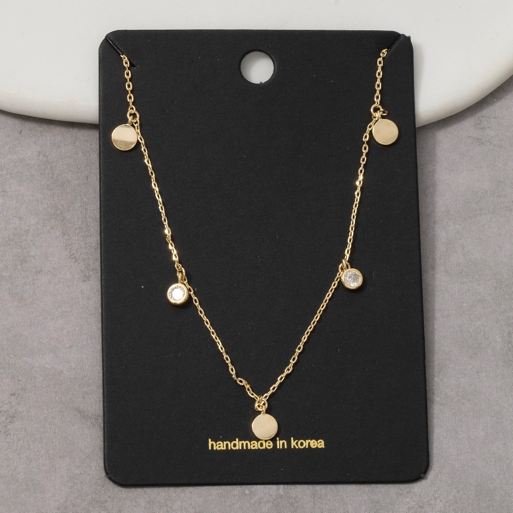 • Elevate your style with something unique and daring, this necklace comes with a special disc and cubic zirconia drop charm design. This item is ideal for those who want to add some personality to their outfits without being too bold. Available in G. This item is sold in packs of 1.
