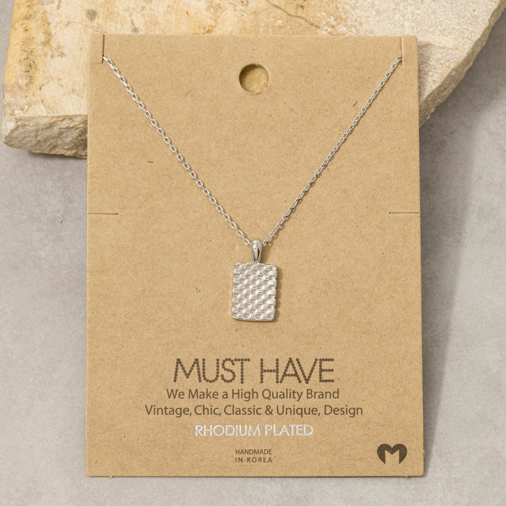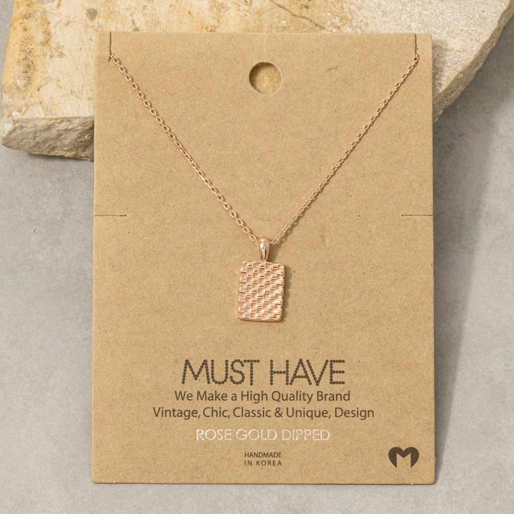 This necklace introduces a unique gold dipped mesh rectangle pendant style. Elevate your ensemble with this chic, timeless necklace.