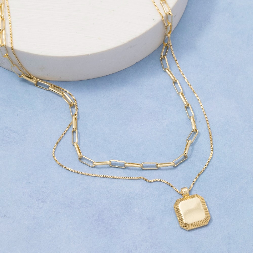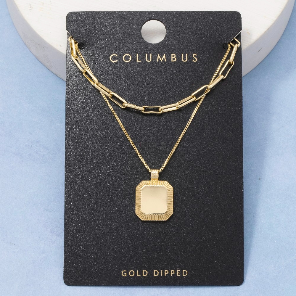 • Effortlessly elevate your outfit, this pendant necklace highlights a special gold dipped square pendant layered chains necklace design. Discover the magic of accessorizing with this versatile pendant necklace, effortlessly upgrading the style quotient of any outfit. Available in GOLD. This item is sold in packs of 1.