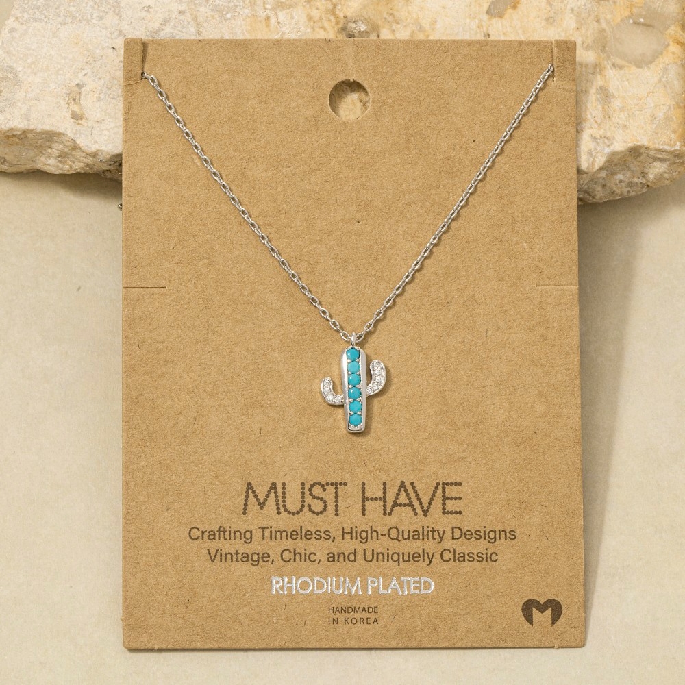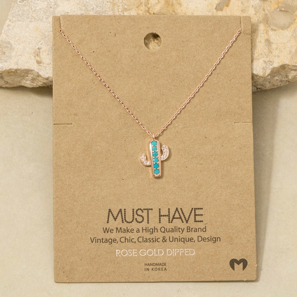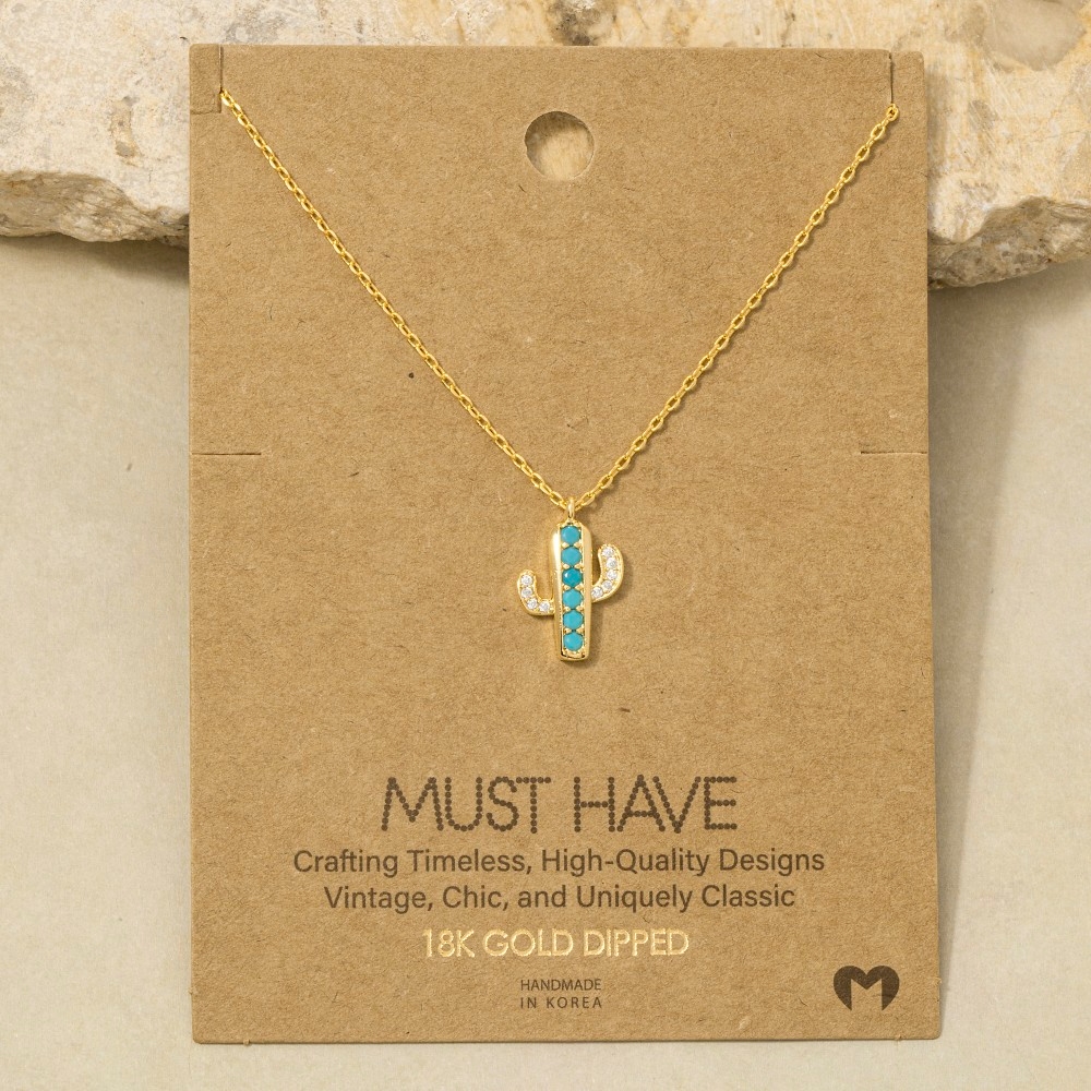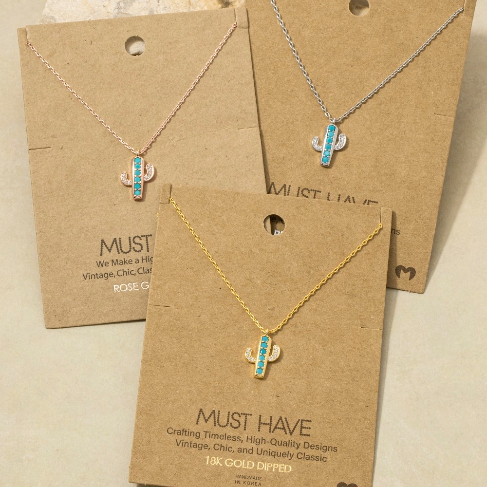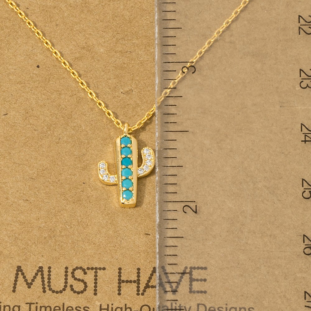 • The perfect way to complete any outfit, this pendant necklace brings a one-of-a-kind gold dipped turquoise and cubic zirconia cactus design. The perfect way to complete any outfit, whether you're dressing up or keeping it casual. Available in G, R, S. This item is sold in packs of 1.