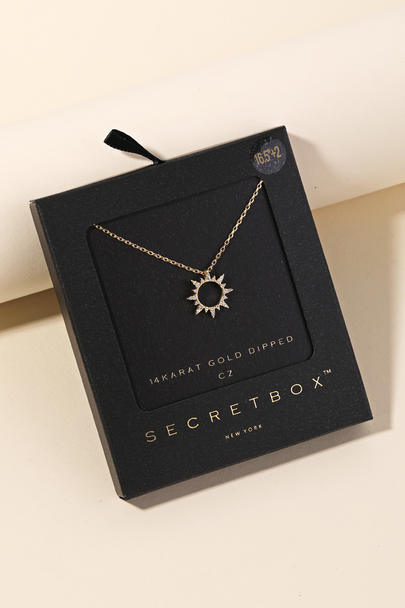 - This charming classy chic trending new must have necklace that is designed with a secret box pave circle sun charm necklace design. A perfect gift for the Spring season. Available in GD and WG. This item is sold in packs of 1.
