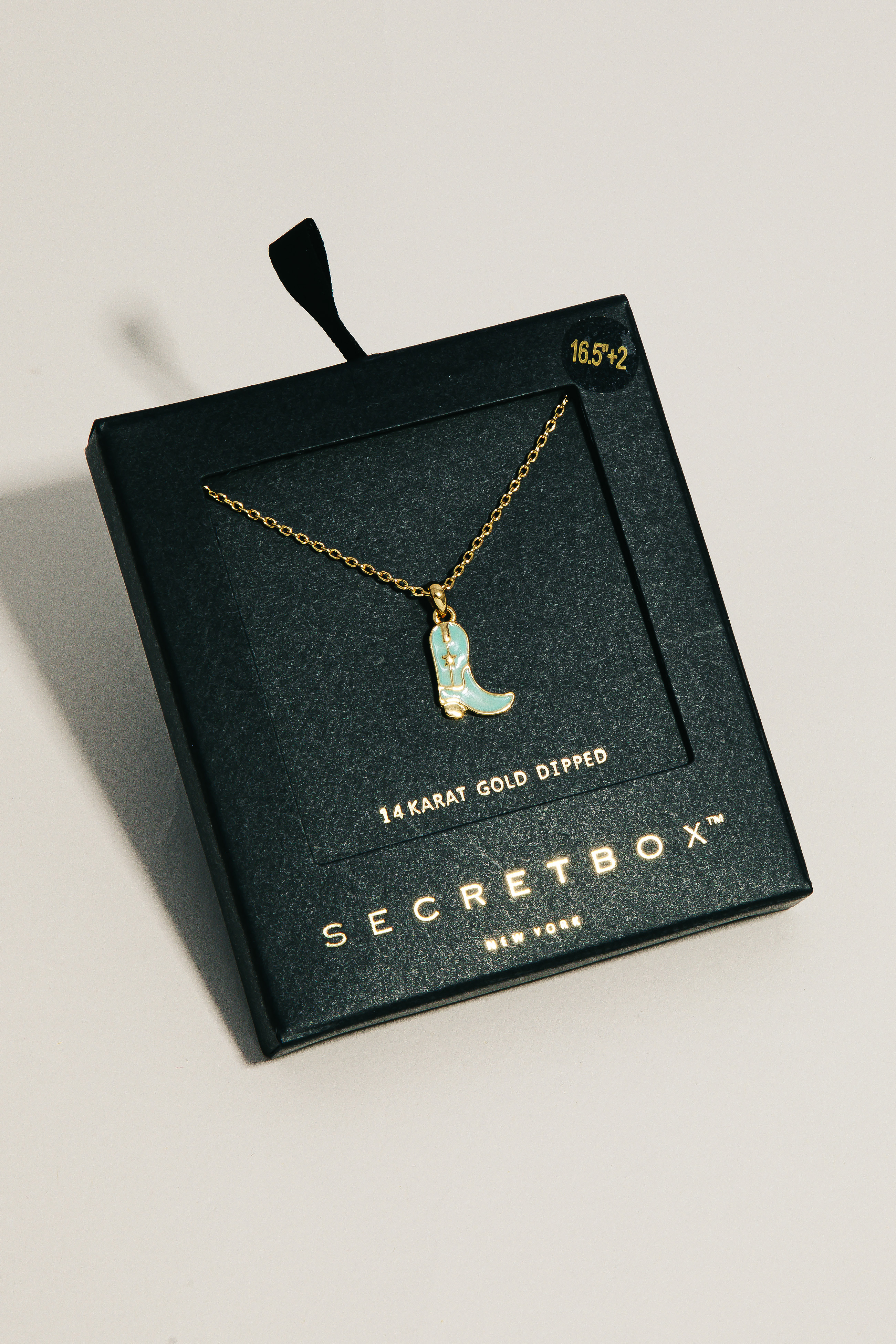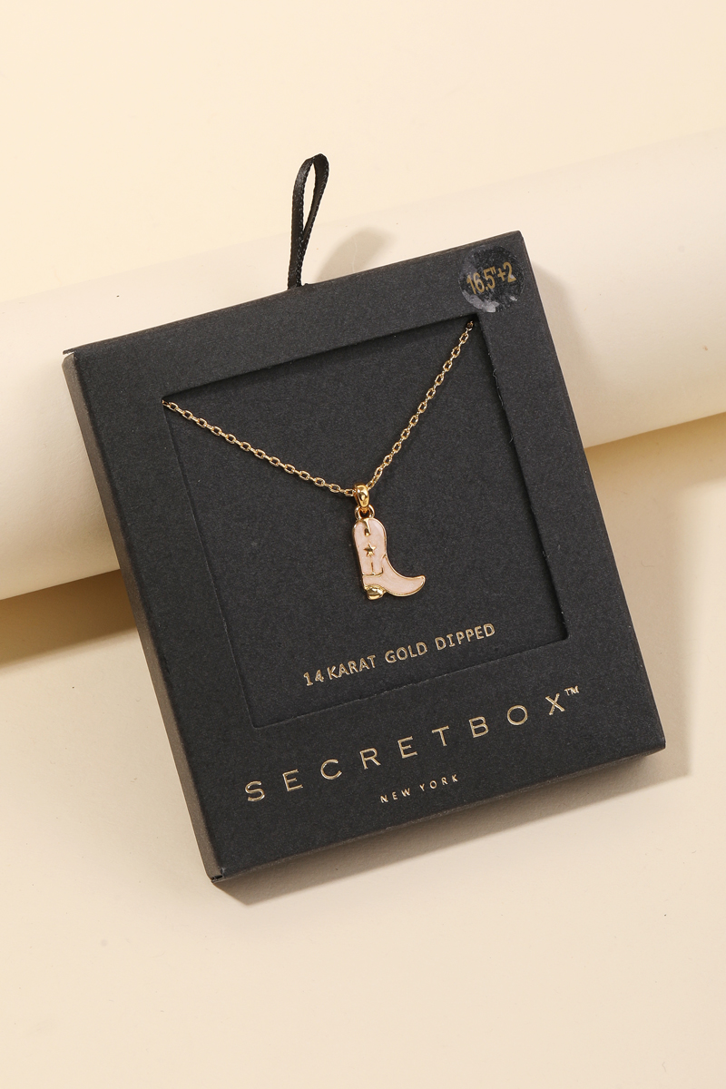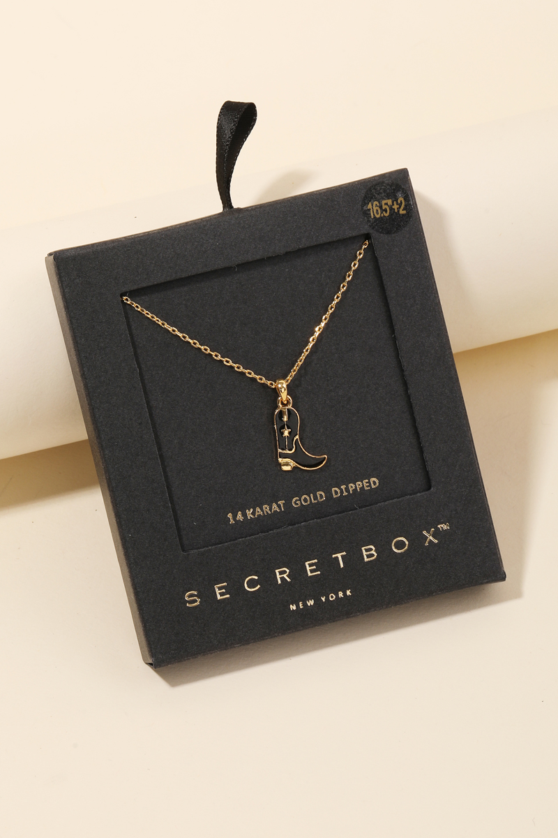 - Make a bold statement, this gold dipped necklace carries a charming secret box cowboy boot charm necklace design. A stylish gold dipped necklace that's perfect for complementing any outfit you wear. Available in BK, TQ, WH. This item is sold in packs of 1.