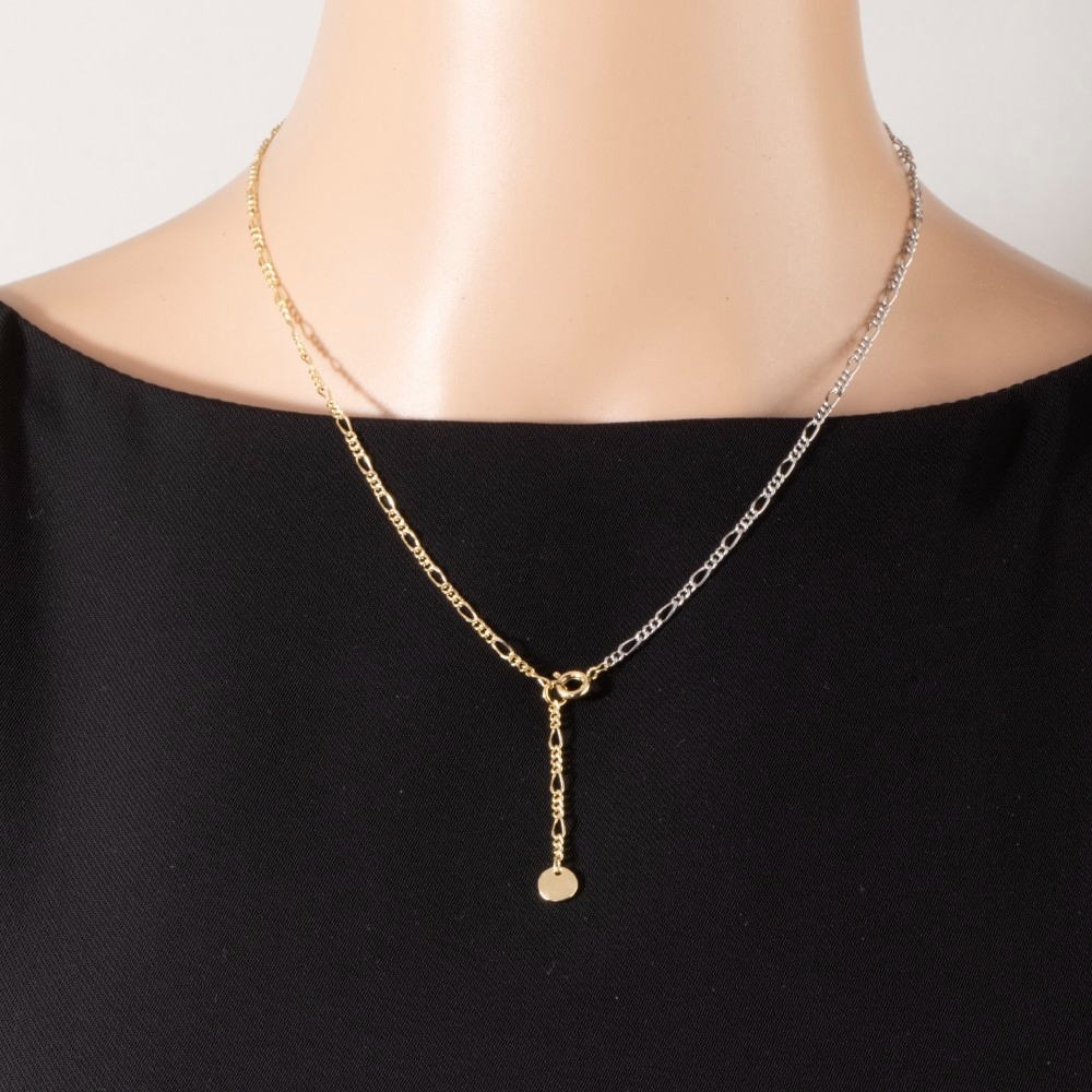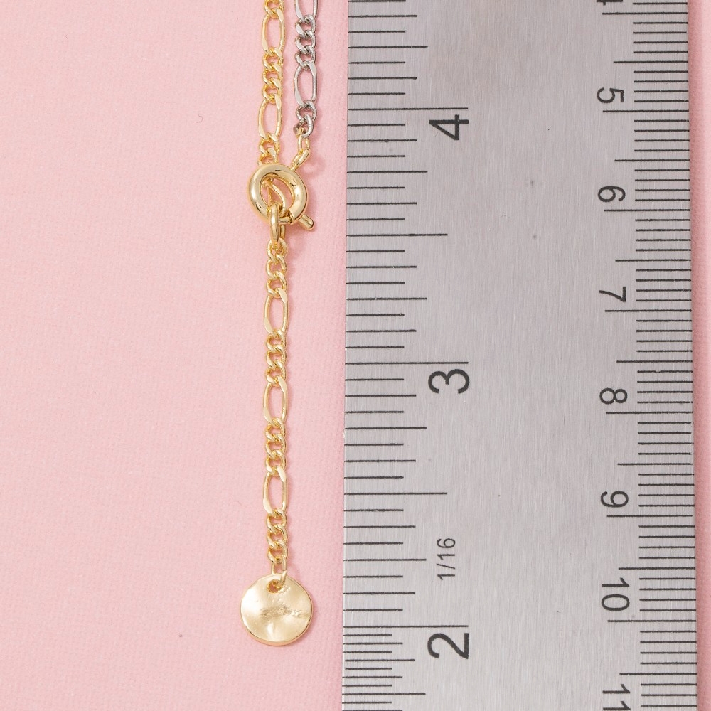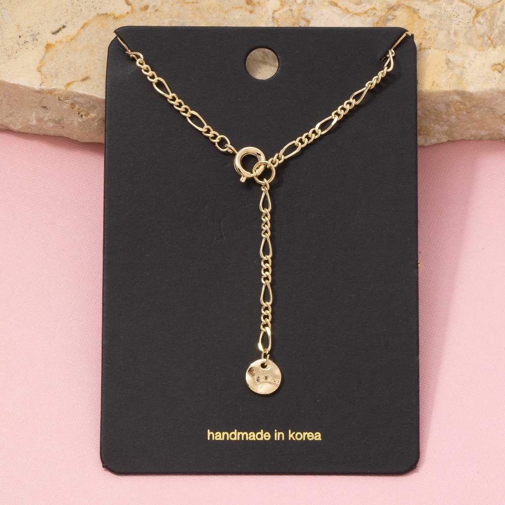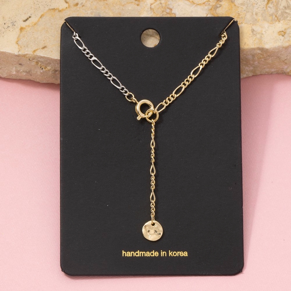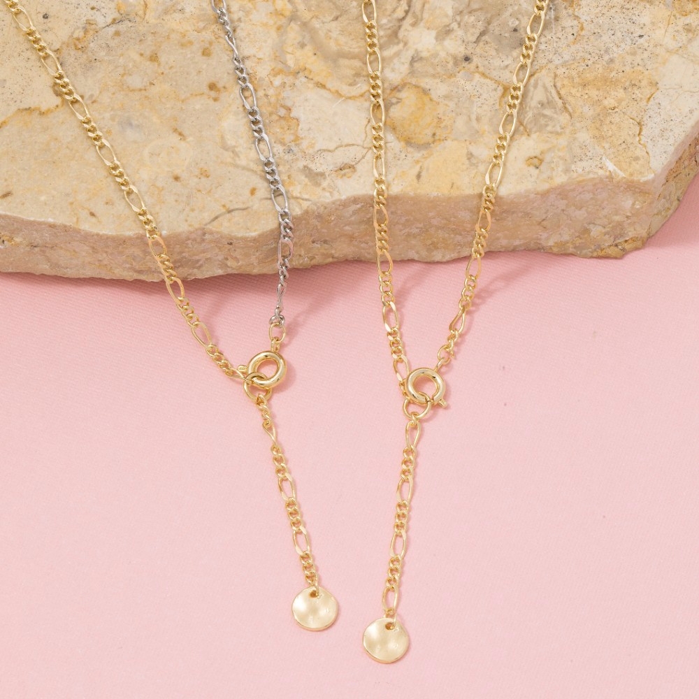 • Elevate any look, this necklace emanates an elegant gold figaro chain coin drop lariat design. Embrace fashion flexibility with this versatile necklace, designed to effortlessly enhance the sophistication of any outfit. Available in G, TT. This item is sold in packs of 1.