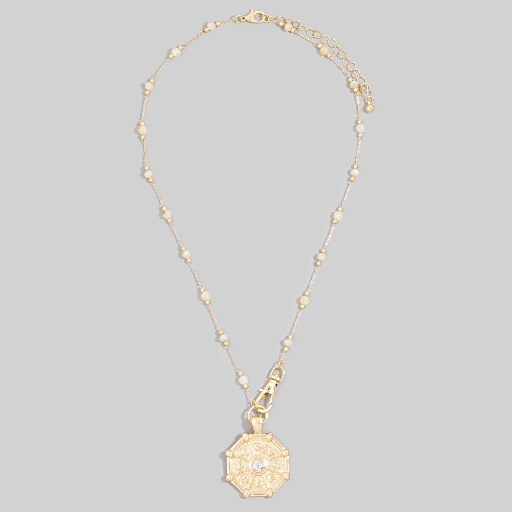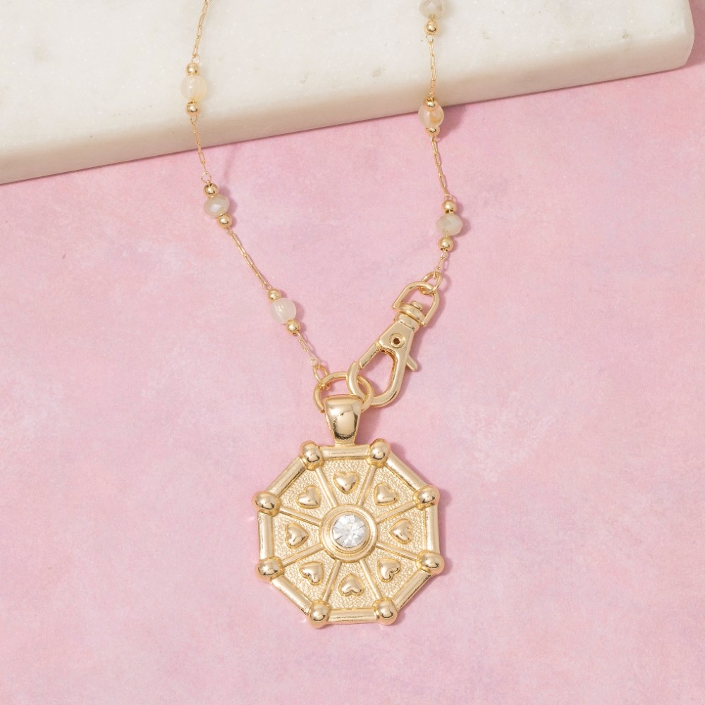 • Elevate your style with something unique and daring, this chain necklace contains a special hearts and gem stud coin pendant station bead design. This chain necklace is the perfect finishing touch to any outfit, adding a touch of sophistication and glamour. This item is sold in packs of 1.