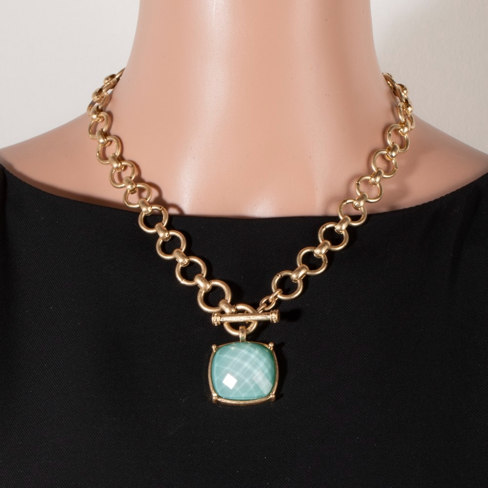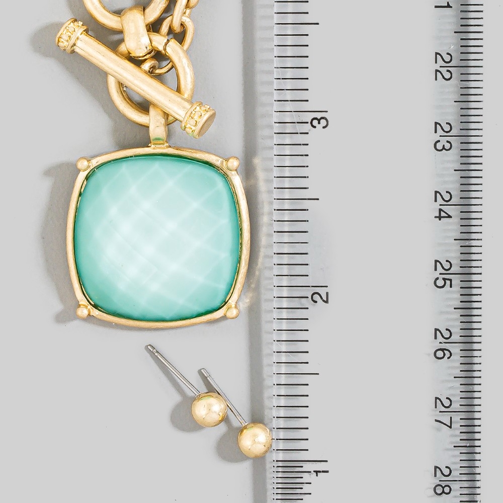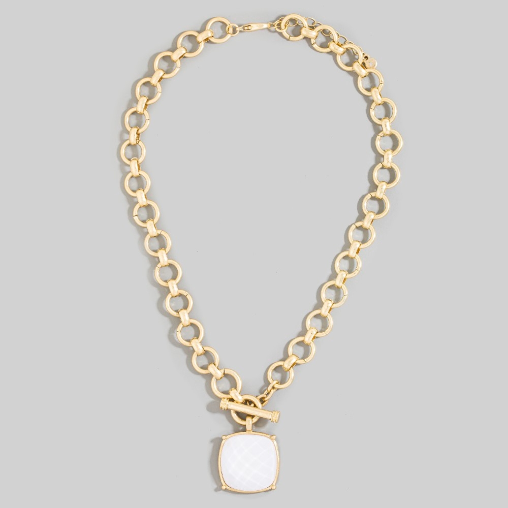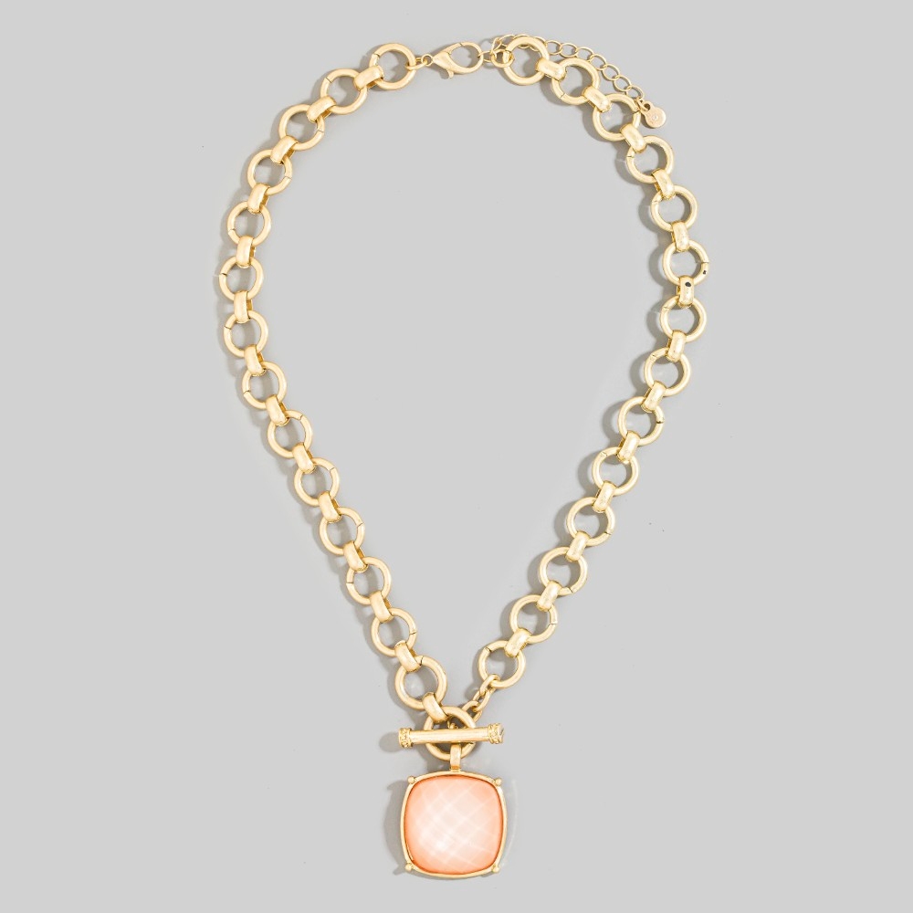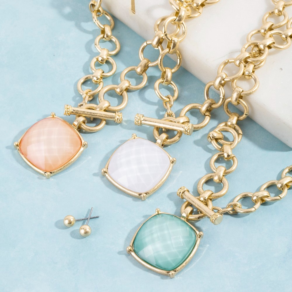 Effortlessly chic and always on-trend, this chain necklace introduces an exceptional large square faceted stone pendant toggle design. A stylish chain necklace that's perfect for complementing your favorite outfit. Available in MNT, SNOW, APRC and BK. This item is sold in packs of 12.