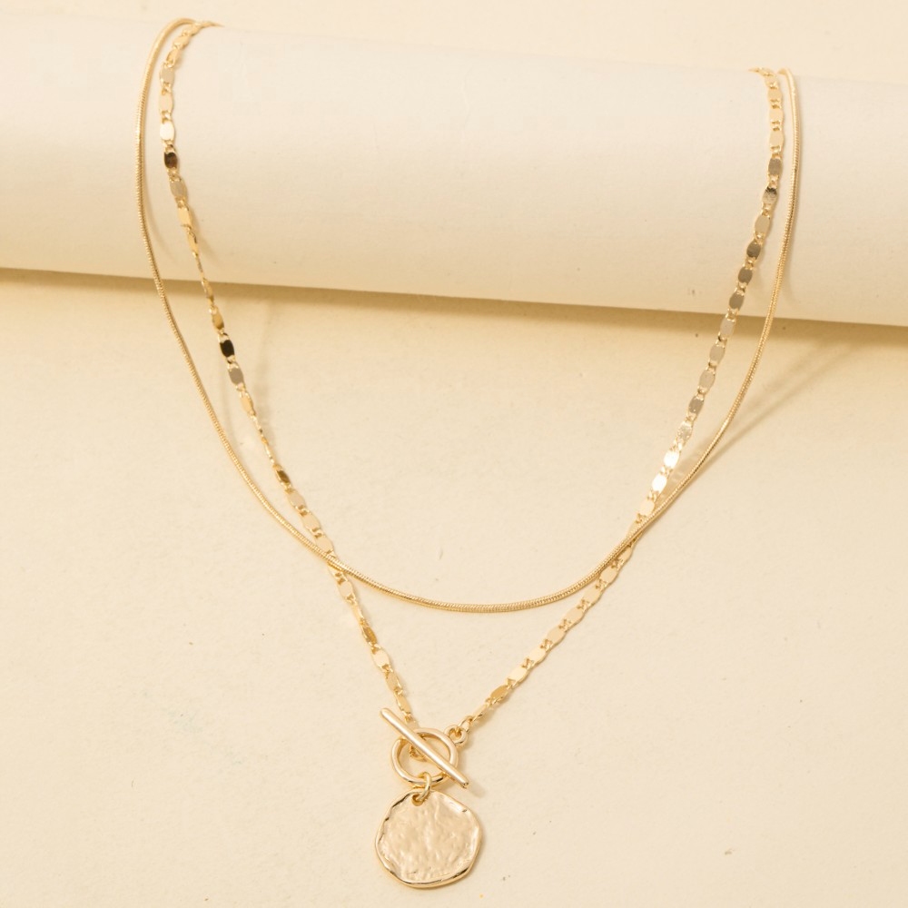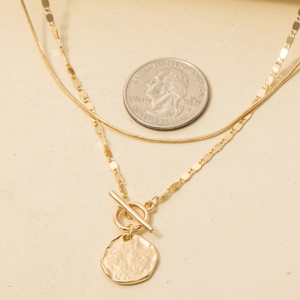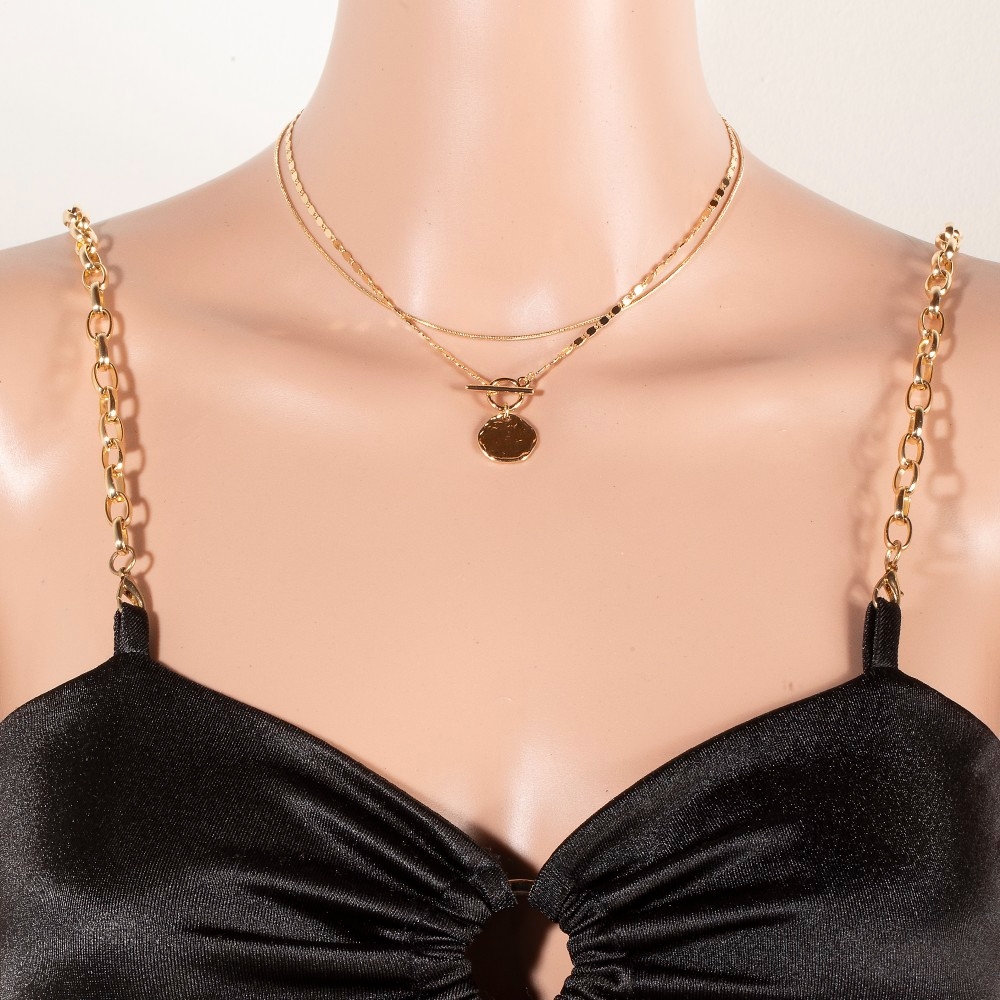 Chic, sophisticated, and always in style, this layered necklace reveals an intricate coin pendant toggle chain design. Unlock endless styling possibilities with this versatile layered necklace, creating a signature look that speaks volumes. Available in GD. This item is sold in packs of 1.