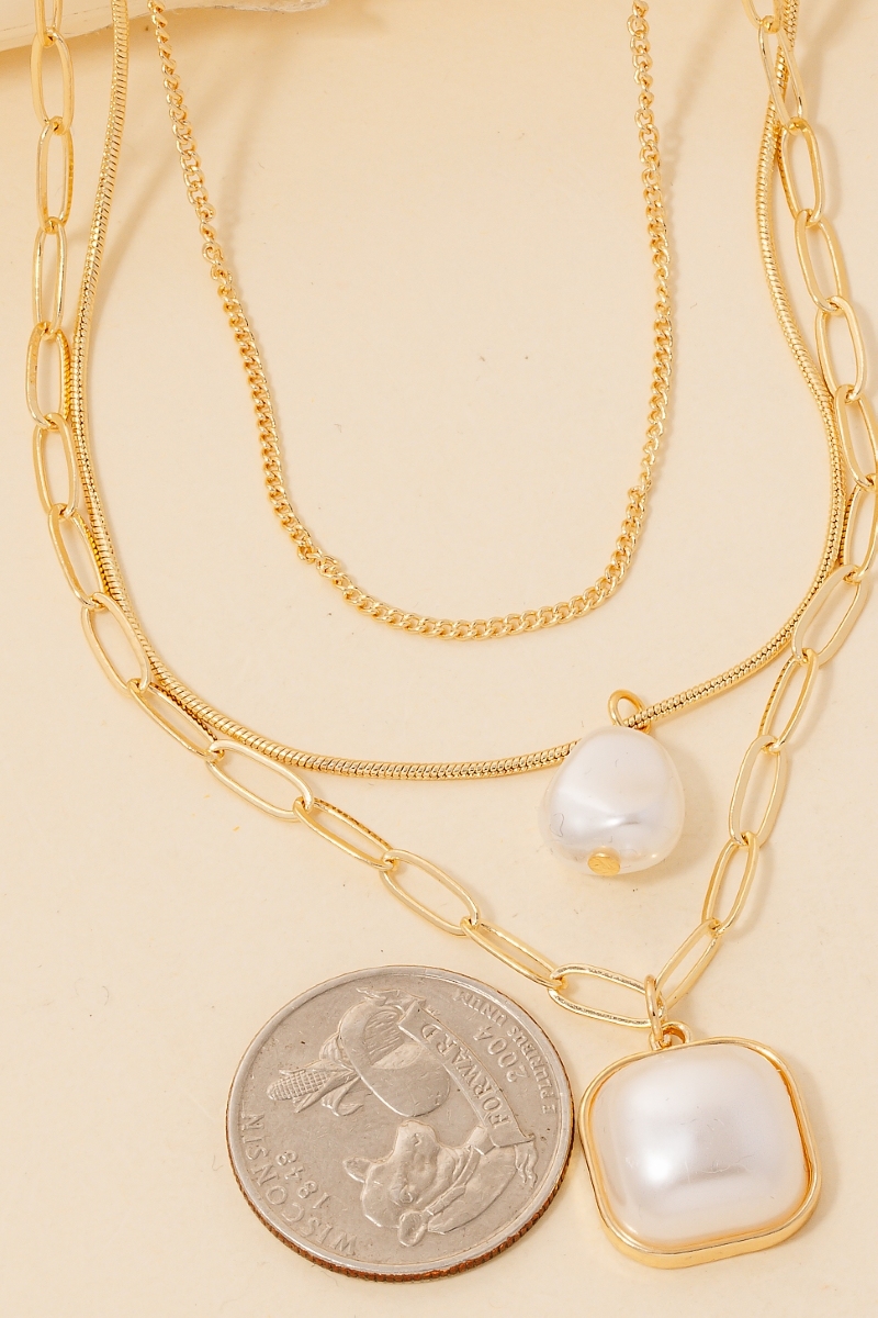 Double Pearl Pendant Layered Chains Necklace