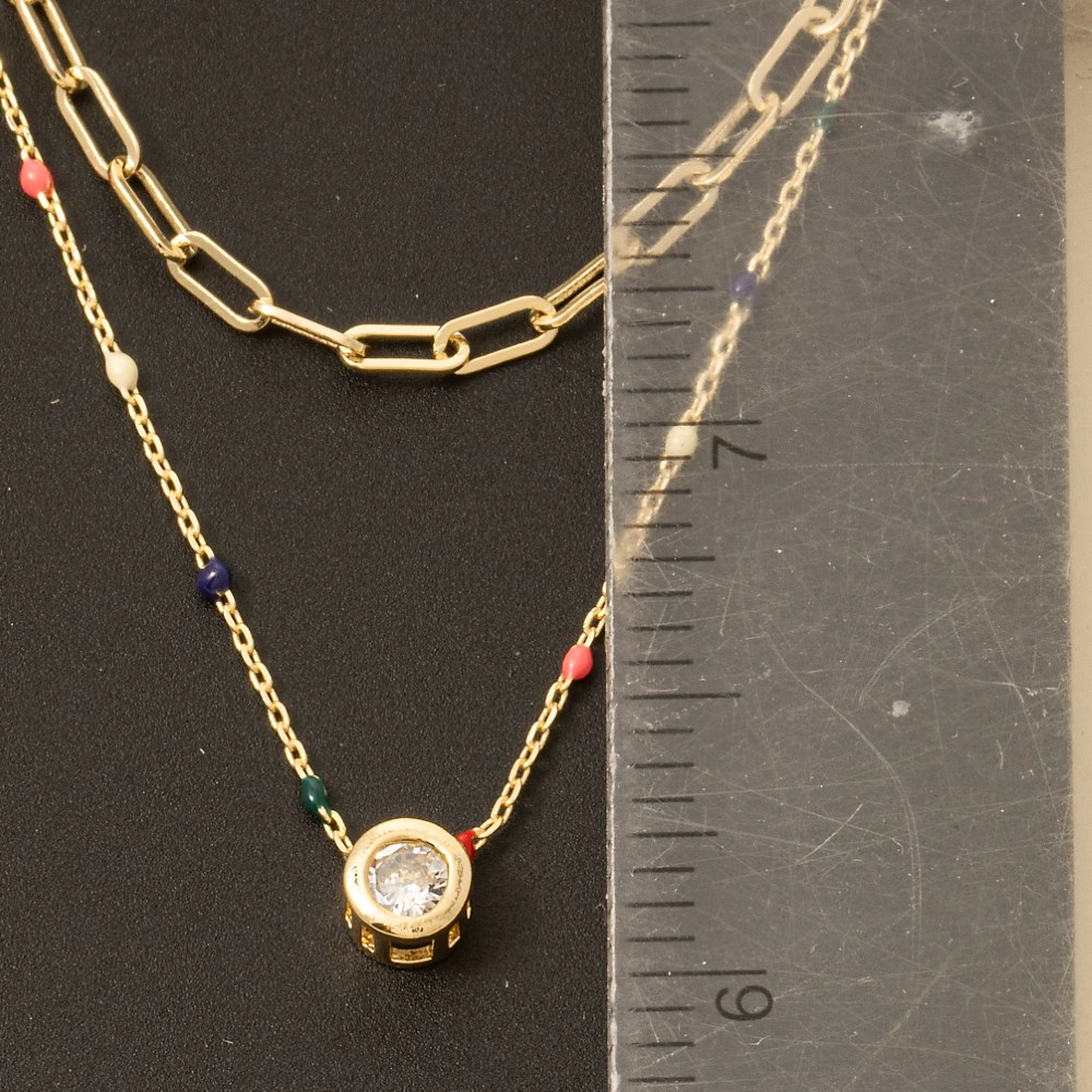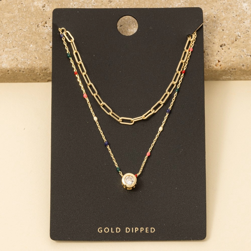 Chic, sophisticated, and always in style, this layered necklace boasts a magnificent gold dipped multi enamel drops cubic zirconia pendant design. Achieve a perfect blend of style and sophistication with this versatile layered necklace, a fashion-forward choice for any occasion. Available in GOLD. This item is sold in packs of 1.