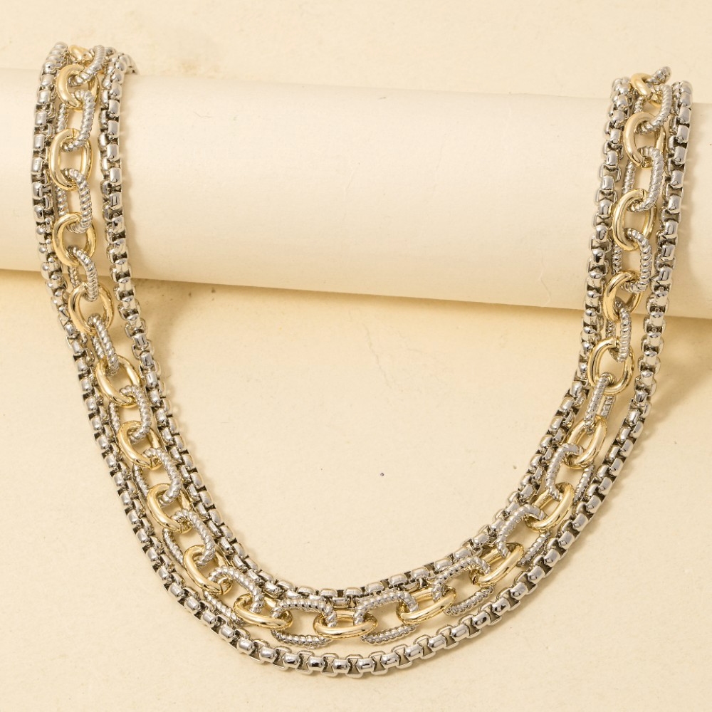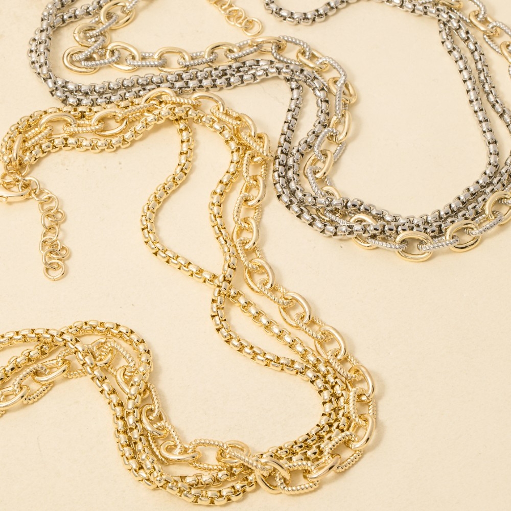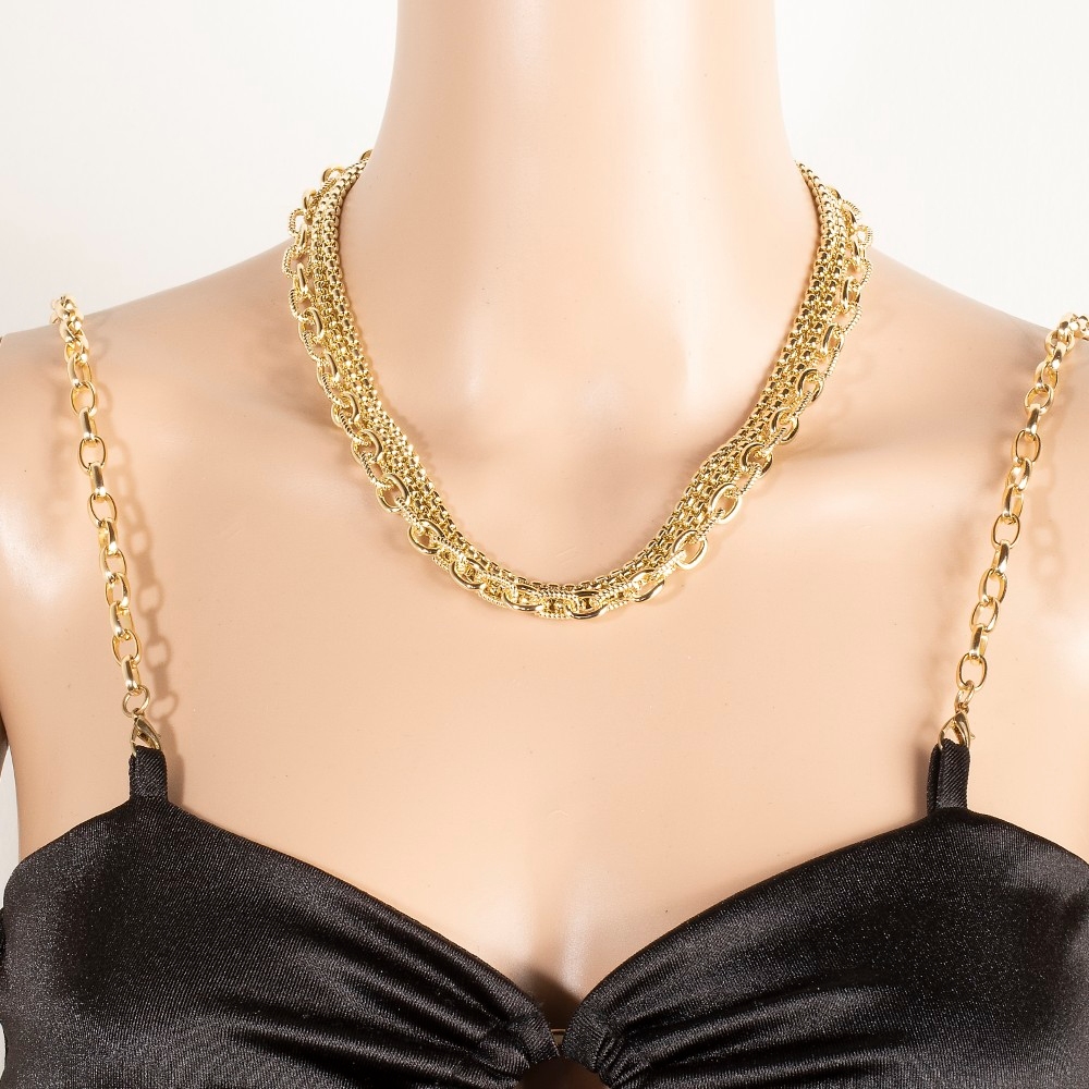 • This season's hottest necklace, this necklace exudes a refined gold plated assorted layered chains design. This necklace is an effortless way to add some personality to your outfit. Available in GD. This item is sold in packs of 1.