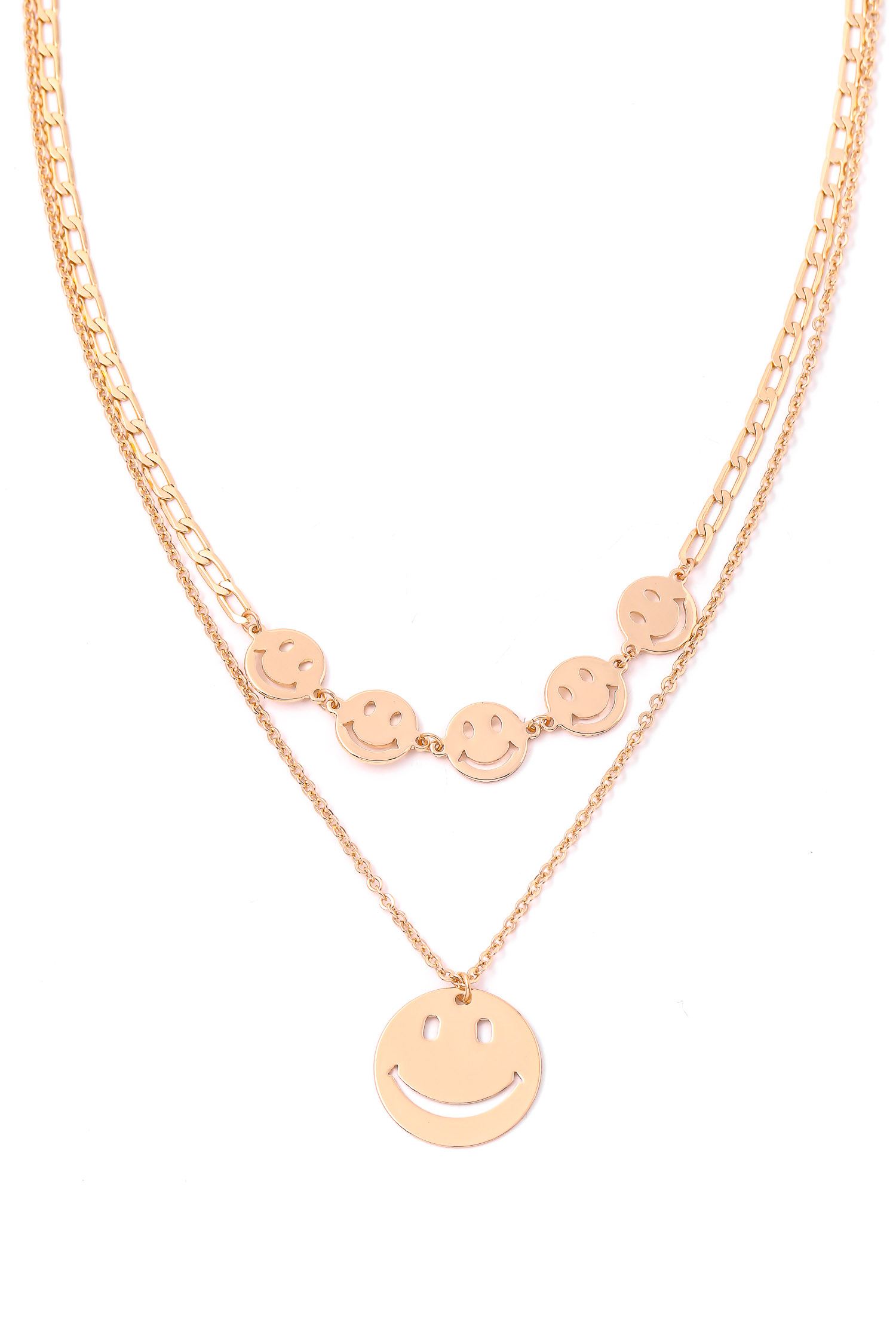 • This very stunning, classy, unique, trending and an absolute must have in season necklace features a unique layered smiley disk chain necklace design. Fits well with almost any outfit! Available in G, S