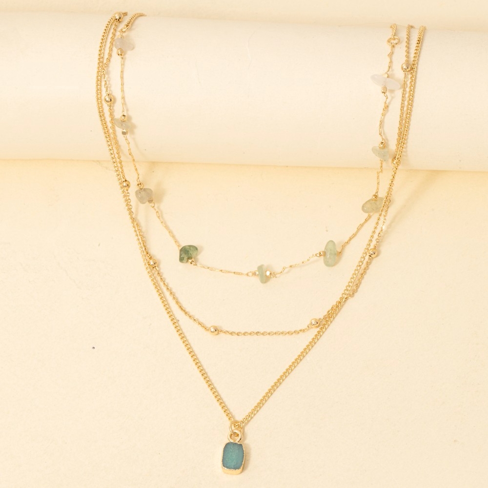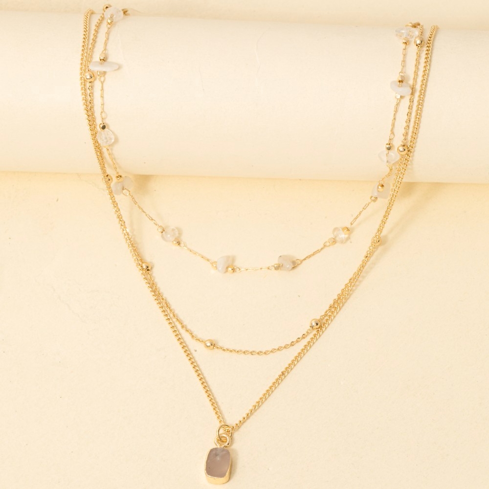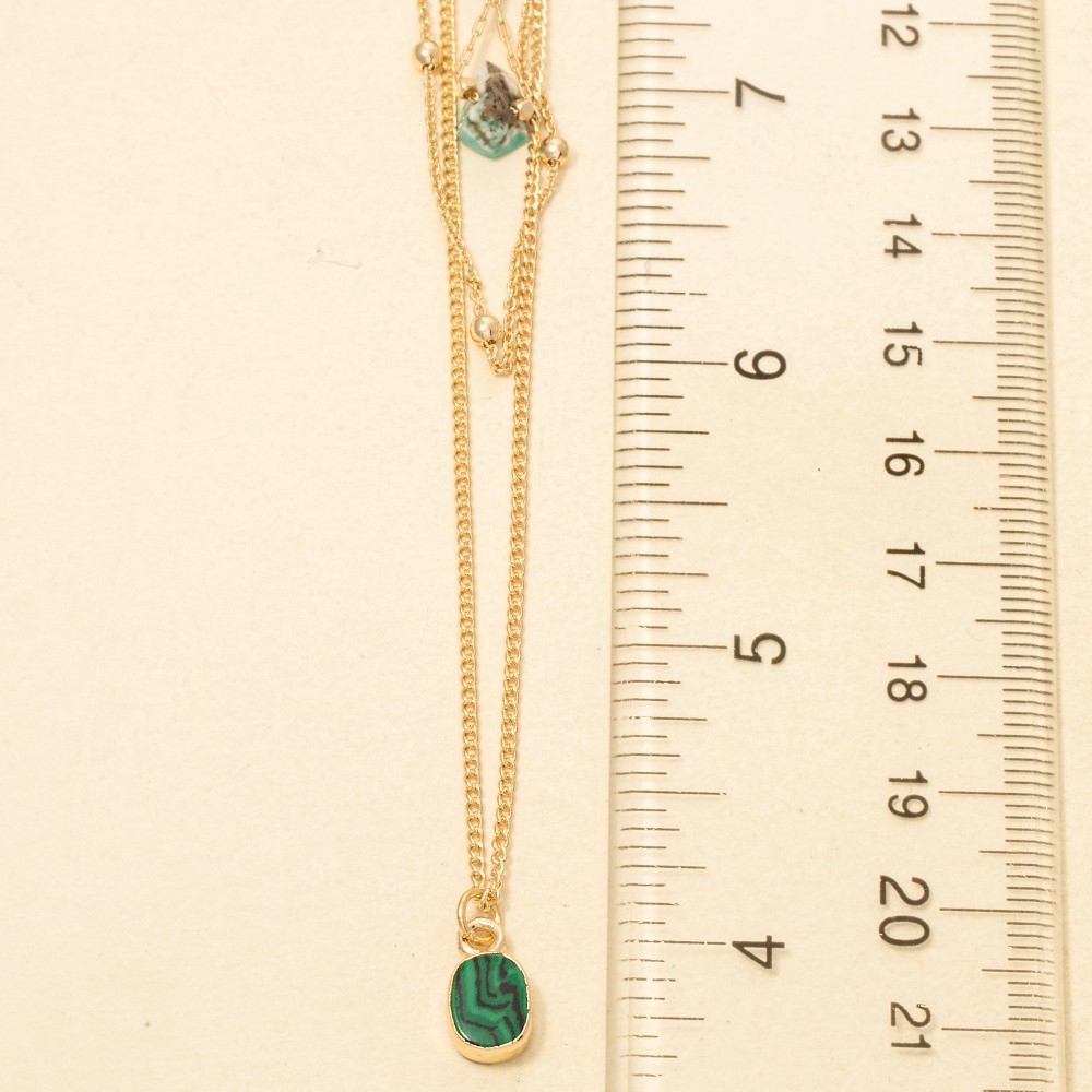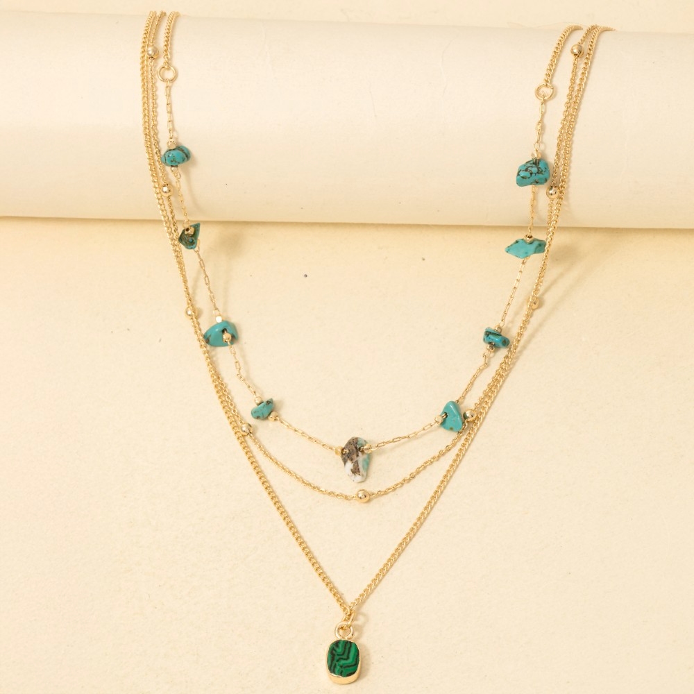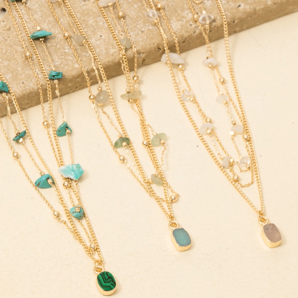 Chic, sophisticated, and always in style, this necklace exudes a refined mixed chip stones and pendant layered chains design. This item is perfect for adding some color and vibrancy to any outfit. Available in AMA, TUR, WHT. This item is sold in packs of 1.