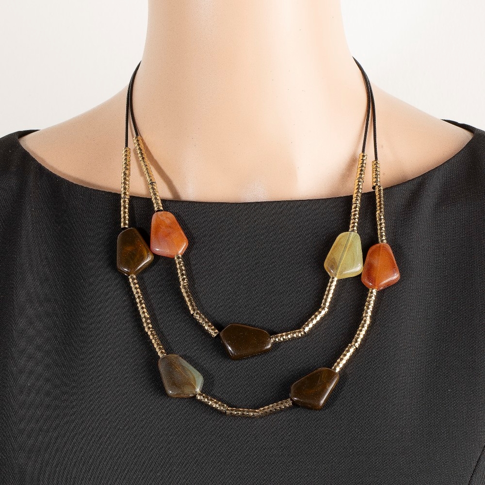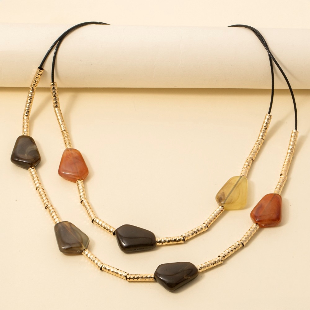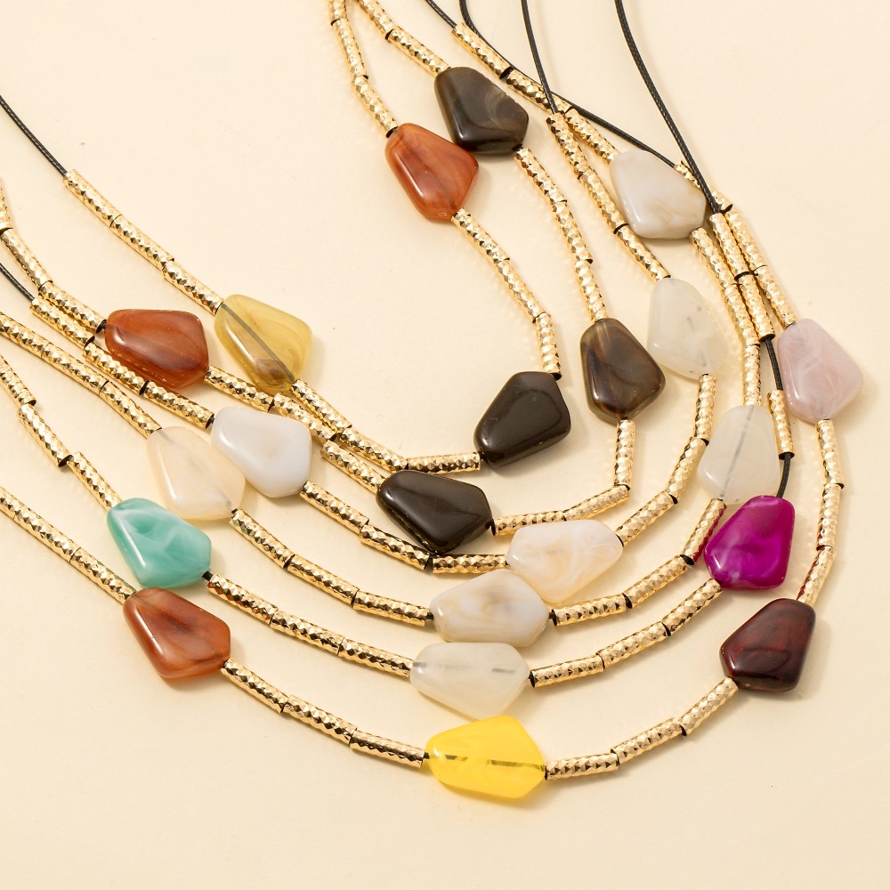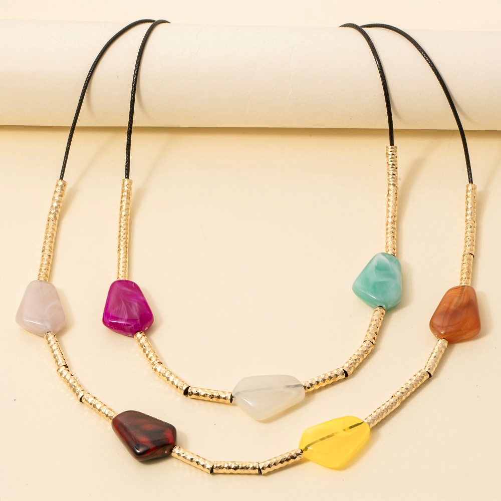 - This piece is designed to make a statement, this layered necklace encompasses a grand resin stone charms design. This item is perfect for adding some color and vibrancy to any outfit. Available in BR, IV, MU. This item is sold in packs of 1.