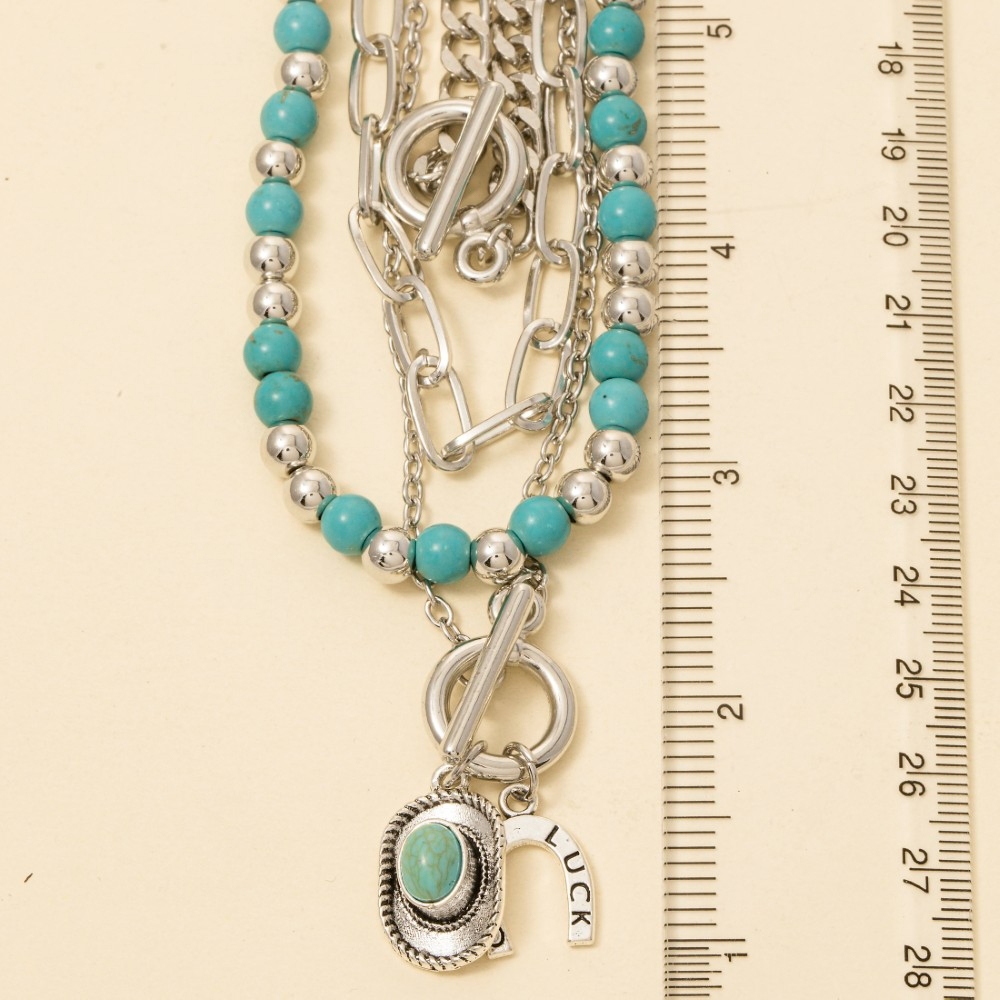 - Stay on-trend and stand out from the crowd, this layered necklace encompasses a grand western charms turquoise and metallic beads design. This layered necklace is ideal for both casual and formal events, adding a touch of sophistication to any outfit. Available in S. This item is sold in packs of 1.