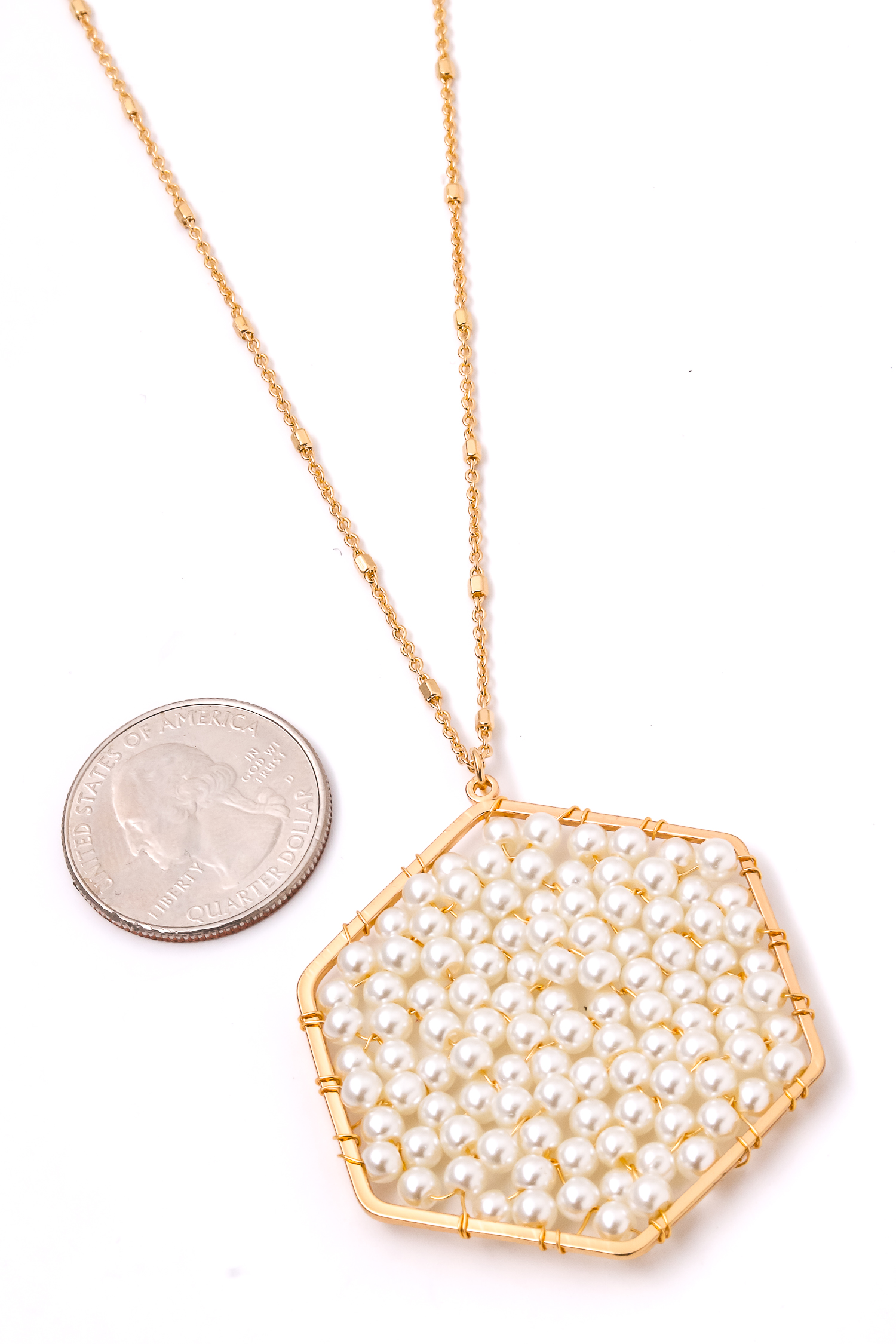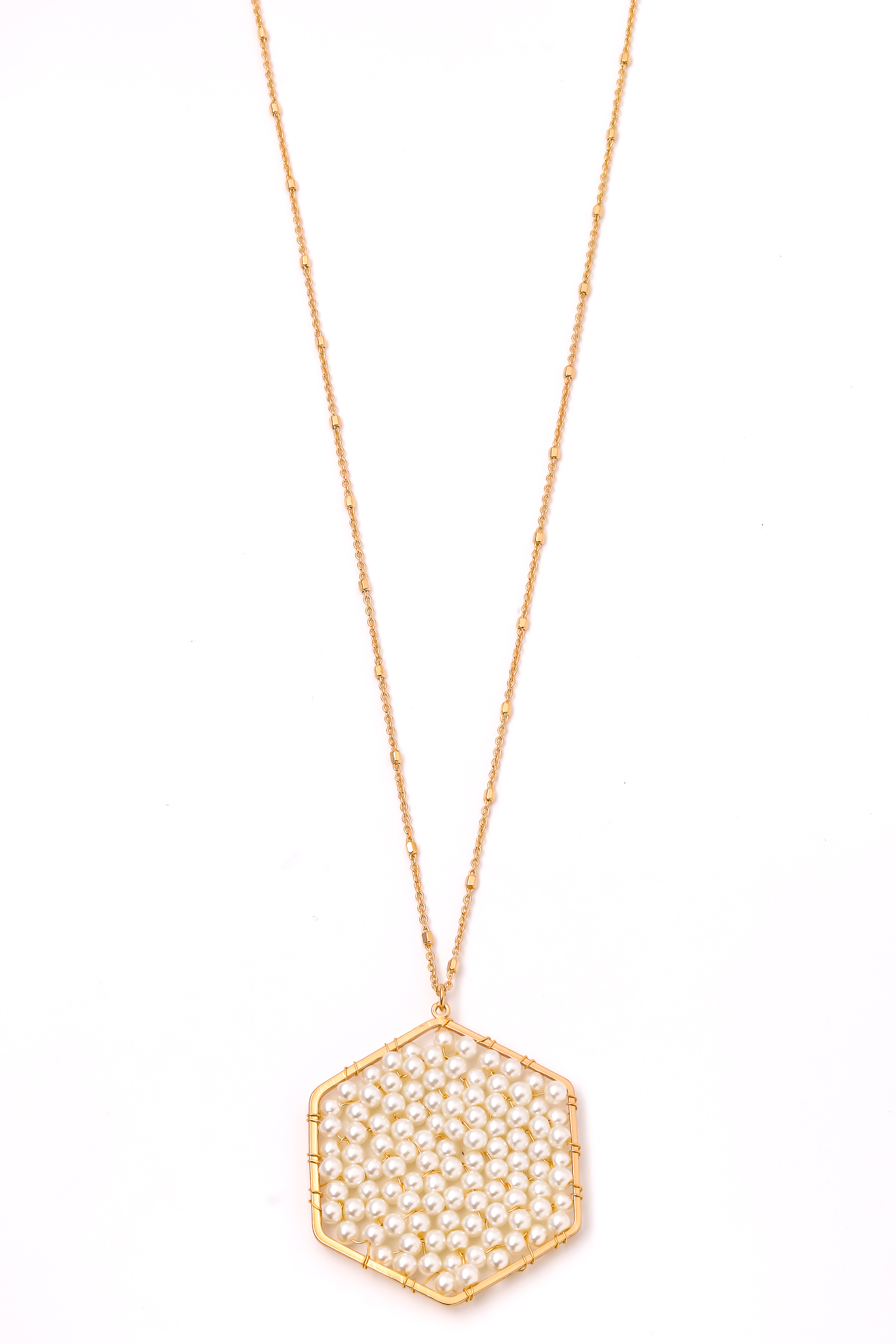 • Classy, Flashy, and everything in between must have necklace that has a pearly bead hexagon pendant necklace design. An excellent choice for casual to formal occasions, goes perfectly with business formal work office suits blazer and dresses office attire. Available in Gold and Silver.