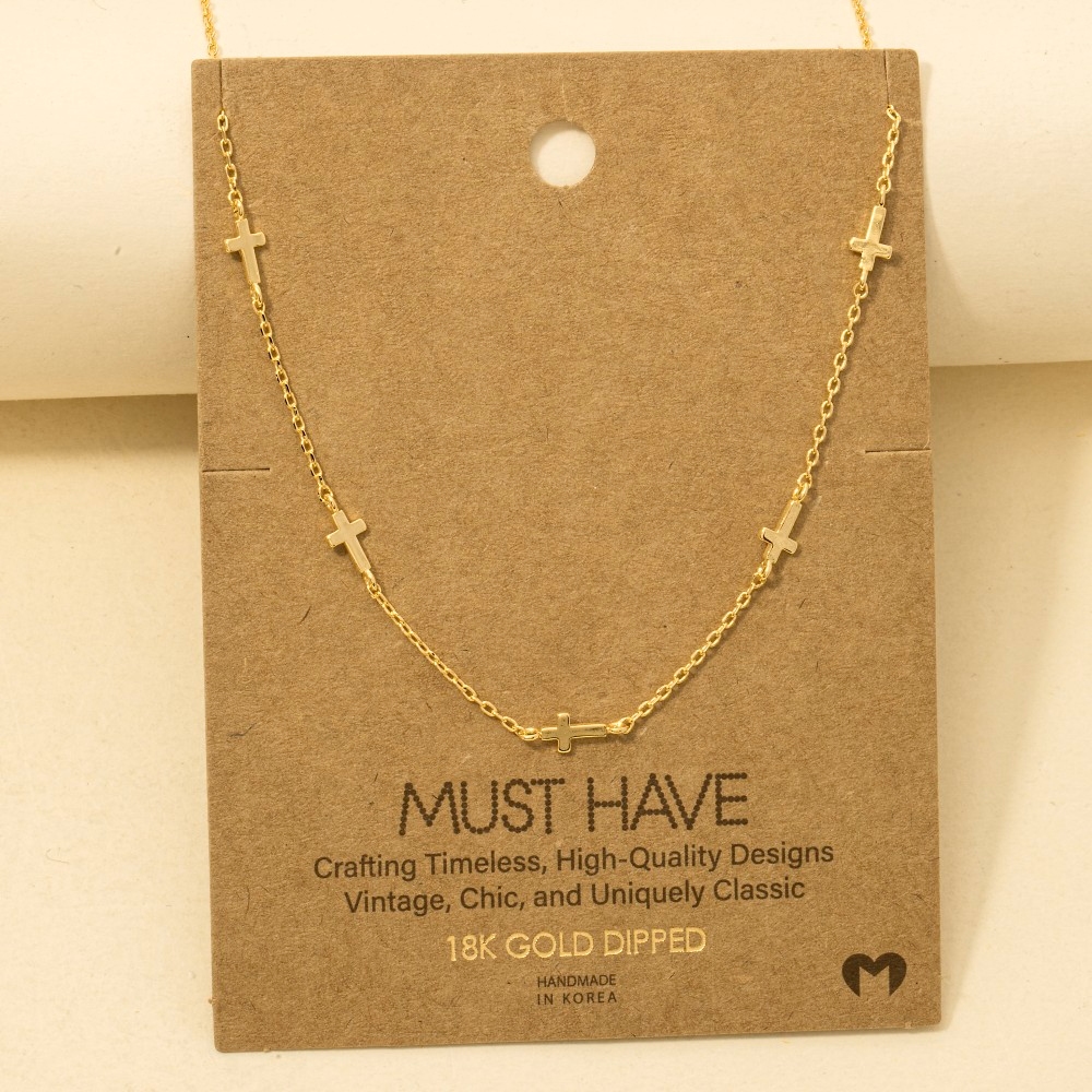 • This piece is the epitome of sophistication and elegance, this trending necklace shows off a distinctive gold dipped dainty cross station necklace design. This item is perfect for anyone who loves to accessorize and add some personality to their outfits. Available in G, S and R. This item is sold in packs of 12.