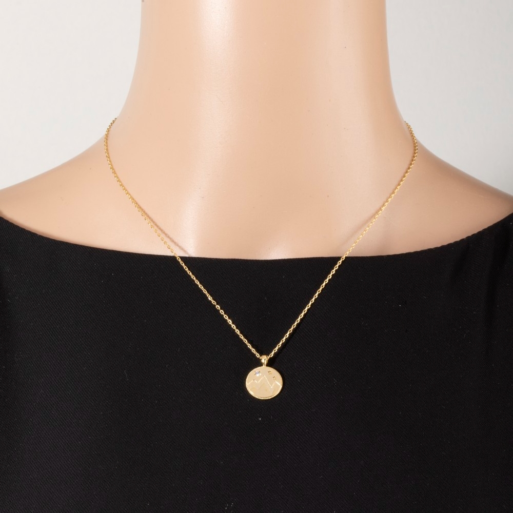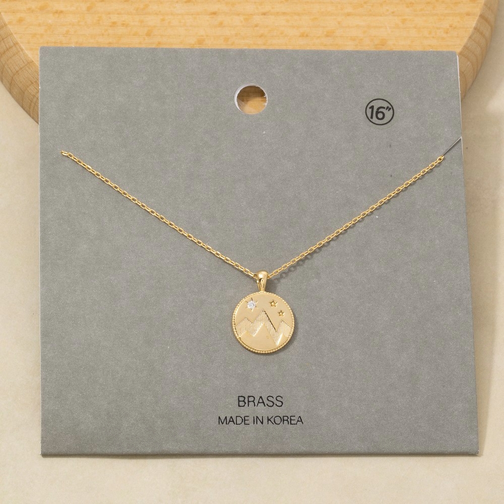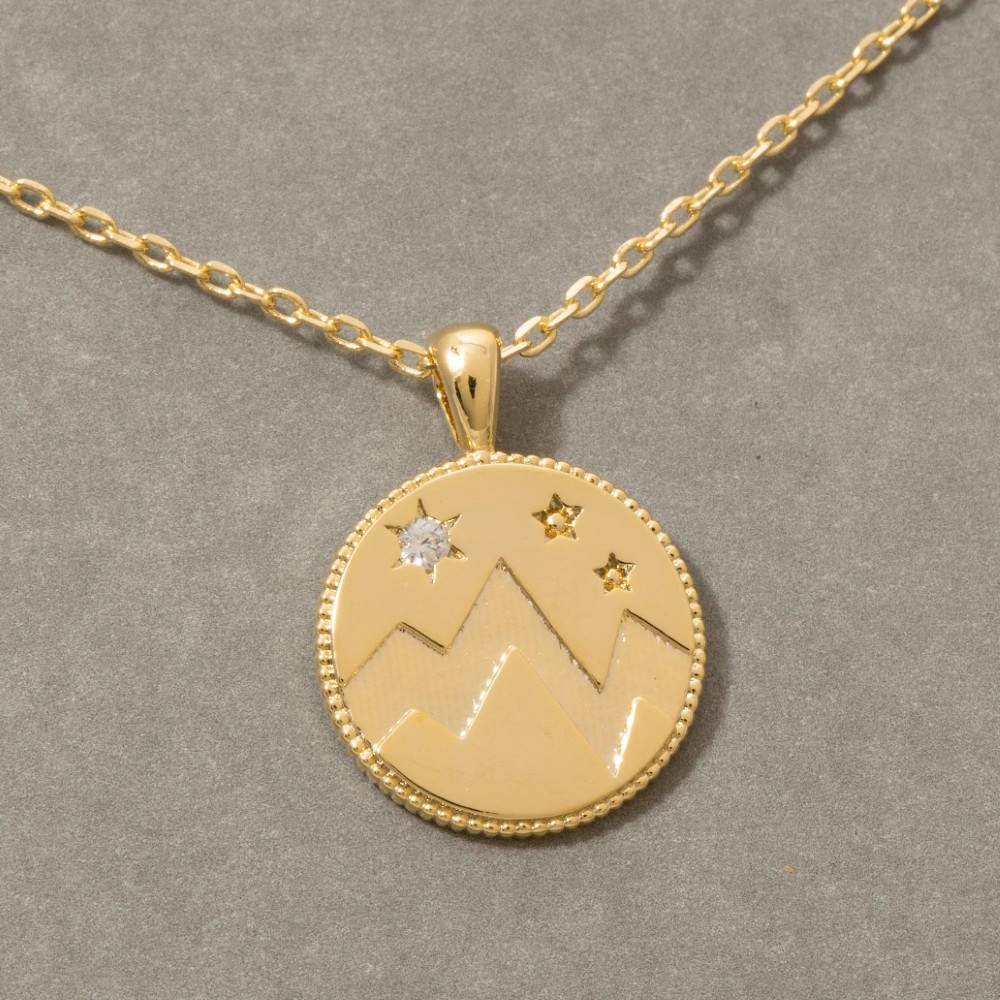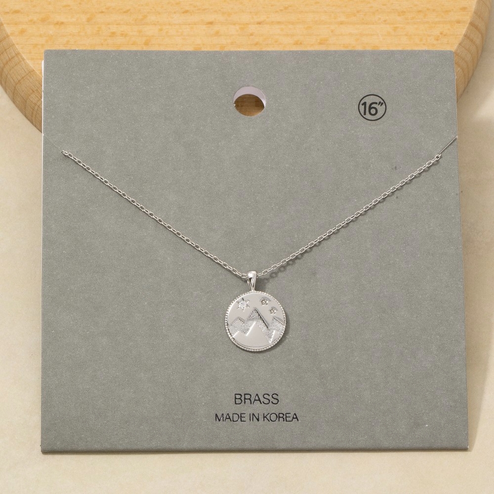This piece is perfect for those who want to showcase their unique style, this pendant necklace emanates an elegant mountain coin design. This item is perfect for adding some color and vibrancy to any outfit. Available in G,S. This item is sold in packs of 1.