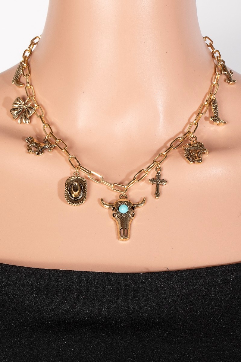 This piece is perfect for those who want to showcase their unique style, this necklace introduces an exceptional assorted western bull charm design. Elevate your outfit with this stylish necklace that's perfect for any occasion. Available in AGTUQ and ARTUQ. This item is sold in packs of 1.