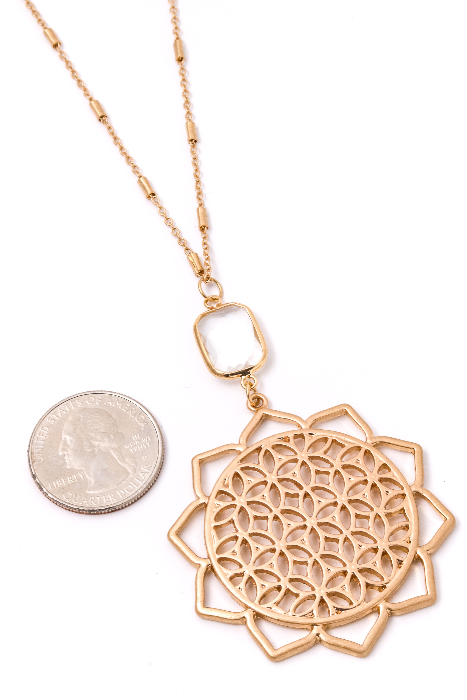 • An absolute must have necklace features a gorgeous filigree sun disc pendant necklace design. An excellent choice for any occasion! Available in Gold and Silver.