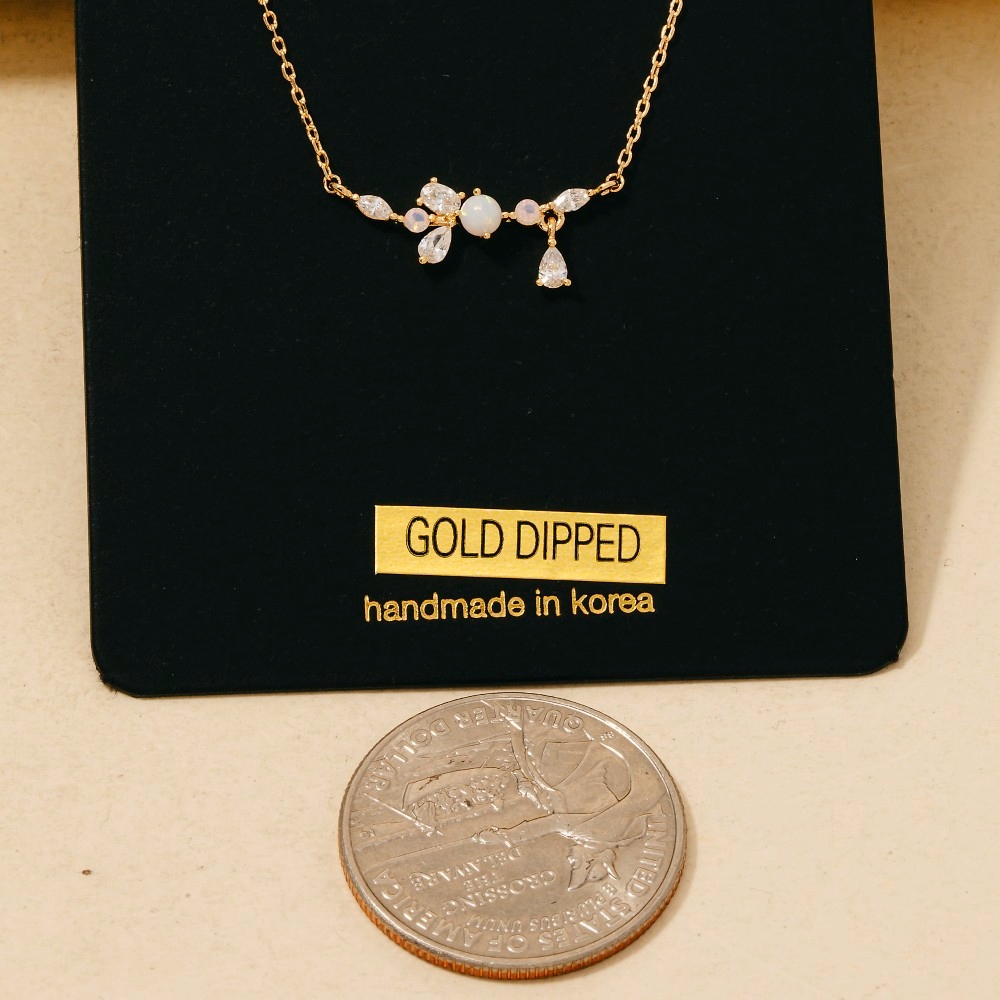 This necklace is made with 70% Brass and 30% Cubic Zirconia.