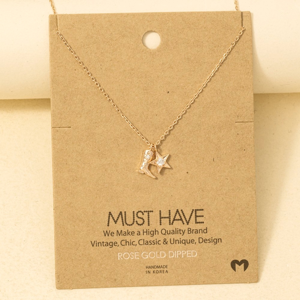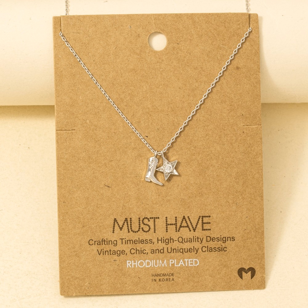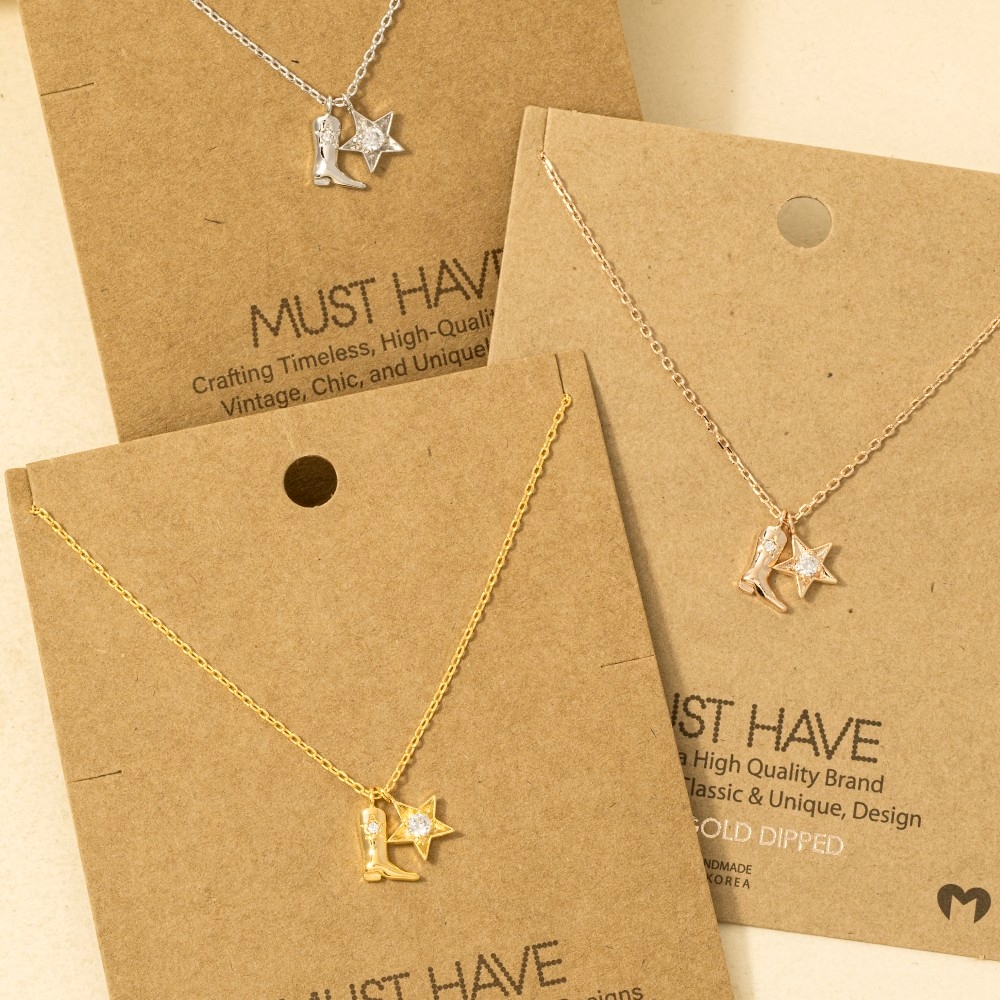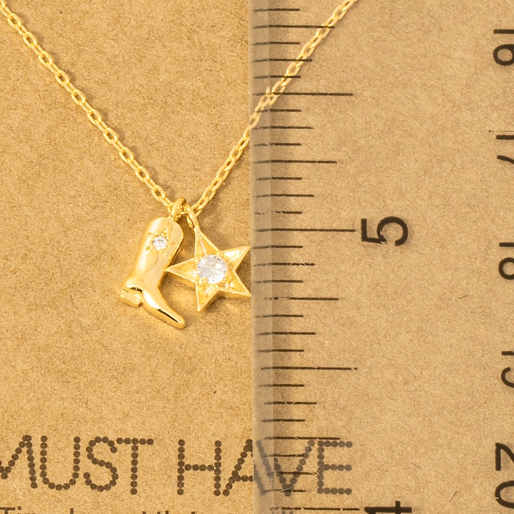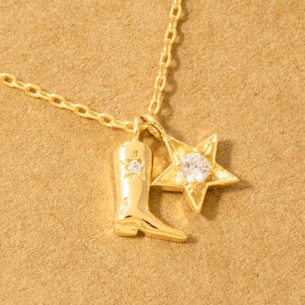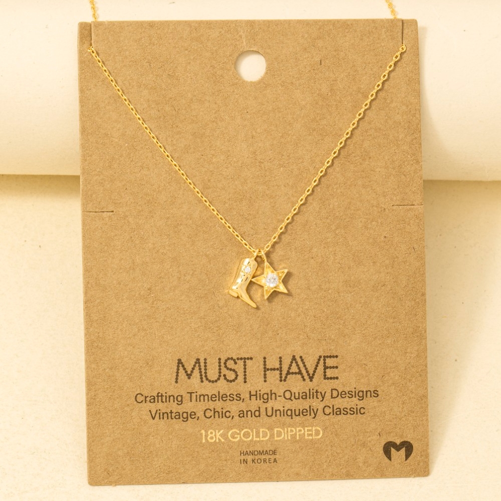 Perfectly versatile and endlessly stylish, this trending necklace comes with a special gold dipped cowboy boots star pendant necklace design. A must-have trending necklace for anyone who loves to add some flair to their outfits. Available in G. This item is sold in packs of 1.