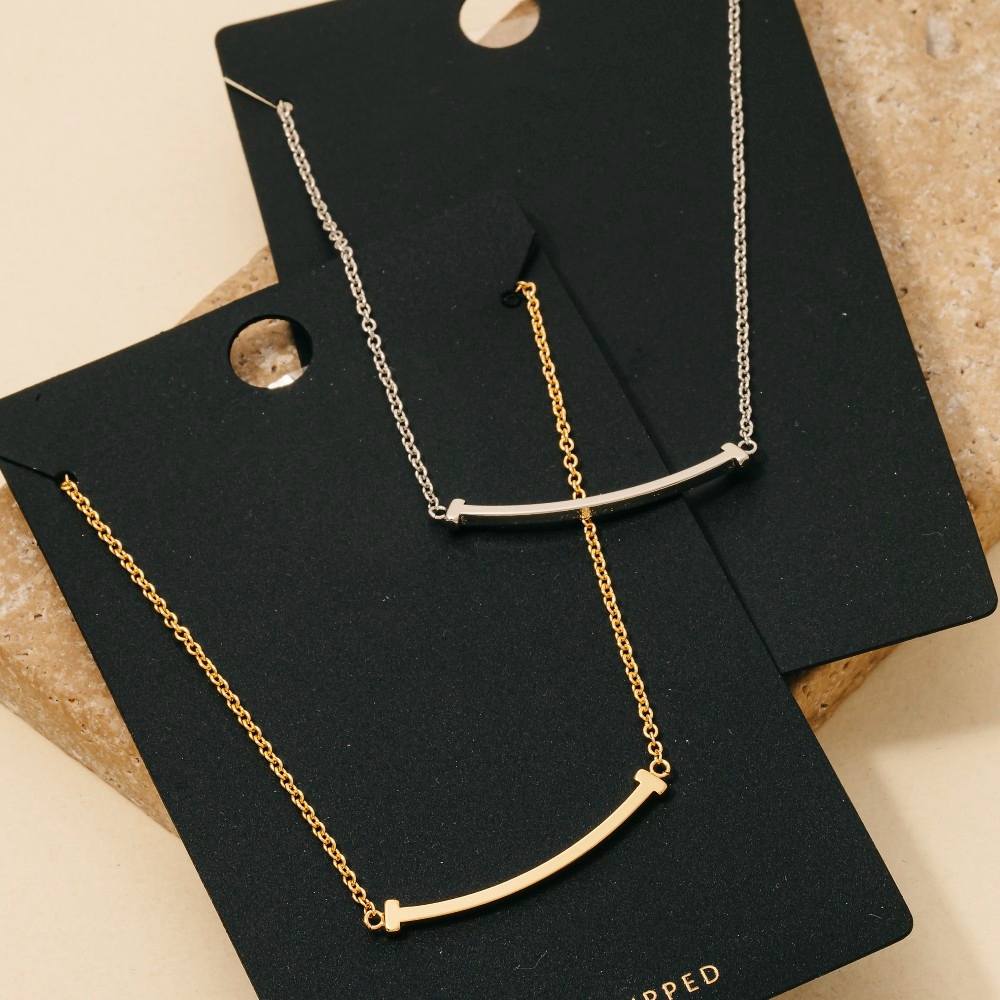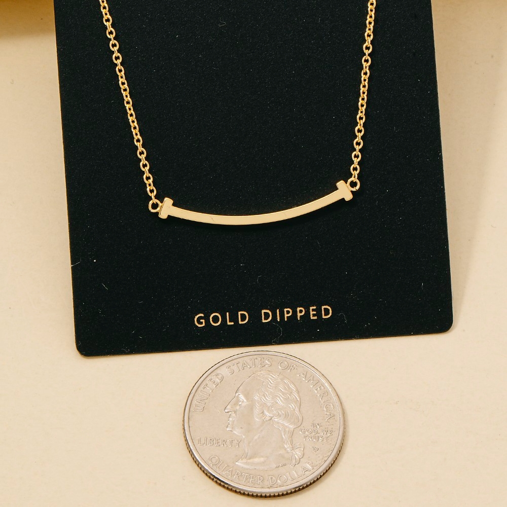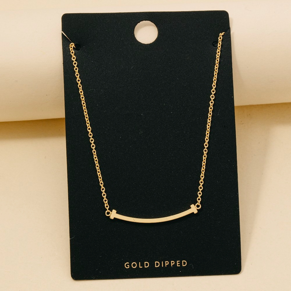 The perfect way to showcase your unique style, this columbus jewelry necklace exudes a refined gold dipped curved bar pendant design. Achieve a perfect blend of style and sophistication with this versatile necklace, a fashion-forward choice for any occasion. Available in GOLD,2SILVER. This item is sold in packs of 1.