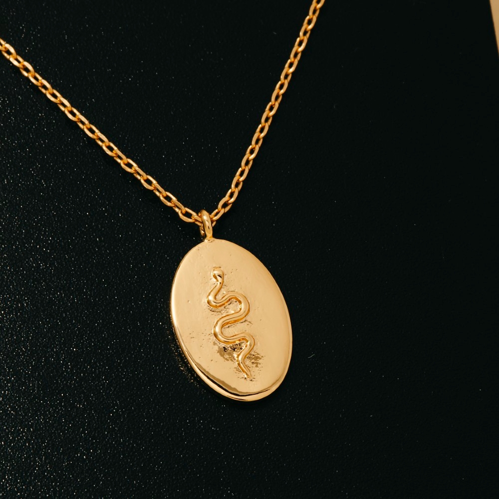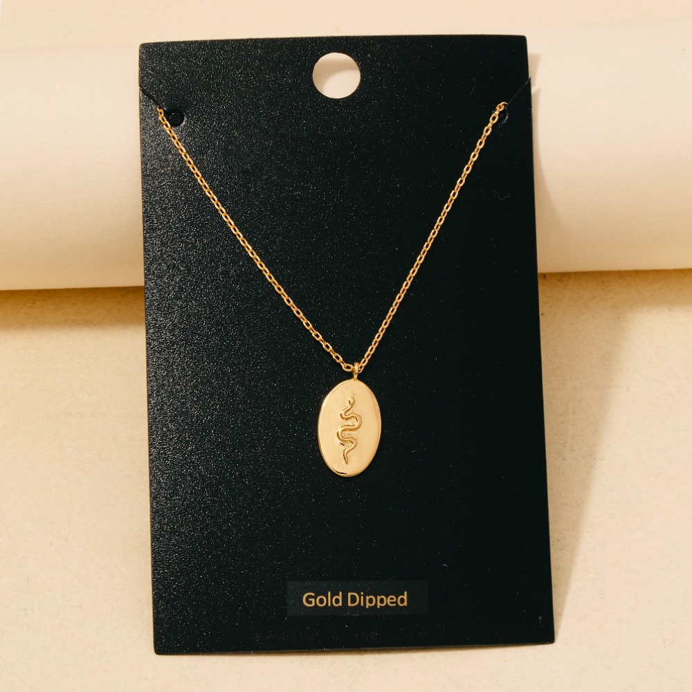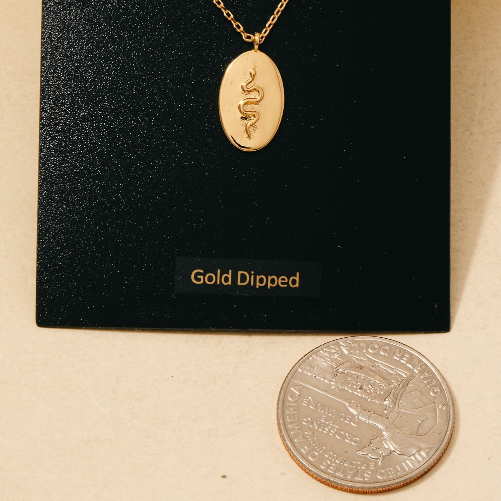 • A classic design with a contemporary twist, this necklace exudes a refined gold dipped snake oval coin pendant design. Upgrade your fashion game with this versatile necklace, a timeless addition that complements any outfit seamlessly. Available in GOLD. This item is sold in packs of 1. Columbus Jewelry